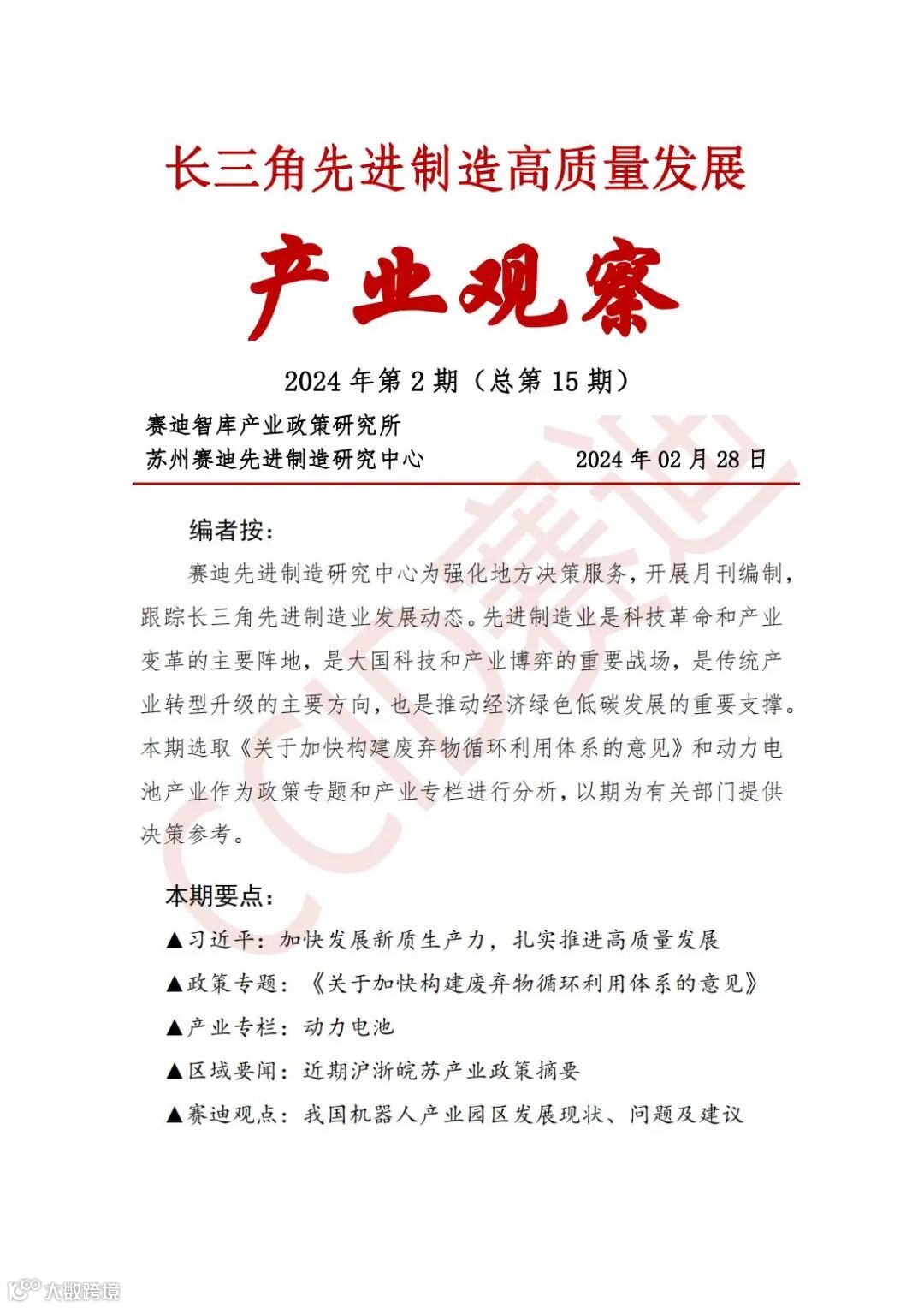 赛迪先进制造研究中心为强化地方决策服务,开展月刊编制,跟踪长三角先进制造业发展动态。先进制造业是科技革命和产业变革的主要阵地,是大国科技和产业博弈的重要战场,是传统产业转型升级的主要方向,也是推动经济绿色低碳发展的重要支撑。本期选取《关于加快构建废弃物循环利用体系的意见》和动力电池产业作为政策专题和产业专栏进行分析,以期为有关部门提供决策参考。