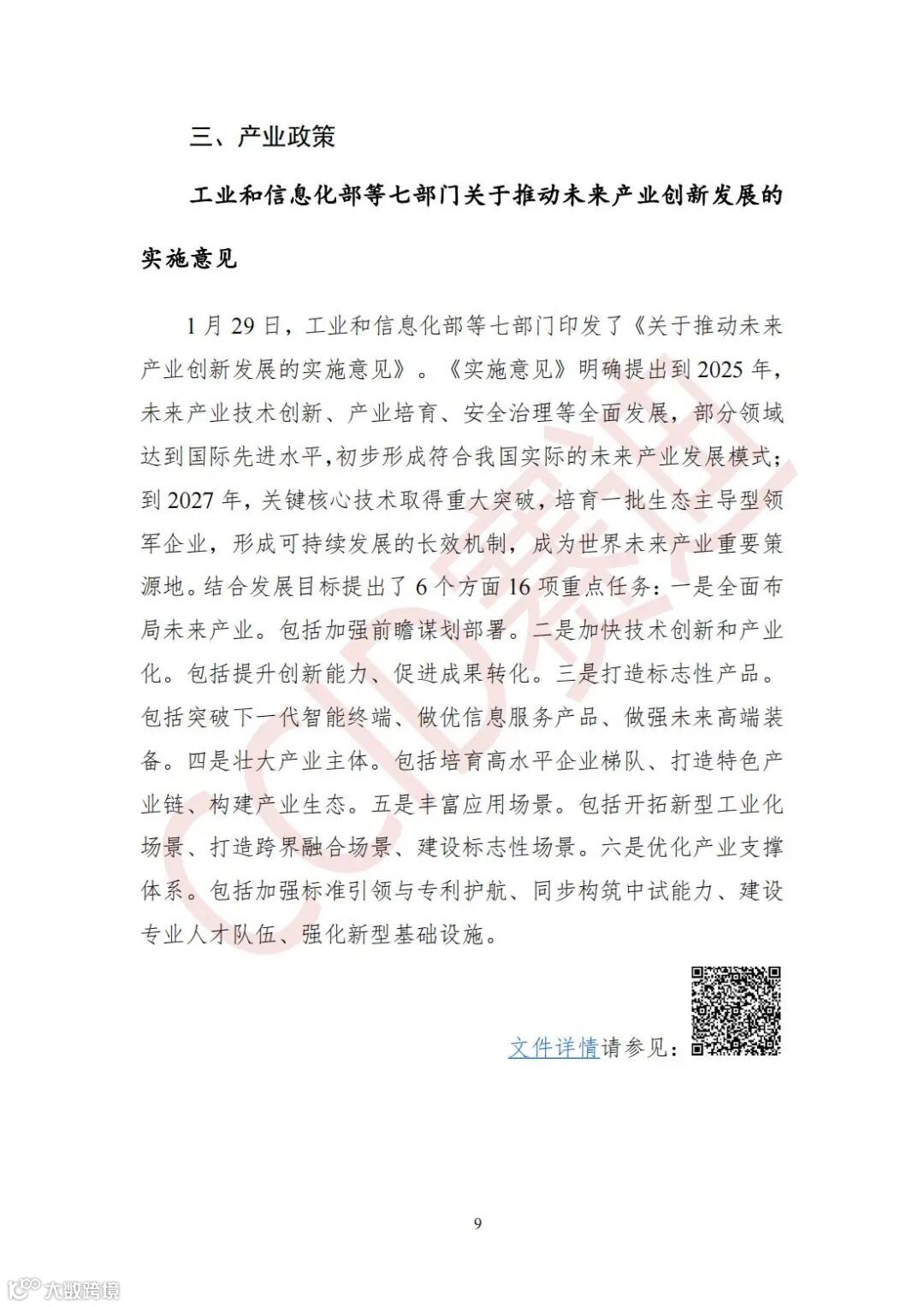 1月29日,工业和信息化部等七部门印发了《关于推动未来产业创新发展的实施意见》。《实施意见》明确提出到2025年,未来产业技术创新、产业培育、安全治理等全面发展,部分领域达到国际先进水平,初步形成符合我国实际的未来产业发展模式;到2027年,关键核心技术取得重大突破,培育一批生态主导型领军企业,形成可持续发展的长效机制,成为世界未来产业重要策源地。结合发展目标提出了6个方面16项重点任务:一是全面布局未来产业。包括加强前瞻谋划部署。二是加快技术创新和产业化。包括提升创新能力、促进成果转化。三是打造标志性产品。包括突破下一代智能终端、做优信息服务产品、做强未来高端装备。四是壮大产业主体。包括培育高水平企业梯队、打造特色产业链、构建产业生态。五是丰富应用场景。包括开拓新型工业化场景、打造跨界融合场景、建设标志性场景。六是优化产业支撑体系。包括加强标准引领与专利护航、同步构筑中试能力、建设专业人才队伍、强化新型基础设施。