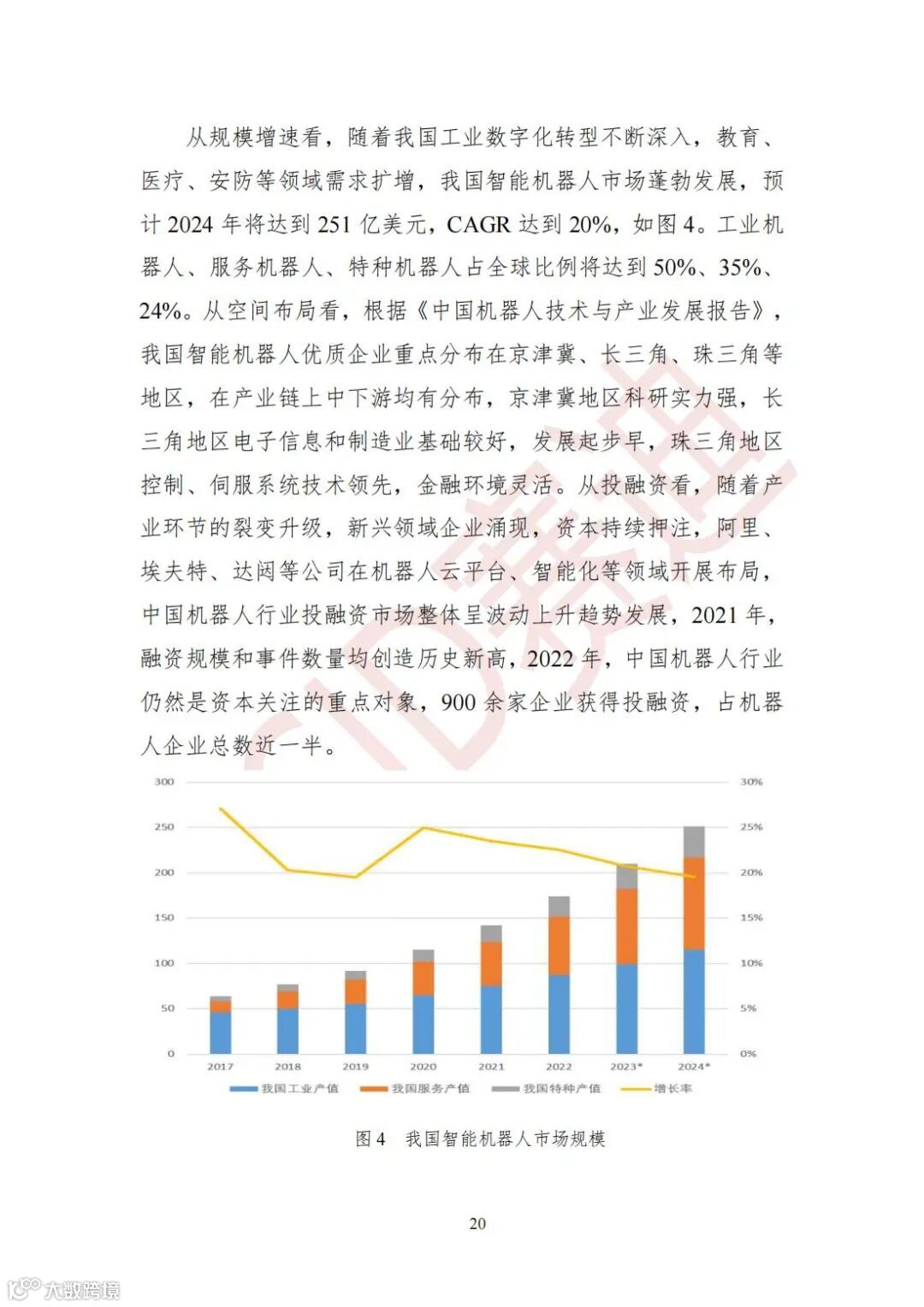 从规模增速看,我国智能机器人市场蓬勃发展,预计2024年将达到251亿美元,CAGR达到20%。工业机器人、服务机器人、特种机器人占全球比例将达到50%、35%、24%。