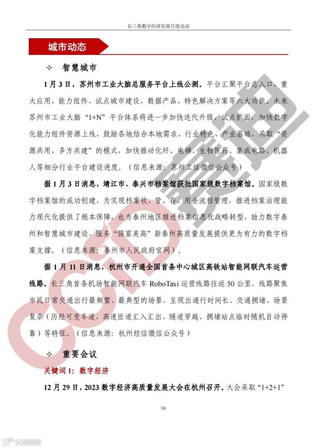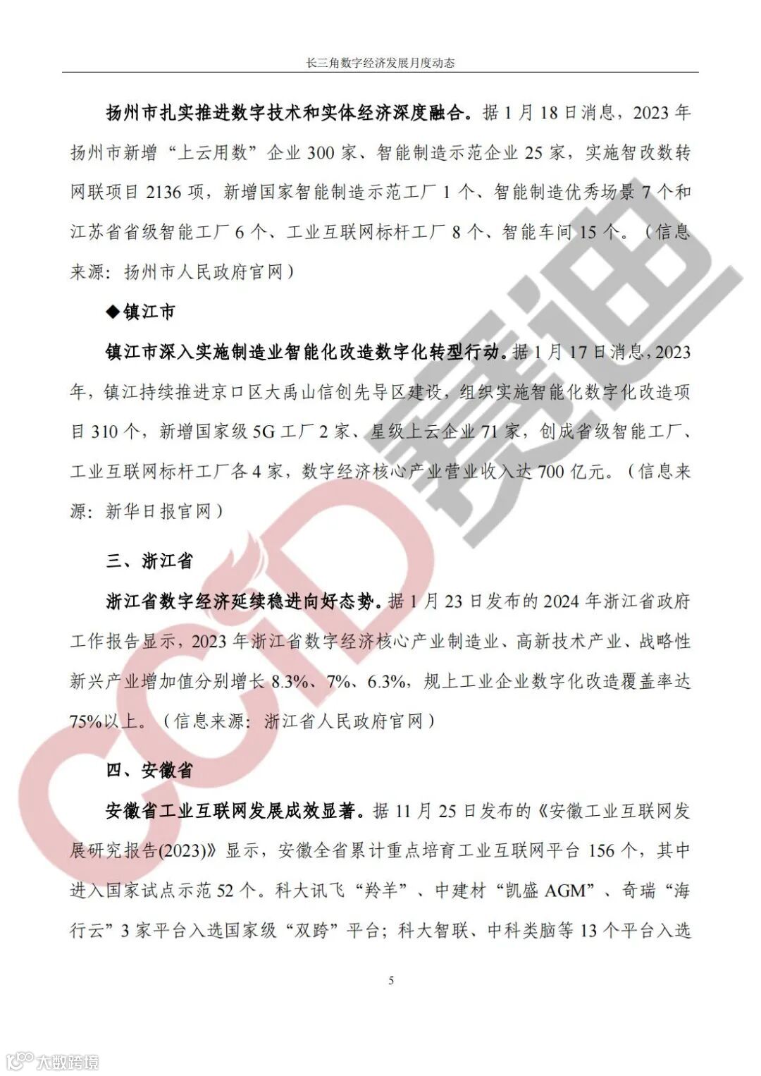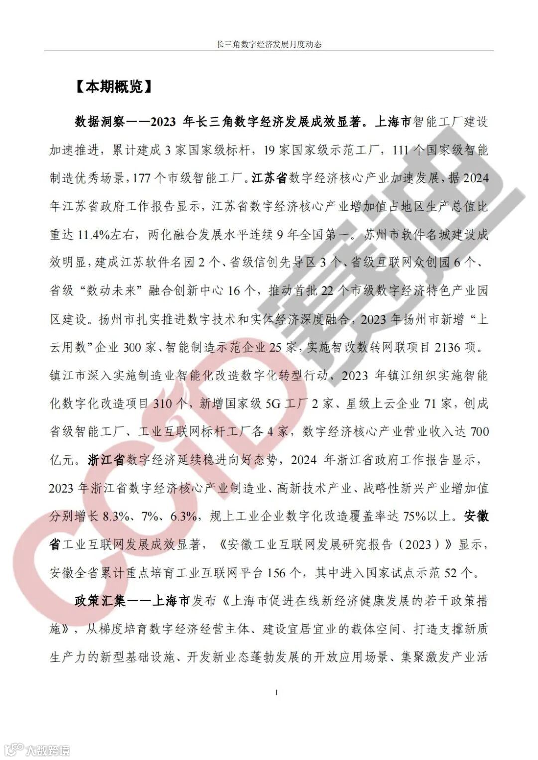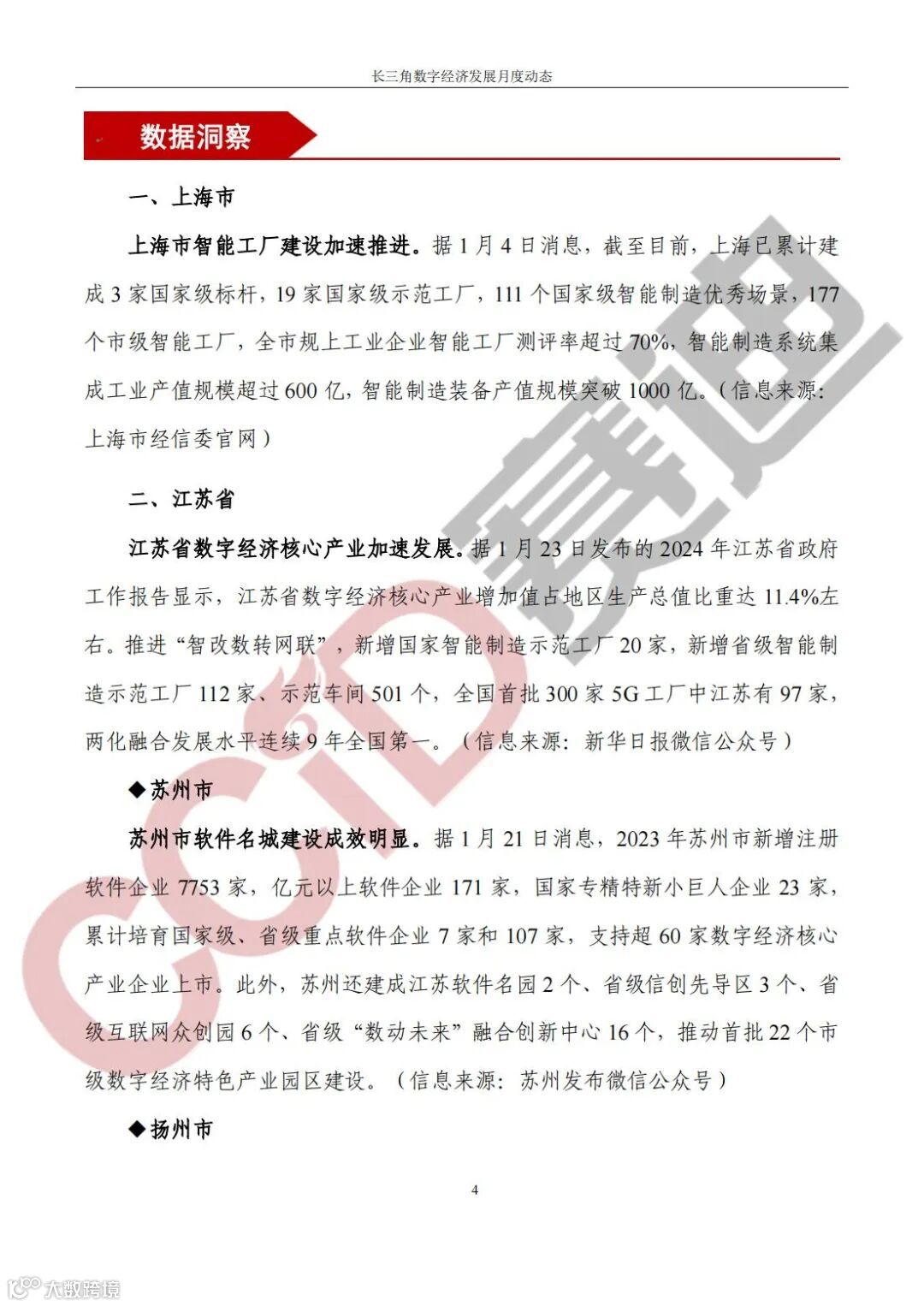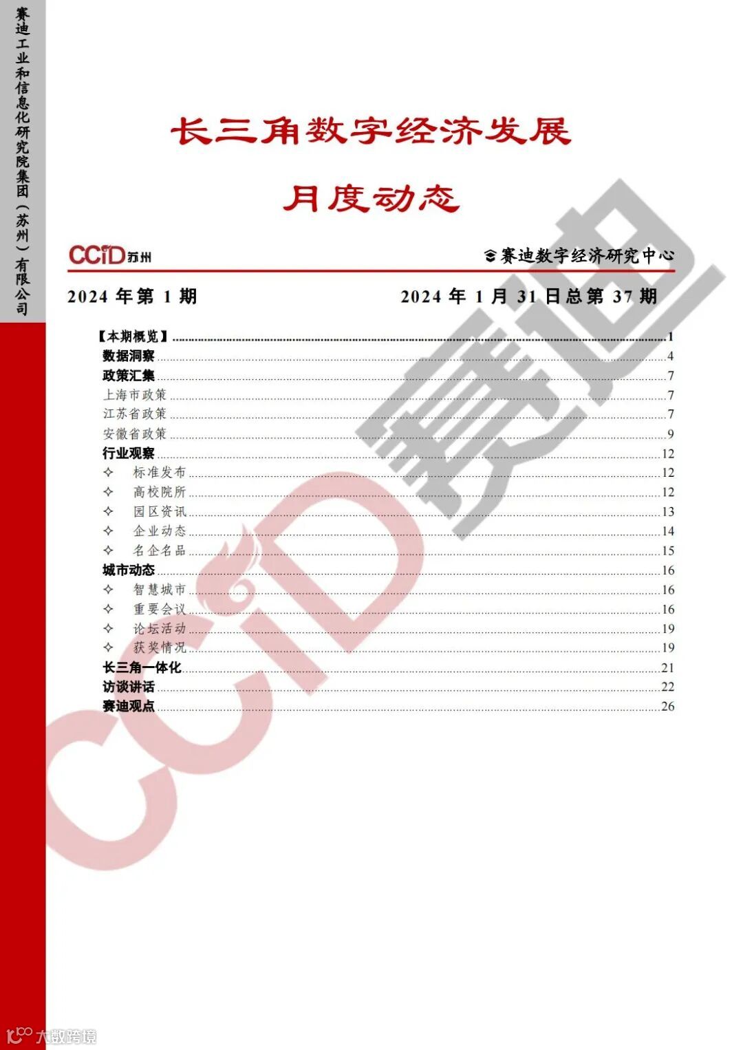 《长三角数字经济发展月度动态》2024年第1期来啦!本刊物由赛迪数字经济研究中心创办,重点聚焦《长江三角洲区域一体化发展规划纲要》中涵盖的27个中心区城市,以数字经济相关领域月度主要发展动态为主题,从数据洞察、政策汇集、行业观察、城市动态、长三角一体化、访谈讲话、赛迪观点等多个维度展现长三角数字经济的区域发展态势,进而为地方关切提供参考依据,助力地方经济社会发展。