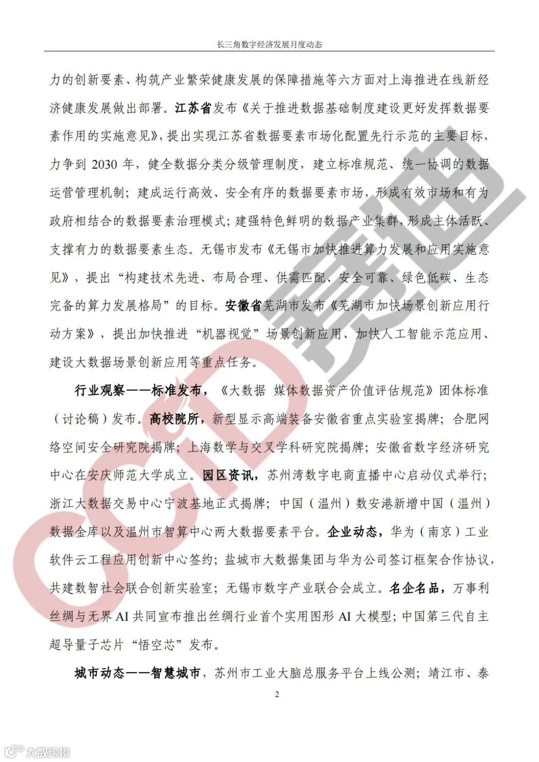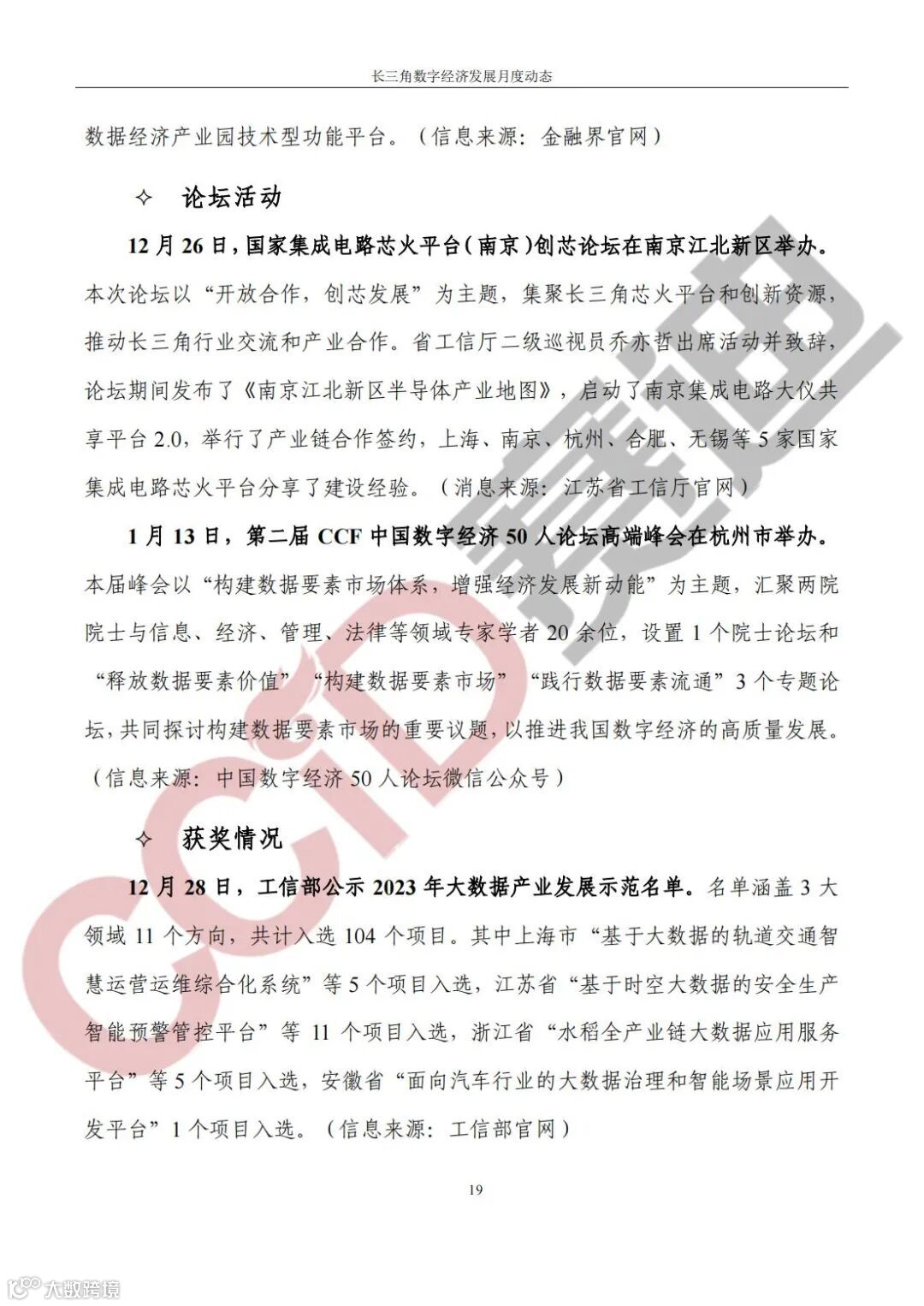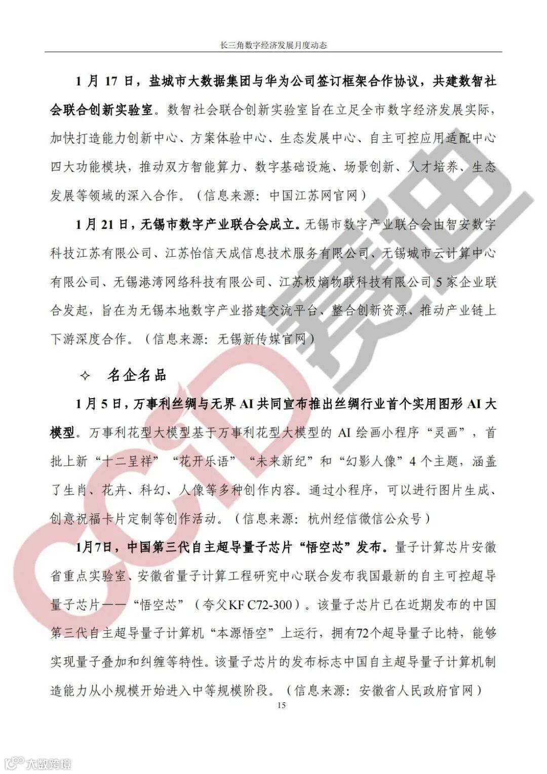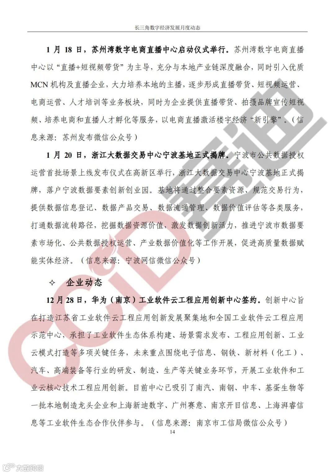 《长三角数字经济发展月度动态》2024年第1期来啦!本刊物由赛迪数字经济研究中心创办,重点聚焦《长江三角洲区域一体化发展规划纲要》中涵盖的27个中心区城市,以数字经济相关领域月度主要发展动态为主题,从数据洞察、政策汇集、行业观察、城市动态、长三角一体化、访谈讲话、赛迪观点等多个维度展现长三角数字经济的区域发展态势,进而为地方关切提供参考依据,助力地方经济社会发展。