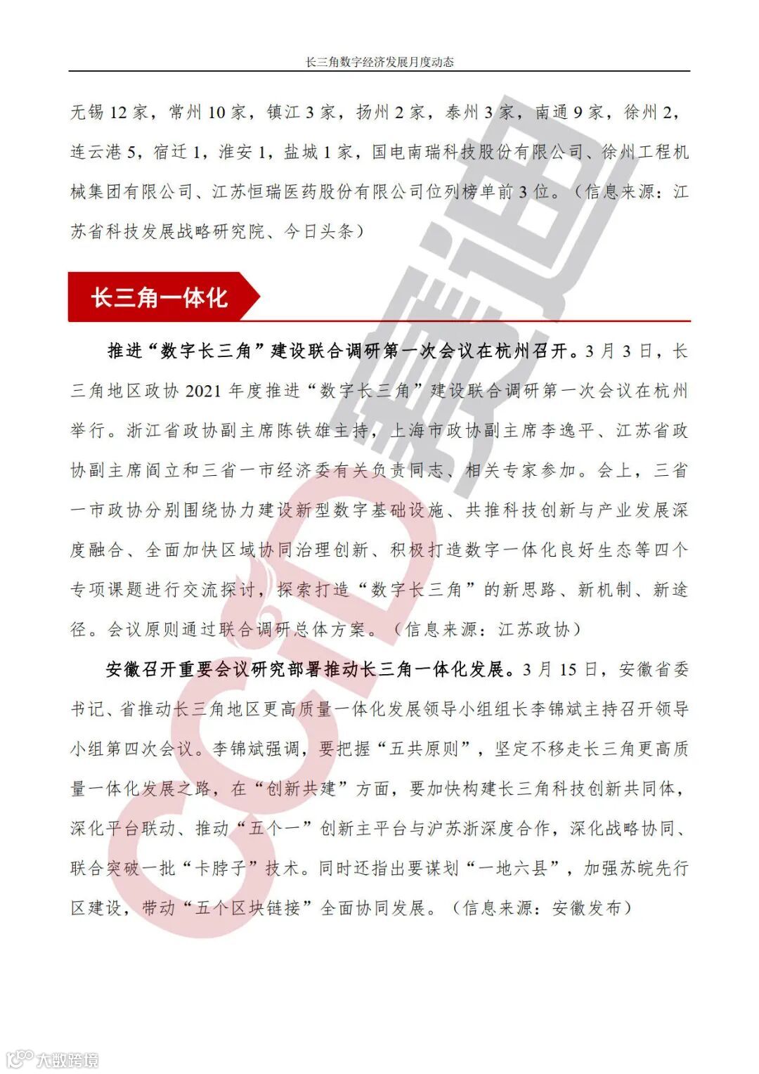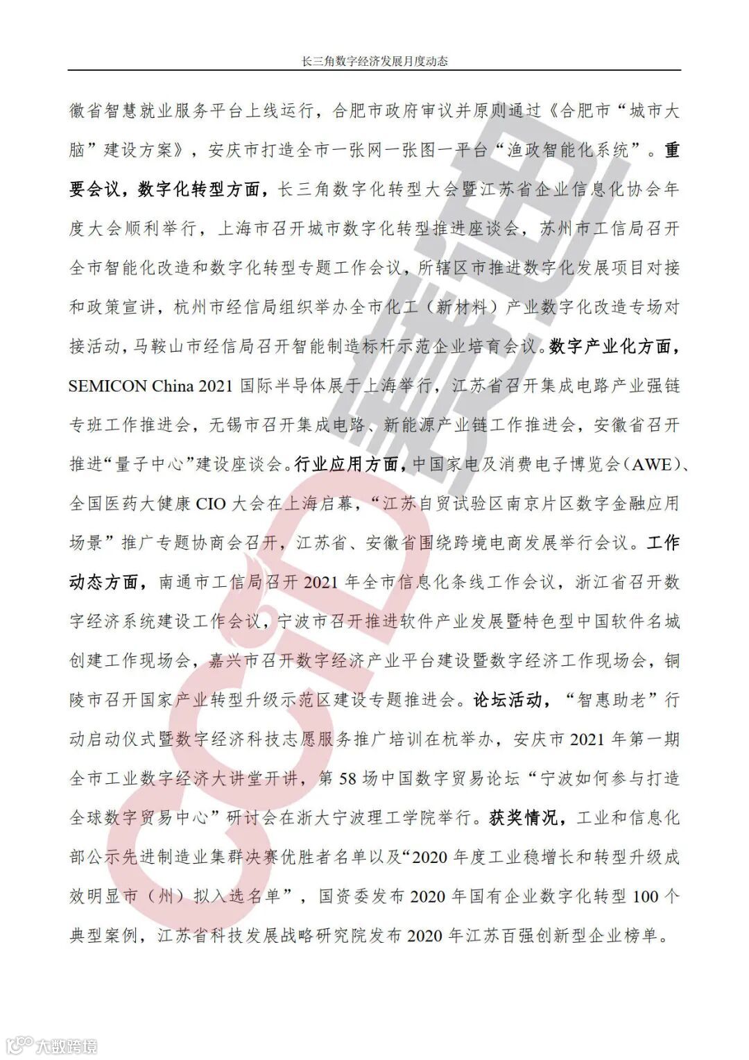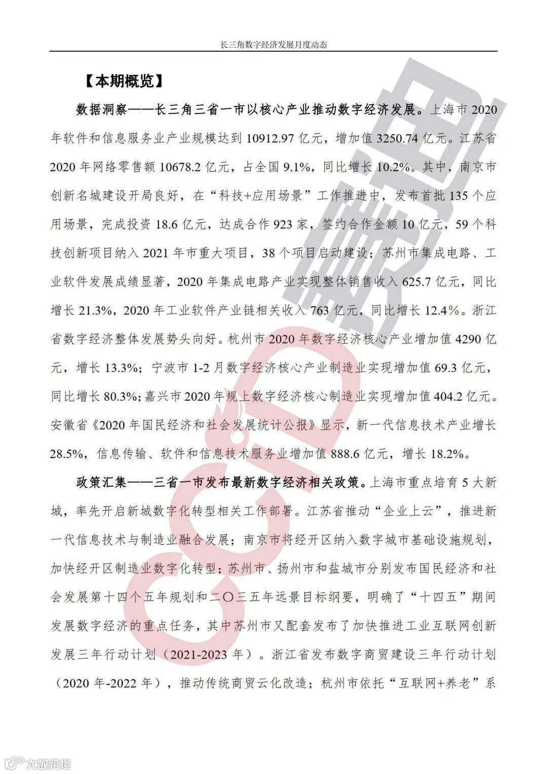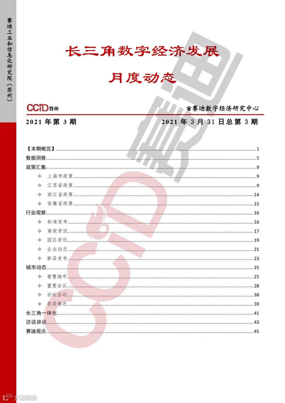 《长三角数字经济发展月度动态》2021年第3期来啦!本刊物由赛迪数字经济研究中心创办,重点聚焦《长江三角洲区域一体化发展规划纲要》中涵盖的27个中心区城市,以数字经济相关领域月度主要发展动态为主题,从数据洞察、政策汇集、行业观察、城市动态、长三角一体化、访谈讲话、赛迪观点等多个维度展现长三角数字经济的区域发展态势,进而为地方关切提供参考依据,助力地方经济社会发展。