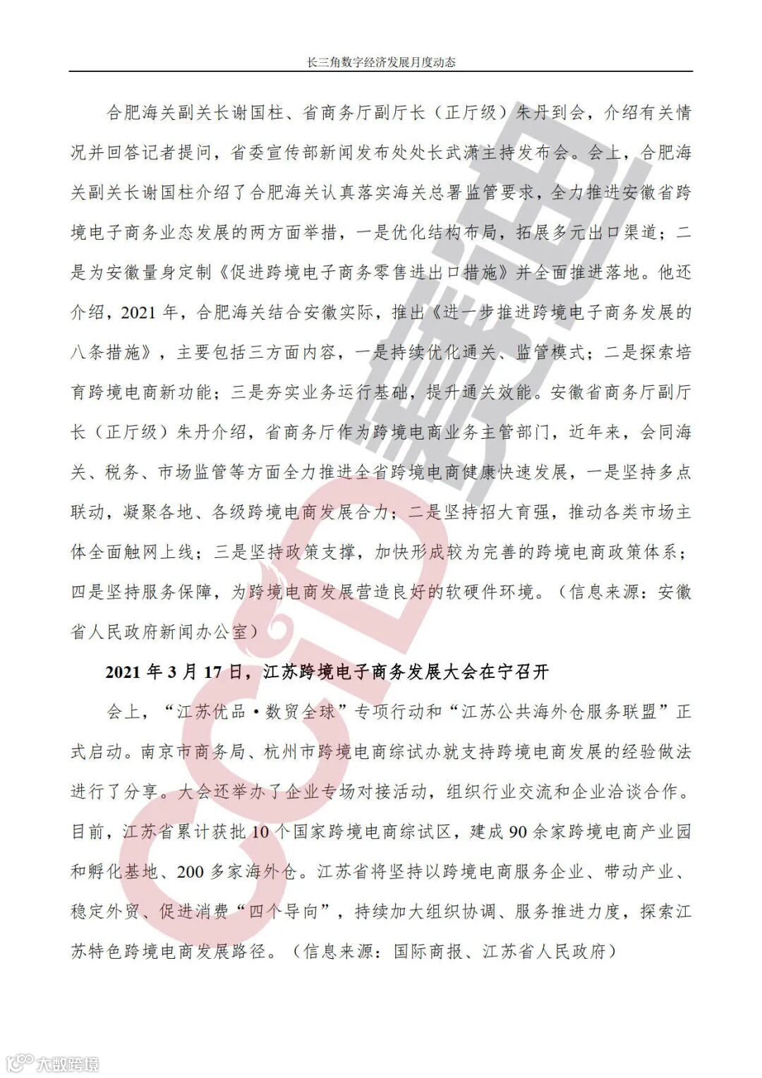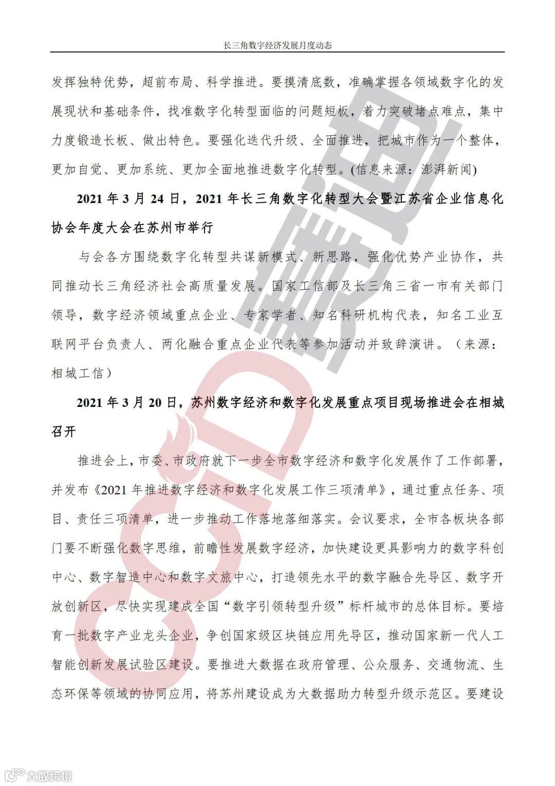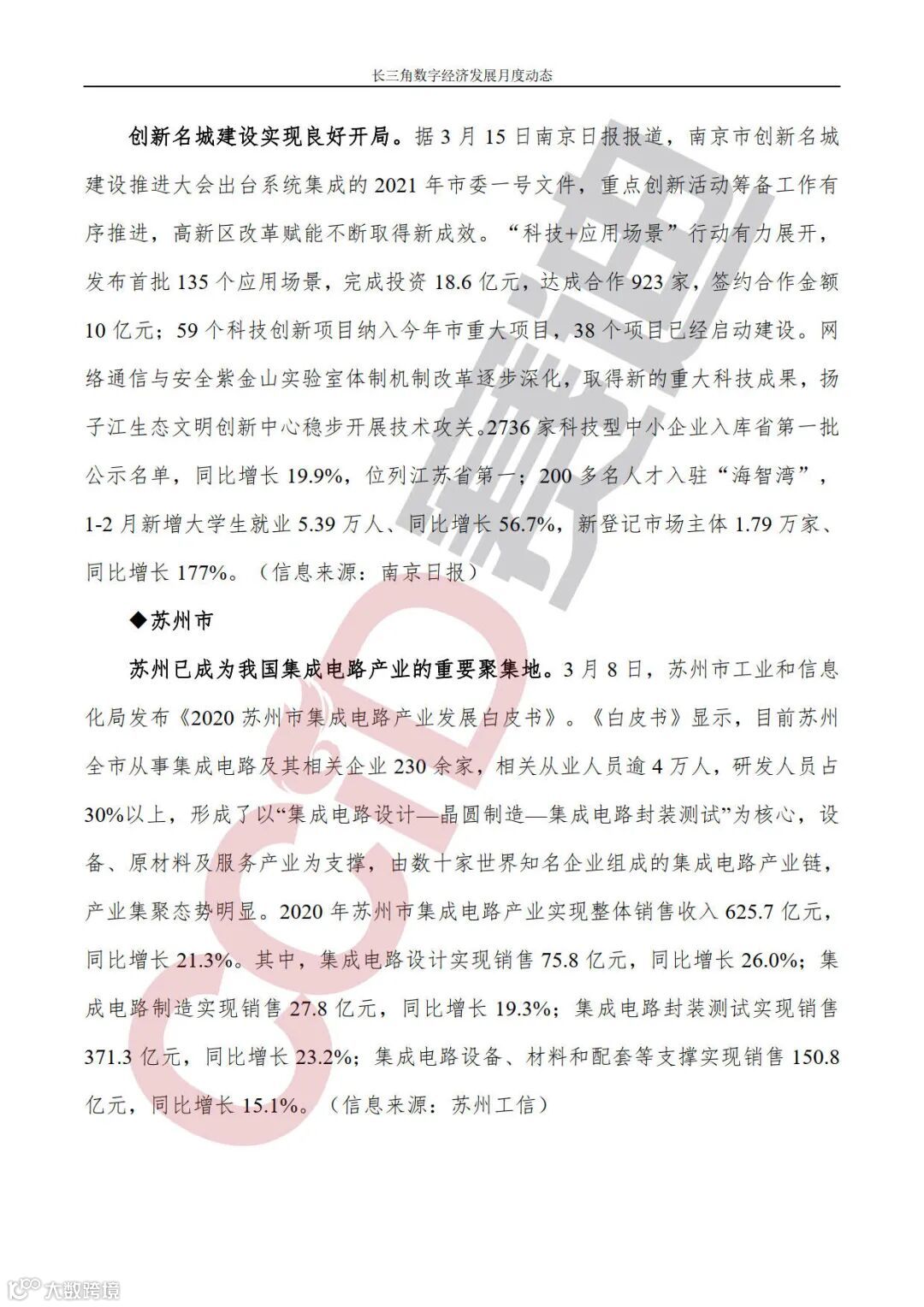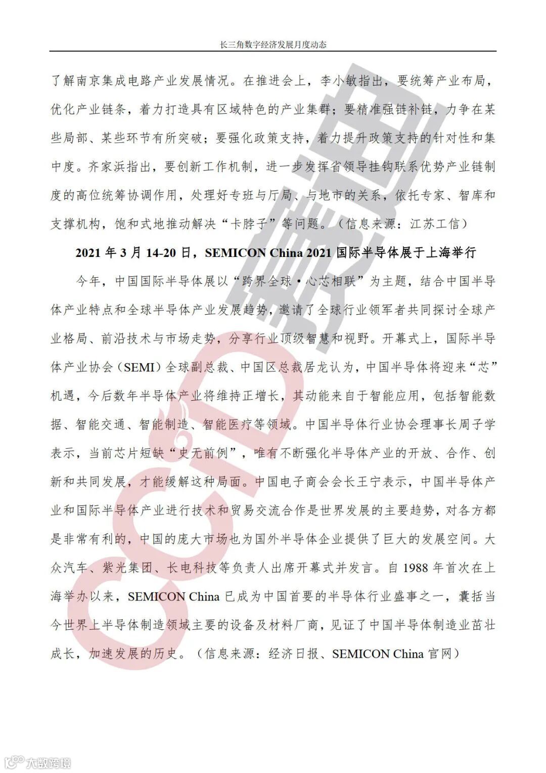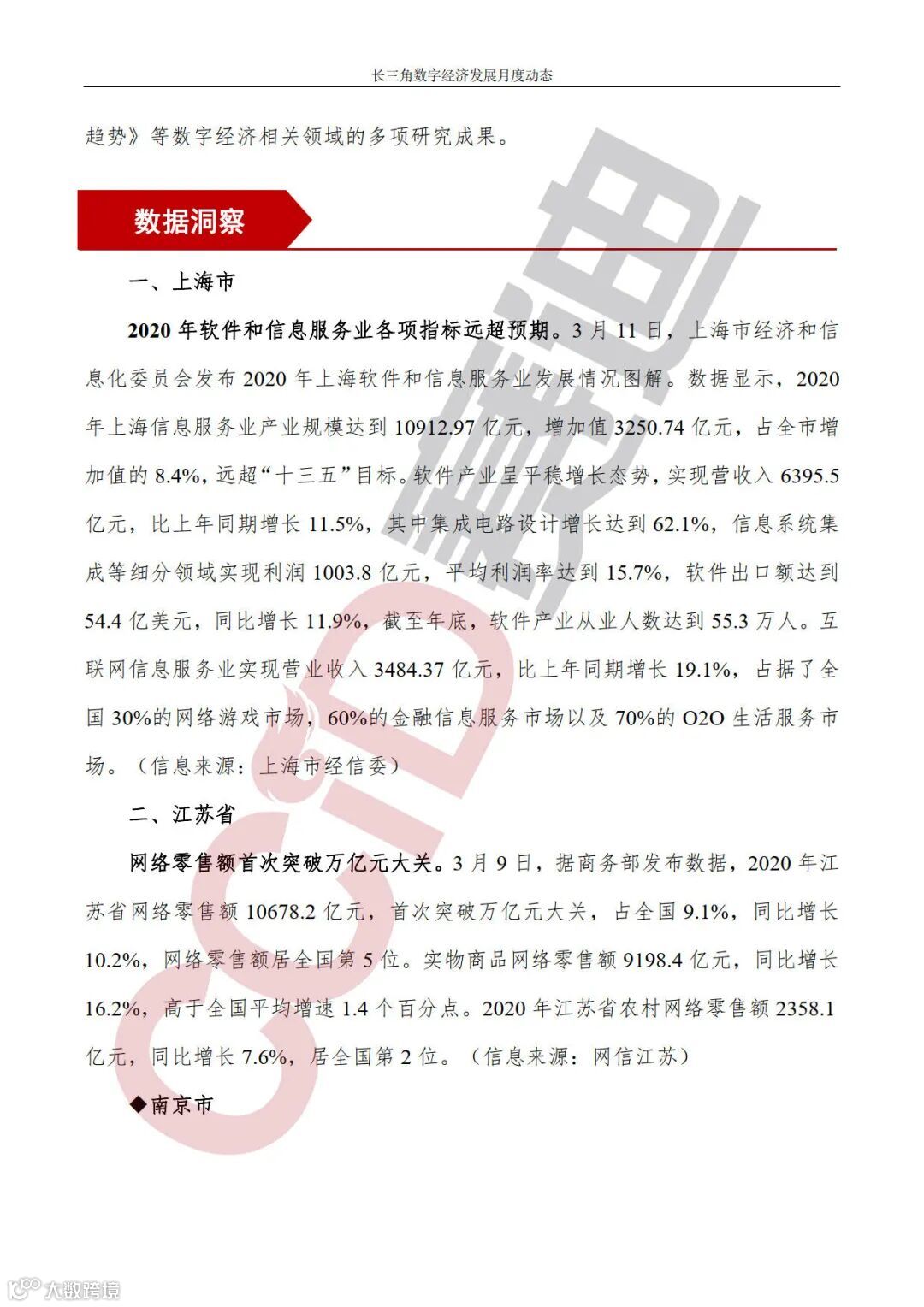 《长三角数字经济发展月度动态》2021年第3期来啦!本刊物由赛迪数字经济研究中心创办,重点聚焦《长江三角洲区域一体化发展规划纲要》中涵盖的27个中心区城市,以数字经济相关领域月度主要发展动态为主题,从数据洞察、政策汇集、行业观察、城市动态、长三角一体化、访谈讲话、赛迪观点等多个维度展现长三角数字经济的区域发展态势,进而为地方关切提供参考依据,助力地方经济社会发展。