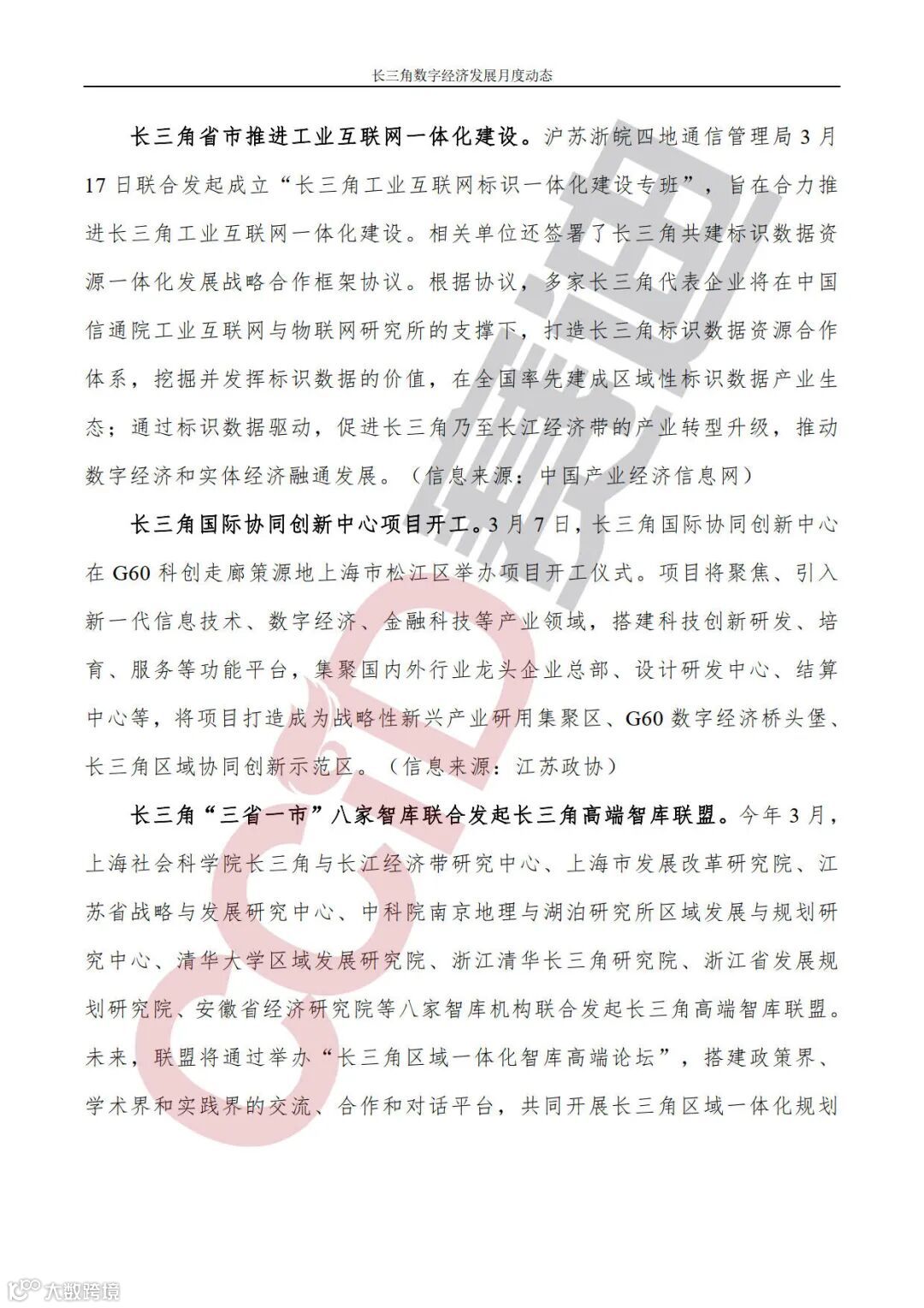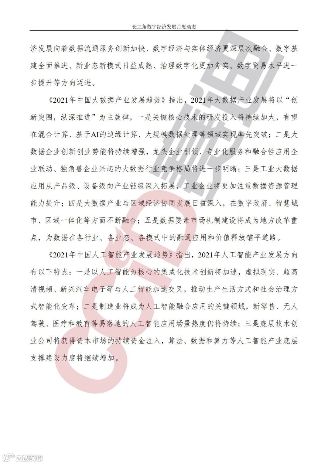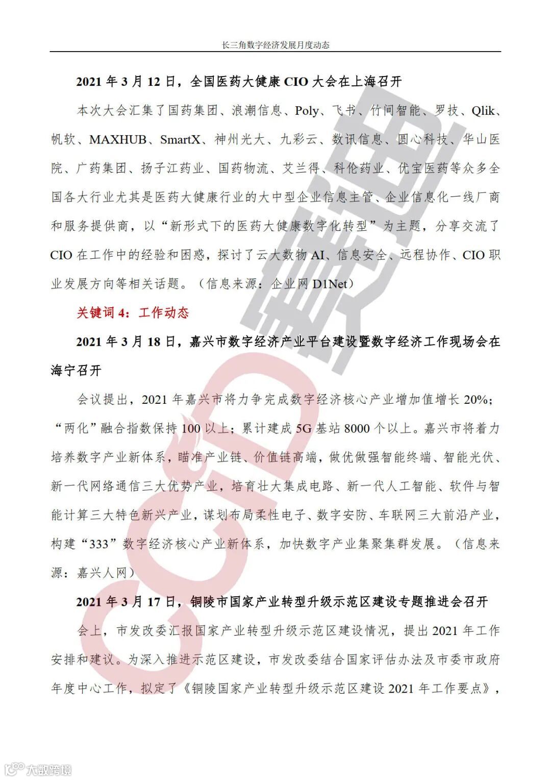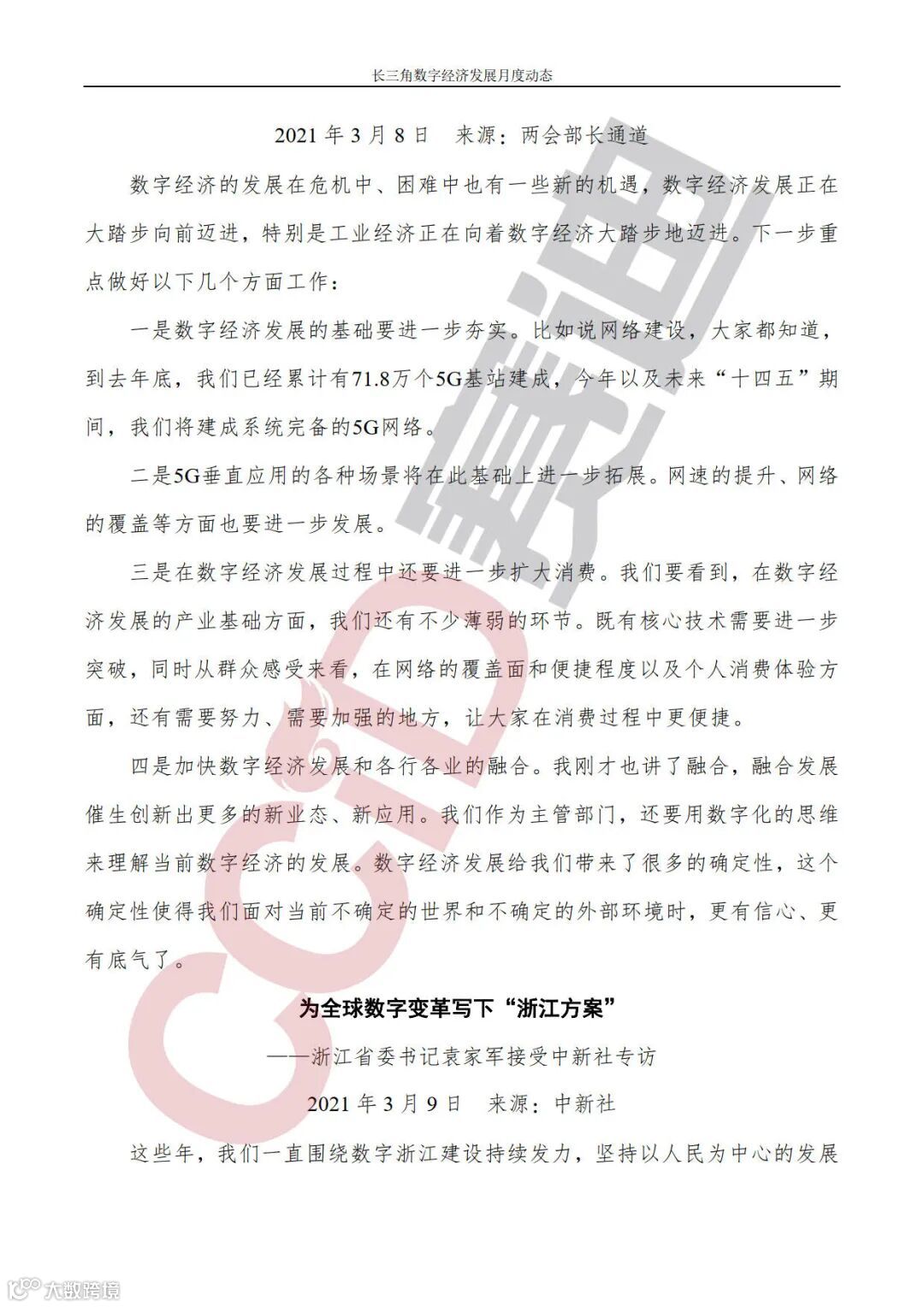《长三角数字经济发展月度动态》2021年第3期来啦!本刊物由赛迪数字经济研究中心创办,重点聚焦《长江三角洲区域一体化发展规划纲要》中涵盖的27个中心区城市,以数字经济相关领域月度主要发展动态为主题,从数据洞察、政策汇集、行业观察、城市动态、长三角一体化、访谈讲话、赛迪观点等多个维度展现长三角数字经济的区域发展态势,进而为地方关切提供参考依据,助力地方经济社会发展。
