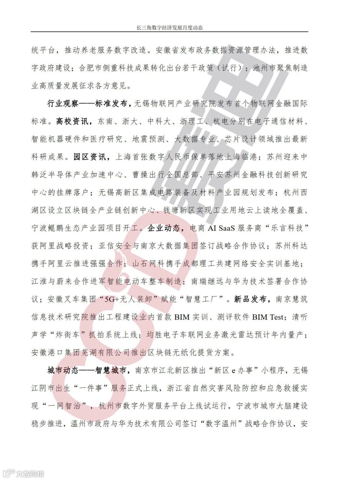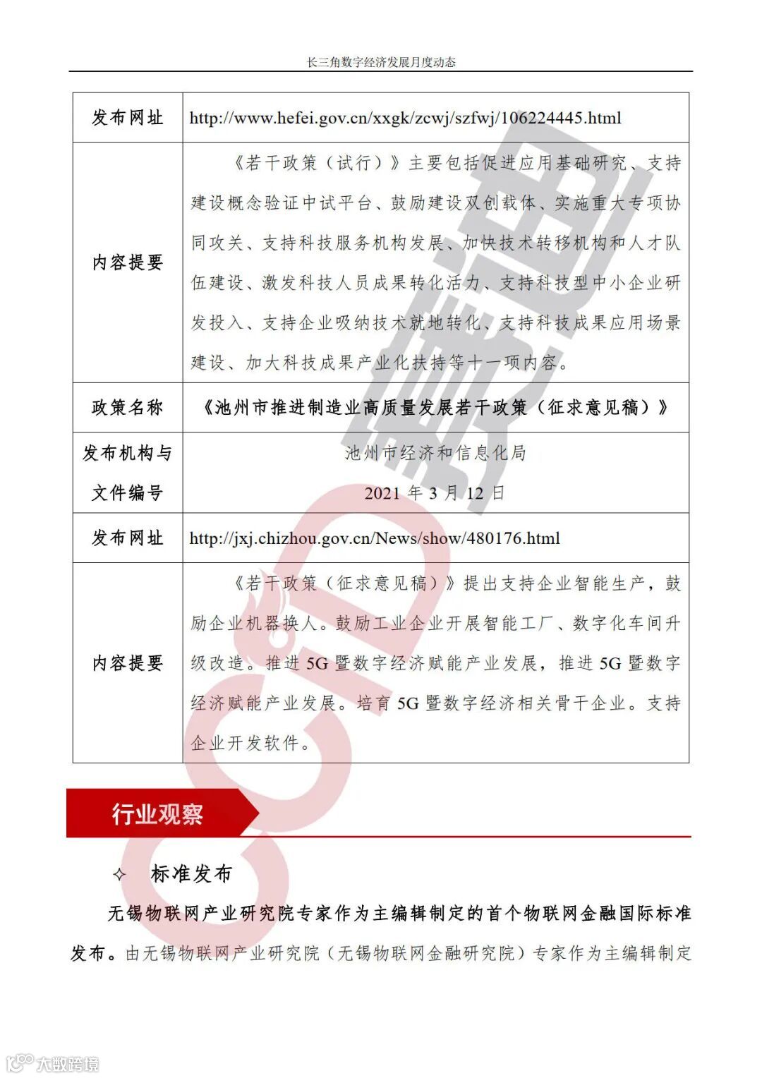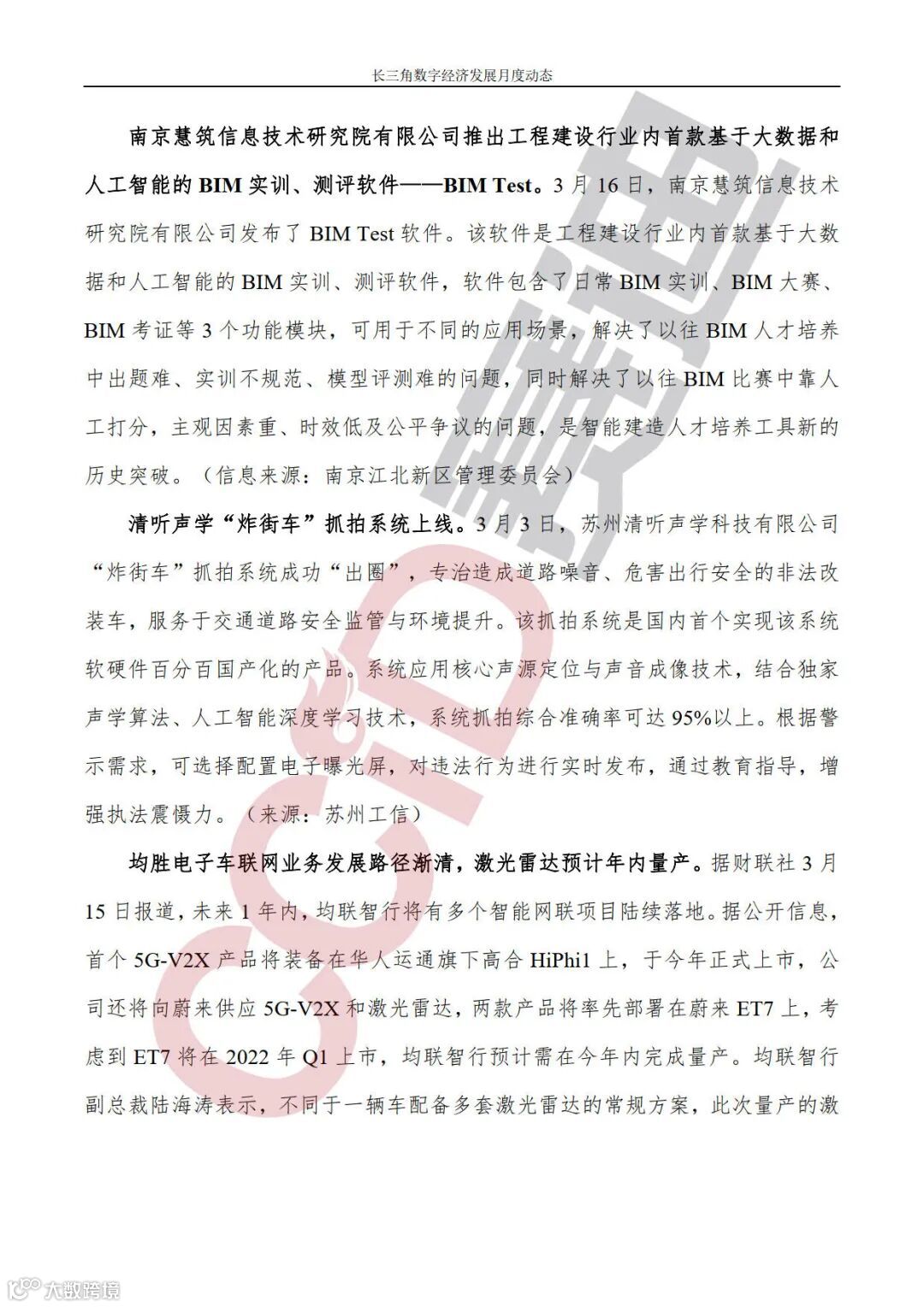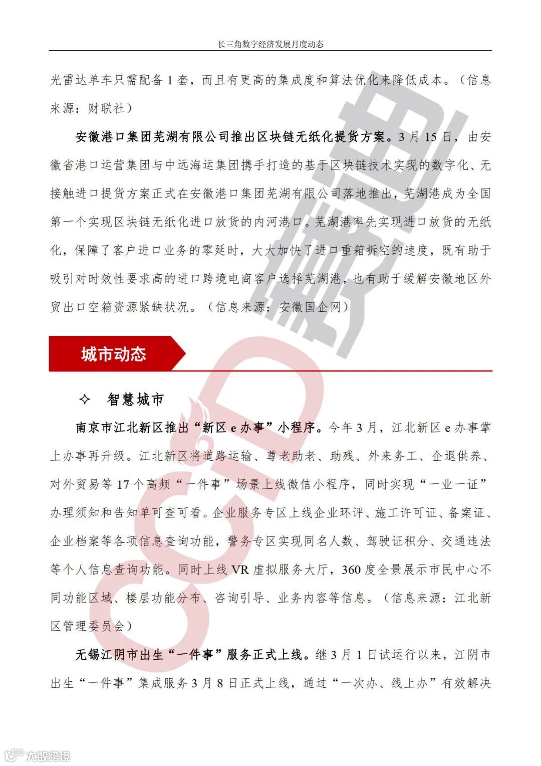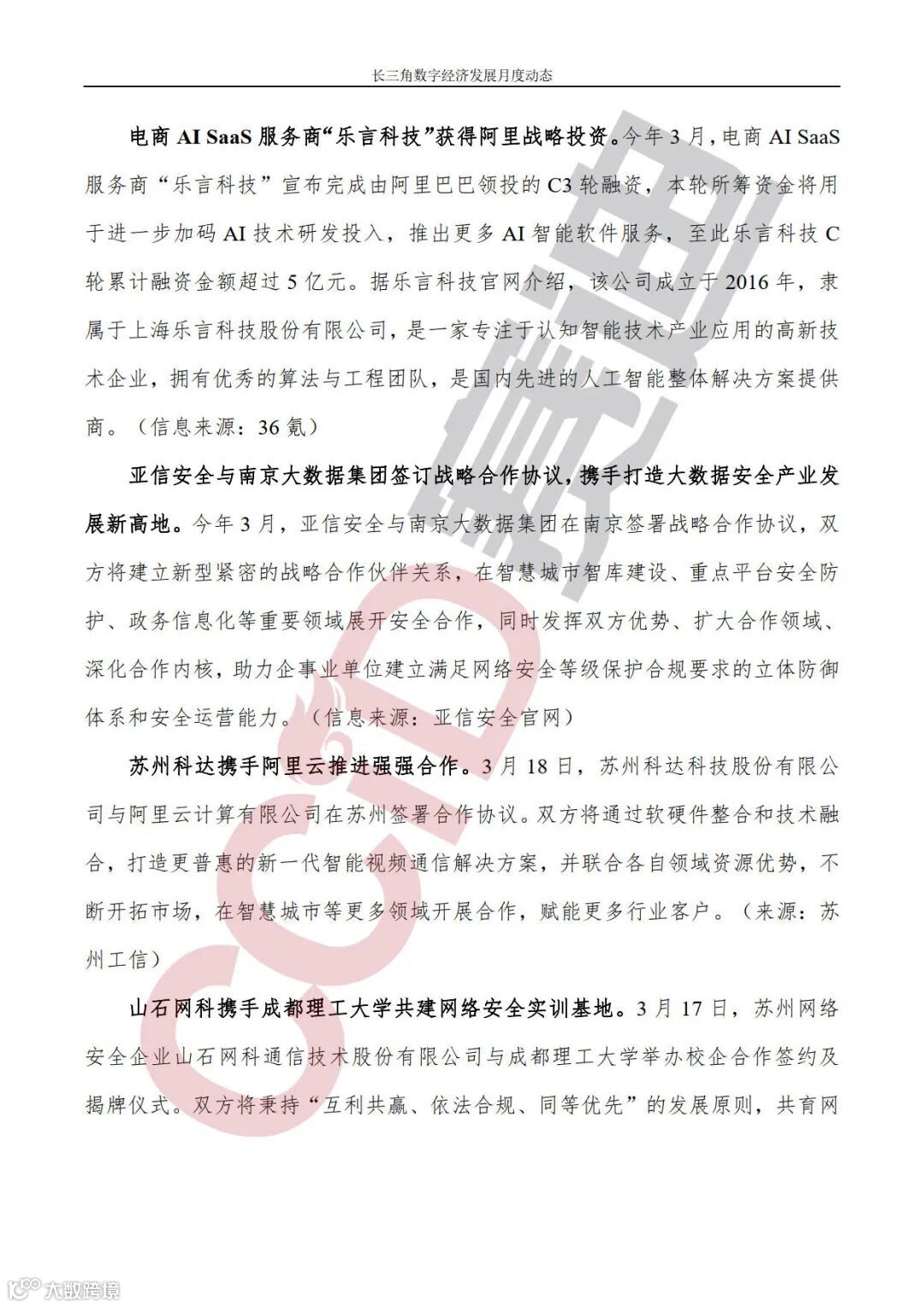 《长三角数字经济发展月度动态》2021年第3期来啦!本刊物由赛迪数字经济研究中心创办,重点聚焦《长江三角洲区域一体化发展规划纲要》中涵盖的27个中心区城市,以数字经济相关领域月度主要发展动态为主题,从数据洞察、政策汇集、行业观察、城市动态、长三角一体化、访谈讲话、赛迪观点等多个维度展现长三角数字经济的区域发展态势,进而为地方关切提供参考依据,助力地方经济社会发展。