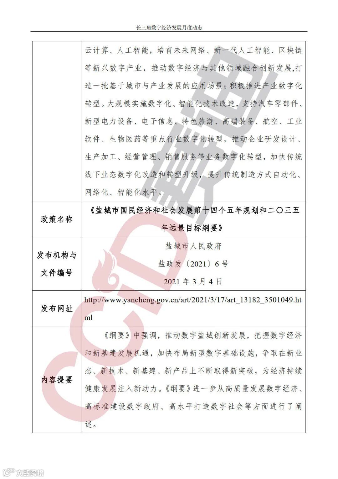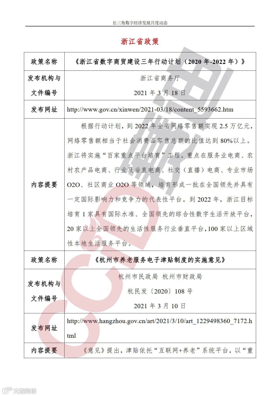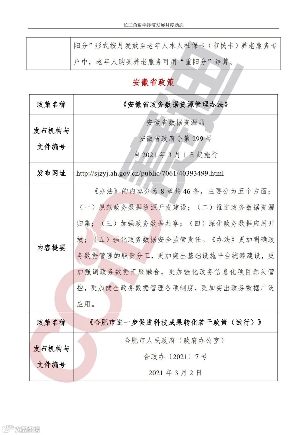 三省一市发布最新数字经济相关政策。上海市重点培育5大新城,率先开启新城数字化转型相关工作部署。江苏省推动“企业上云”,推进新一代信息技术与制造业融合发展;南京市将经开区纳入数字城市基础设施规划,加快经开区制造业数字化转型;苏州市、扬州市和盐城市分别发布国民经济和社会发展第十四个五年规划和二〇三五年远景目标纲要,明确了“十四五”期间发展数字经济的重点任务,其中苏州市又配套发布了加快推进工业互联网创新发展三年行动计划(2021-2023年)。浙江省发布数字商贸建设三年行动计划(2020年-2022年),推动传统商贸云化改造;杭州市依托“互联网+养老”系统平台,推动养老服务数字改造。安徽省发布政务数据资源管理办法,推进数字政府建设;合肥市侧重科技成果转化出台若干政策(试行);池州市聚焦制造业高质量发展征求各方意见。