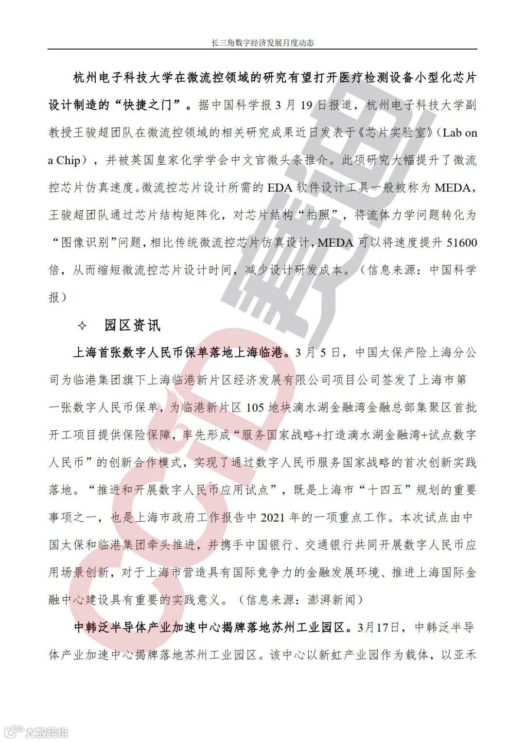 园区资讯,上海首张数字人民币保单落地上海临港;苏州迎来中韩泛半导体产业加速中心、曹操出行全国总部、平安苏州金融科技创新研究中心的挂牌落户;无锡高新区集成电路装备及材料产业园规划发布;杭州西湖区设立区块链全产业链创新中心、钱塘新区实现工业用地云上读地全覆盖、宁波鲲鹏生态产业园项目开工。