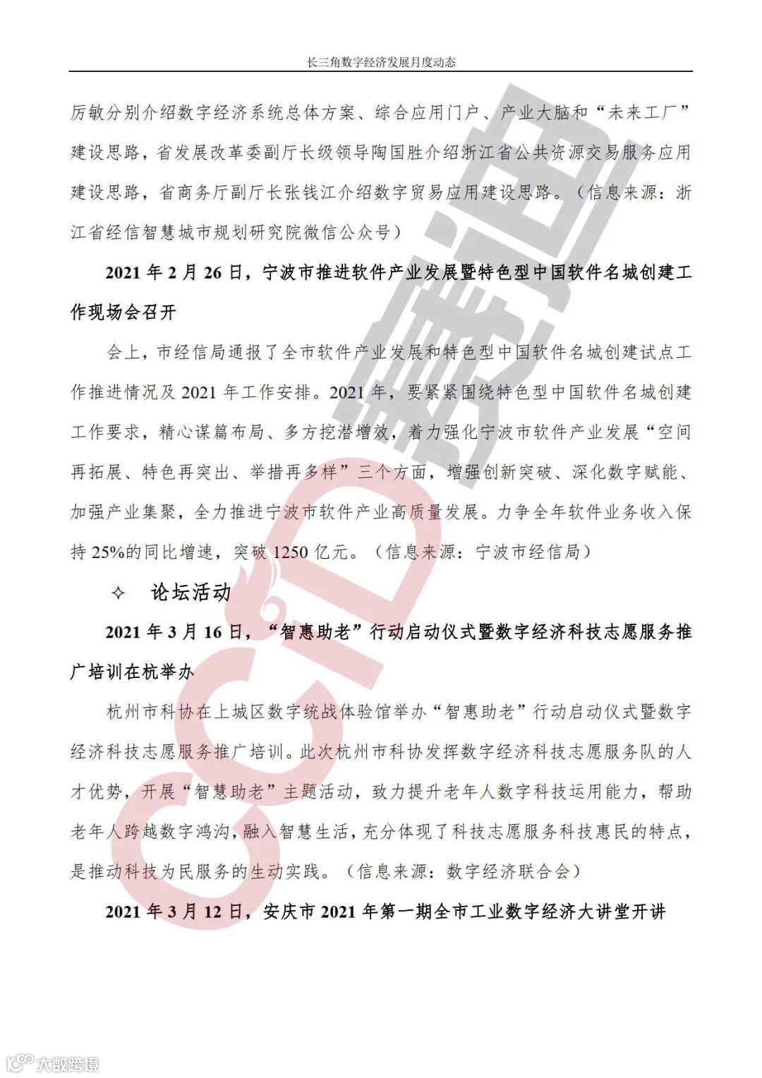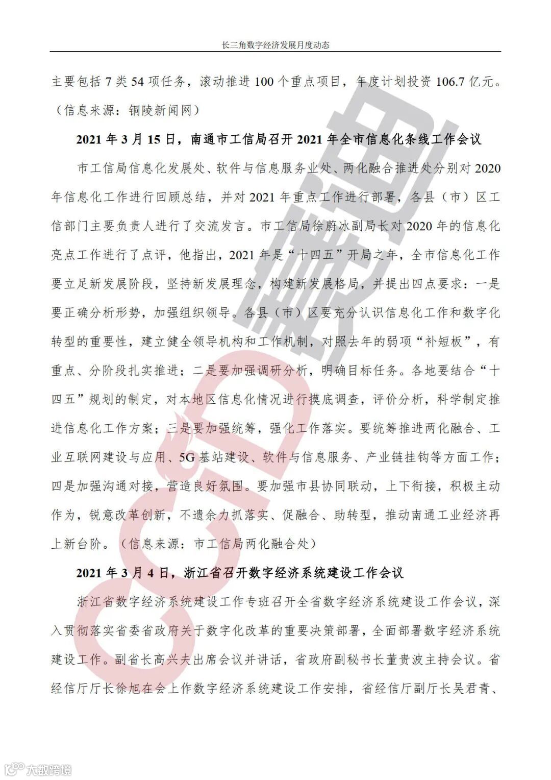 工作动态方面,南通市工信局召开2021年全市信息化条线工作会议,浙江省召开数字经济系统建设工作会议,宁波市召开推进软件产业发展暨特色型中国软件名城创建工作现场会,嘉兴市召开数字经济产业平台建设暨数字经济工作现场会,铜陵市召开国家产业转型升级示范区建设专题推进会。