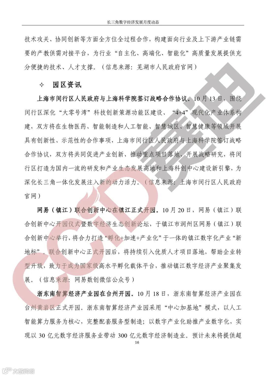 园区资讯,上海市闵行区人民政府与上海科学院签订战略合作协议;网易(镇江)联合创新中心在镇江正式开园;浙东南智算经济产业园在台州开园。