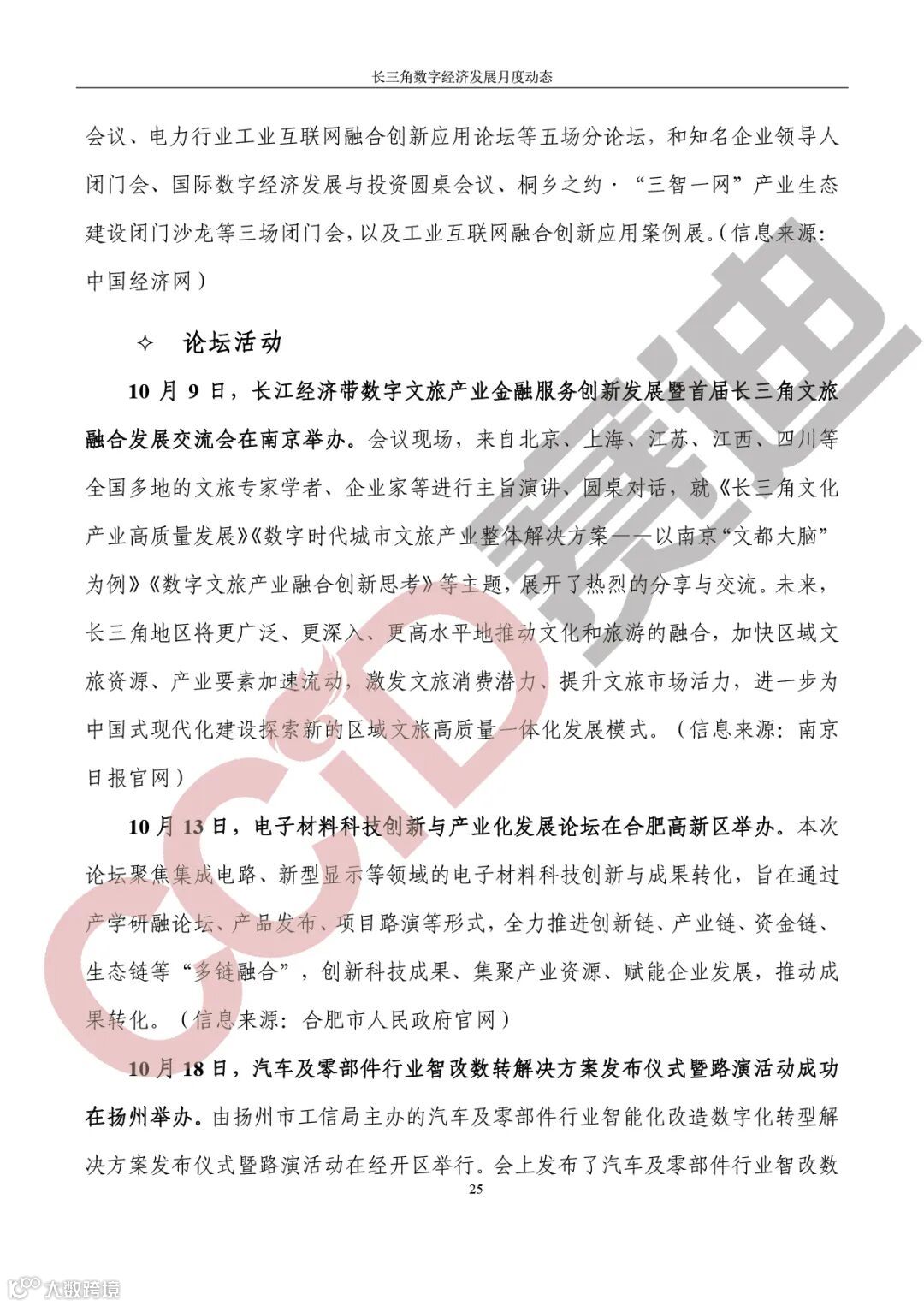 论坛活动,10月9日,长江经济带数字文旅产业金融服务创新发展暨首届长三角文旅融合发展交流会在南京举办;10月13日,电子材料科技创新与产业化发展论坛在合肥高新区举办;10月18日,汽车及零部件行业智改数转解决方案发布仪式暨路演活动成功在扬州举办;10月19日,2023信息技术应用创新专题研讨会在金华举行;10月22日,2023首届长三角机器人产业链协同发展高峰论坛在芜湖举办。