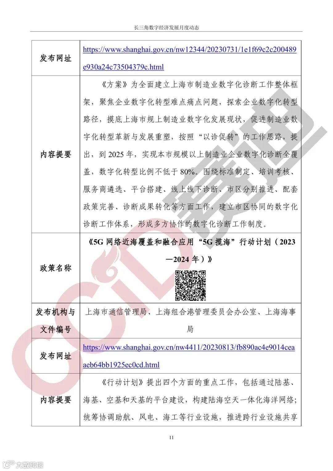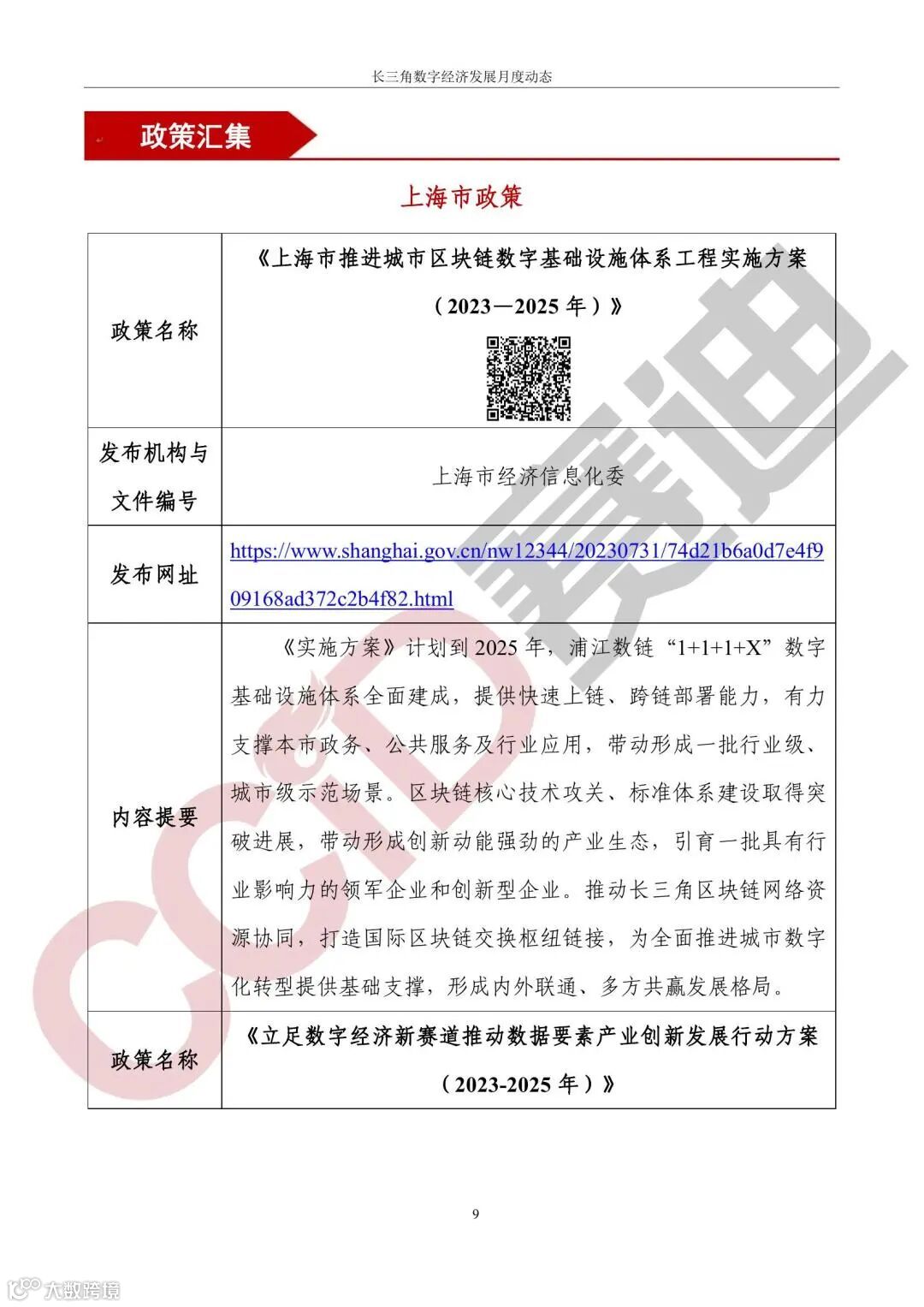 上海市发布《上海市推进城市区块链数字基础设施体系工程实施方案(2023—2025年)》,计划到2025年,浦江数链“1+1+1+X”数字基础设施体系全面建成,提供快速上链、跨链部署能力,有力支撑本市政务、公共服务及行业应用,带动形成一批行业级、城市级示范场景;出台《立足数字经济新赛道推动数据要素产业创新发展行动方案(2023-2025年)》,提出到2025年,数据要素市场体系基本建成,国家级数据交易所地位基本确立;出台《上海市规上制造业数字化诊断工作推进方案》,围绕标准制定、培训考核、服务商遴选、平台搭建、线上线下诊断、市区分别推进、配套政策完善、诊断成果转化等方面工作,建立市区协同的数字化诊断工作体系,形成多方协作的数字化诊断工作制度;发布《5G网络近海覆盖和融合应用“5G揽海”行动计划(2023—2024年)》,将推进助航设施开放共享、赋能海上风电创新发展、深化海工设施融合应用、推动5G赋能智慧海洋“5G+海洋监管”“5G+海洋科技”“5G+海洋经济”等场景创新、探索“5G+智能船舶”“5G+智能港口”“5G+智能航保”“5G+智能航运服务”“5G+智能航运监管”等智能航运业务先行先试、聚焦长三角涉海领域协同发展等。江苏省常州市出台《常州市新北区人民政府关于深化数字政府建设的实施意见》,指出到2025年,基本建成服务便捷、治理精准、运行高效、开放透明、公平普惠、安全可控的数字政府,政务服务“一网通办”、城市运行“一网统管”和行政办公“一网协同”整体水平显著提升,打造成为现代数字政府新样板。浙江省杭州市发布《杭州市人民政府办公厅关于高标准建设“中国视谷”高质量发展视觉智能产业的实施意见》,目标到2027年,杭州市视觉智能产品总体规模达到1万亿元,建设国内领先、全球重要的视觉智能技术创新策源地、成果转化首选地、高端产业聚集地、产业生态最优地;绍兴市出台《绍兴市数字经济创新提质“一号发展工程”高技能人才倍增行动实施方案(2023-2027年)》提出,到2027年,5年累计开展数字技能培训评价10万人次以上,全市数字高技能人才总量达到3万人以上,占高技能人才总量比例提升五个百分点。
