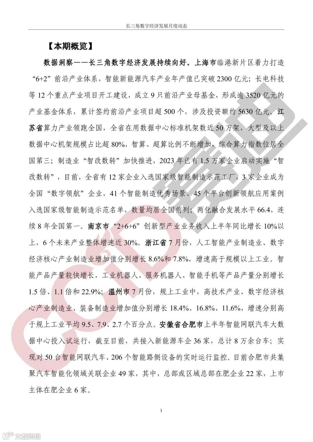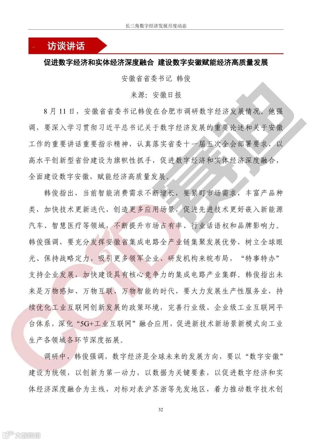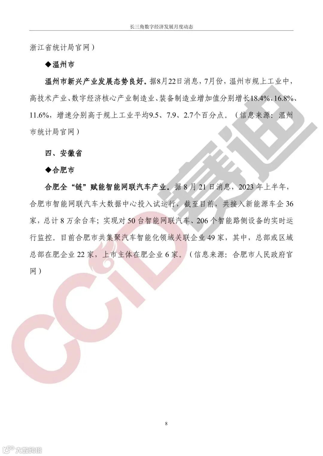 《长三角数字经济发展月度动态》2023年第8期来啦!本刊物由赛迪数字经济研究中心创办,重点聚焦《长江三角洲区域一体化发展规划纲要》中涵盖的27个中心区城市,以数字经济相关领域月度主要发展动态为主题,从数据洞察、政策汇集、行业观察、城市动态、长三角一体化、访谈讲话、赛迪观点等多个维度展现长三角数字经济的区域发展态势,进而为地方关切提供参考依据,助力地方经济社会发展。