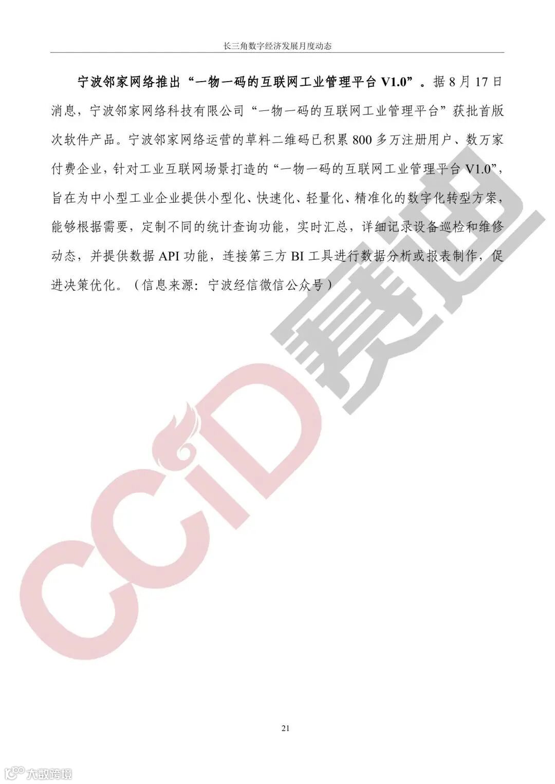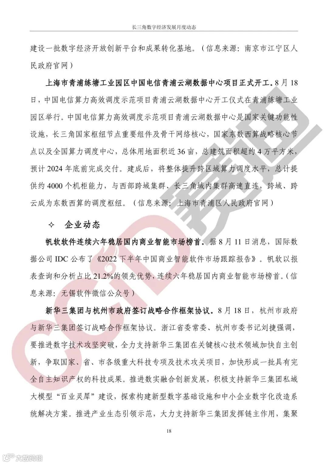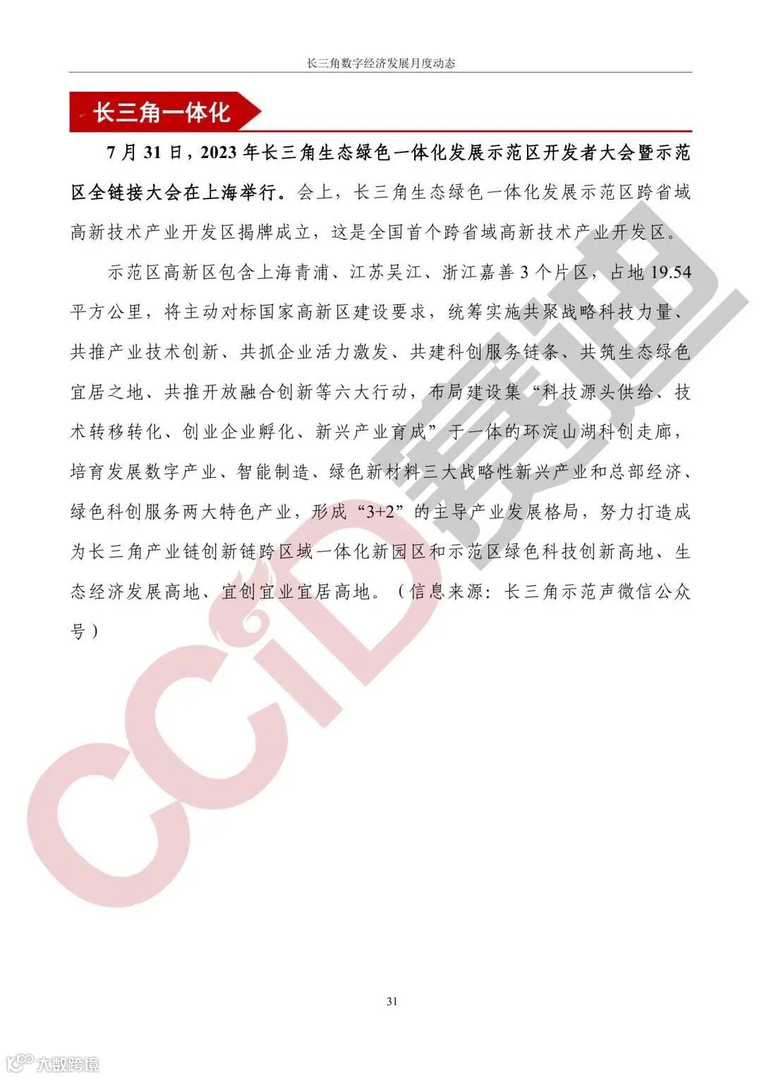 《长三角数字经济发展月度动态》2023年第8期来啦!本刊物由赛迪数字经济研究中心创办,重点聚焦《长江三角洲区域一体化发展规划纲要》中涵盖的27个中心区城市,以数字经济相关领域月度主要发展动态为主题,从数据洞察、政策汇集、行业观察、城市动态、长三角一体化、访谈讲话、赛迪观点等多个维度展现长三角数字经济的区域发展态势,进而为地方关切提供参考依据,助力地方经济社会发展。