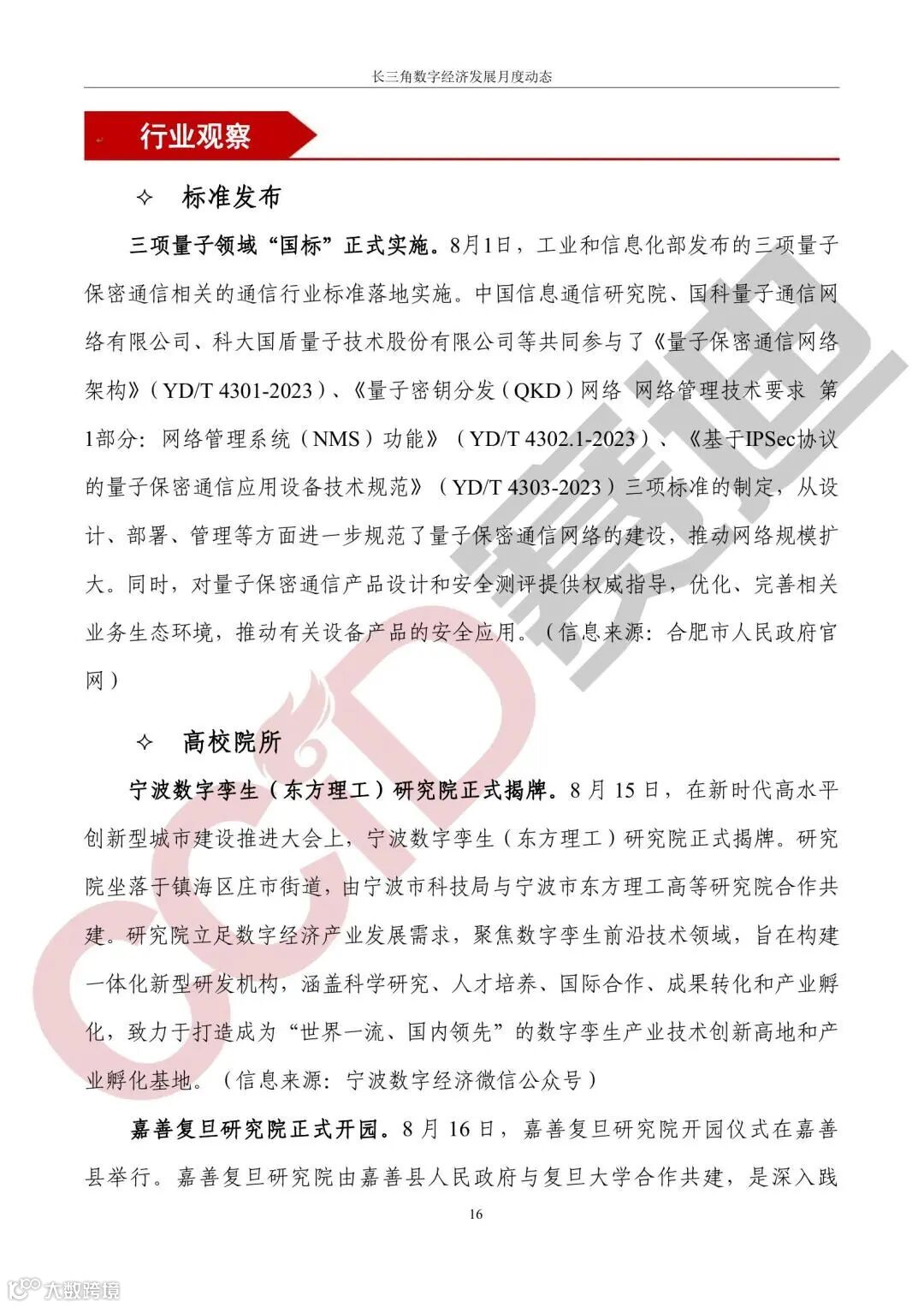 重要会议,数字产业化领域,8月3日,江苏省5G产业发展大会在苏州成功举办;8月9日,2023年大数据产业发展示范宣贯交流会在苏州成功举办;8月9日,2023集成电路(无锡)创新发展大会在无锡开幕;8月19日,第二届CCF量子计算大会暨中国量子计算产业峰会在合肥举办;8月20-23日,2023中国(南京)国际软件产品和信息服务交易博览会暨中国工业软件供需大会在南京举行;8月24日,第七届未来网络发展大会在南京市开幕;8月27日,2023长三角算力发展大会在苏州举行。数实融合领域,7月30日,元宇宙与数字经济发展大会在合肥市举行;8月10日,2023“星火·链网”大会(苏州)成功召开;8月10日-11日,长三角数字化转型大会暨江苏省企业信息化协会年会在南京举办。数据要素领域,8月18日,“云上湖州”数据要素流通合作发展大会暨浙江(德清)国家级车联网先导区数据产品首发仪式在湖州举行。