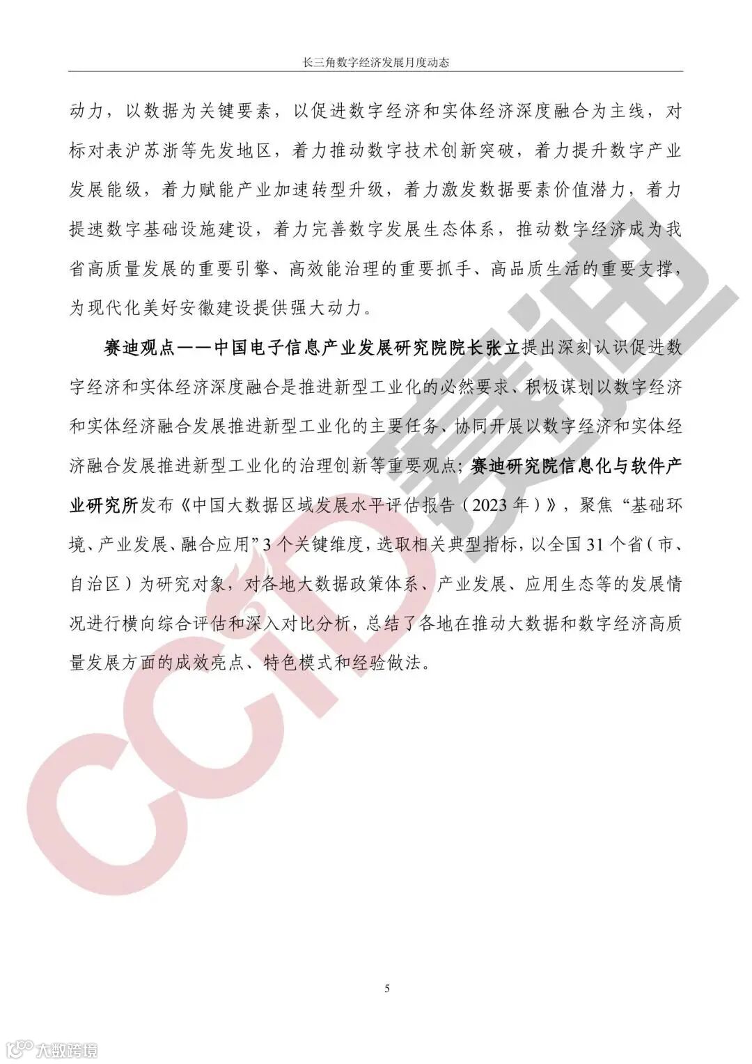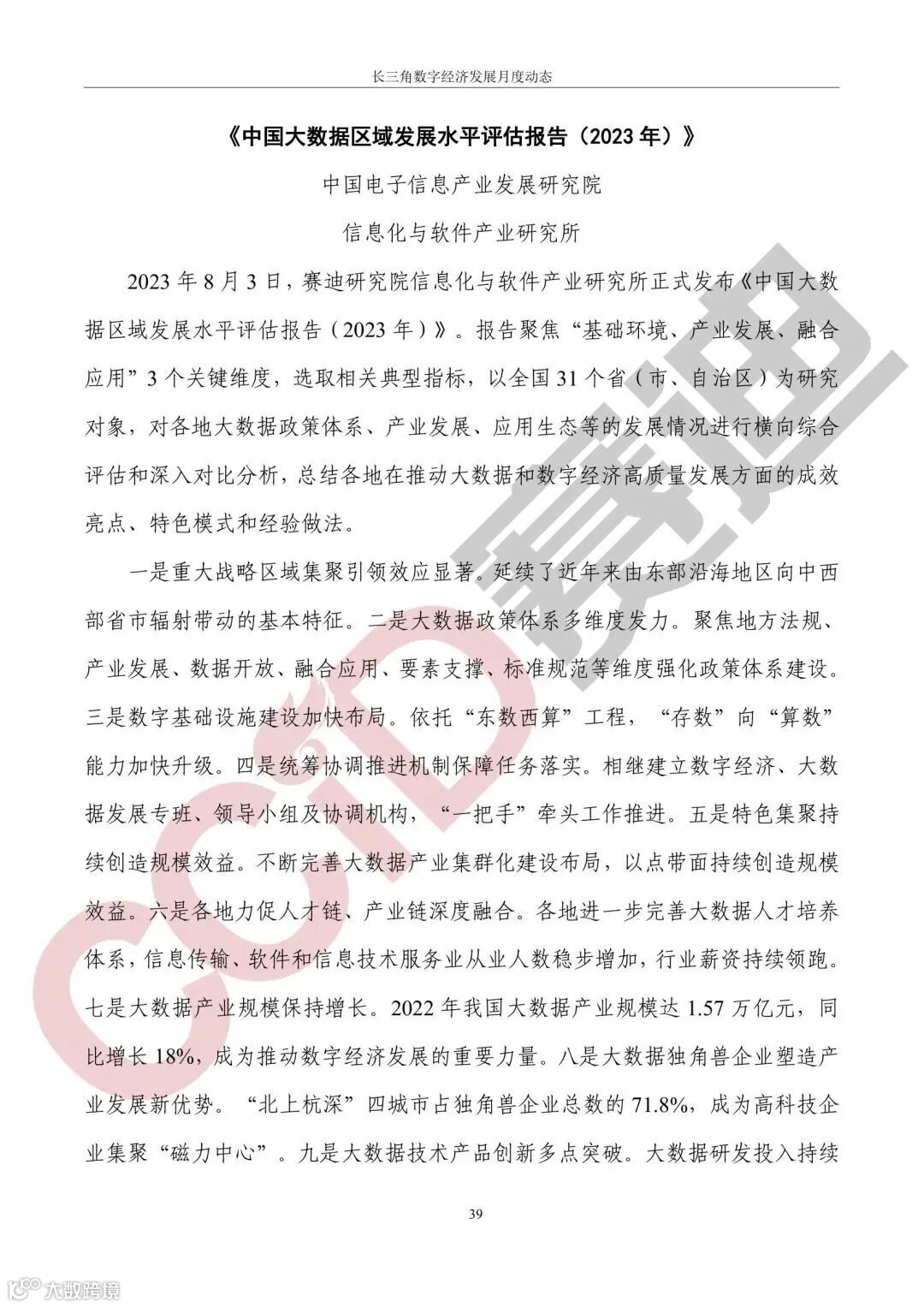 促进数字经济和实体经济深度融合 打造新型工业化关键引擎。中国电子信息产业发展研究院院长张立提出深刻认识促进数字经济和实体经济深度融合是推进新型工业化的必然要求、积极谋划以数字经济和实体经济融合发展推进新型工业化的主要任务、协同开展以数字经济和实体经济融合发展推进新型工业化的治理创新等重要观点;《中国大数据区域发展水平评估报告(2023年)》由赛迪研究院信息化与软件产业研究所发布,聚焦“基础环境、产业发展、融合应用”3个关键维度,选取相关典型指标,以全国31个省(市、自治区)为研究对象,对各地大数据政策体系、产业发展、应用生态等的发展情况进行横向综合评估和深入对比分析,总结了各地在推动大数据和数字经济高质量发展方面的成效亮点、特色模式和经验做法。