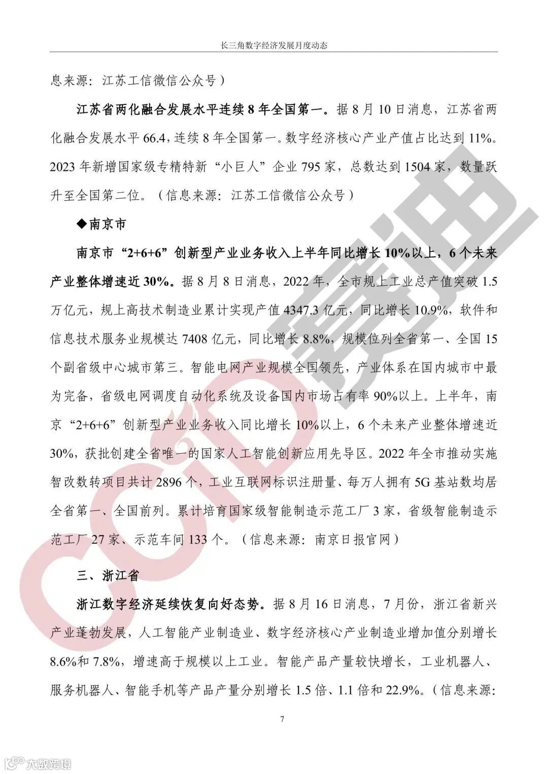 长三角数字经济发展持续向好。上海市临港新片区着力打造“6+2”前沿产业体系,智能新能源汽车产业年产值已突破2300亿元;长电科技等12个重点产业项目开工建设,成立9只前沿产业母基金,形成逾3520亿元的产业基金体系,累计签约前沿产业项目超500个,涉及投资额约5630亿元。江苏省算力产业领跑全国,全省在用数据中心标准机架数近50万架,大型及以上数据中心机架规模占比超80%,智算、超算比例不断增加,综合算力指数位居全国第三;制造业“智改数转”加快推进,2023年已有1.5万家企业启动实施“智改数转”,目前,全省有12家企业入选国家级智能制造示范工厂,3家企业成为全国“数字领航”企业,41个智能制造优秀场景、45个平台创新领航应用案例入选国家级智能制造示范名单,数量均居全国前列;两化融合发展水平66.4,连续8年全国第一。南京市“2+6+6”创新型产业业务收入上半年同比增长10%以上,6个未来产业整体增速近30%。浙江省7月份,人工智能产业制造业、数字经济核心产业制造业增加值分别增长8.6%和7.8%,增速高于规模以上工业。智能产品产量较快增长,工业机器人、服务机器人、智能手机等产品产量分别增长1.5倍、1.1倍和22.9%;温州市7月份,规上工业中,高技术产业、数字经济核心产业制造业、装备制造业增加值分别增长18.4%、16.8%、11.6%,增速分别高于规上工业平均9.5、7.9、2.7个百分点。安徽省合肥市上半年智能网联汽车大数据中心投入试运行,截至目前,共接入新能源车企36家,总计8万余台车;实现对50台智能网联汽车、206个智能路侧设备的实时运行监控。目前合肥市共集聚汽车智能化领域关联企业49家,其中,总部或区域总部在肥企业22家,上市主体在肥企业6家。