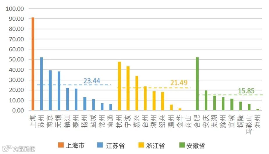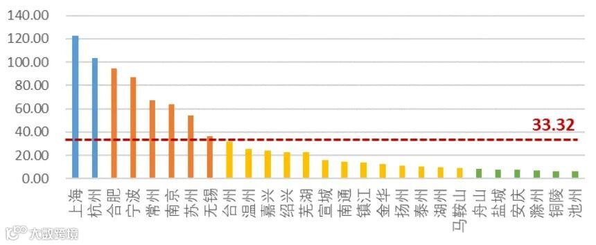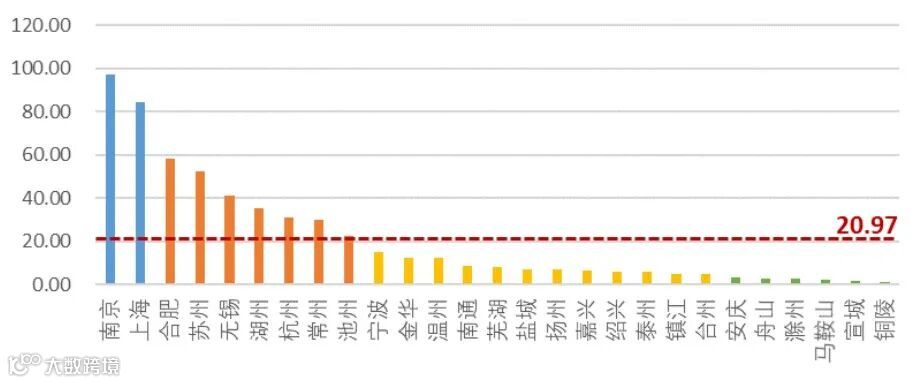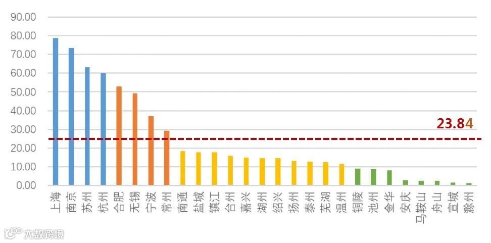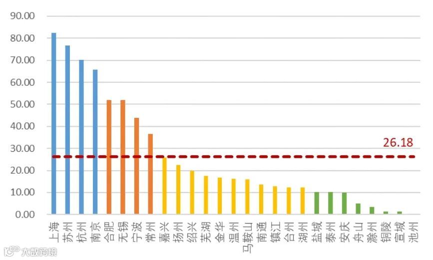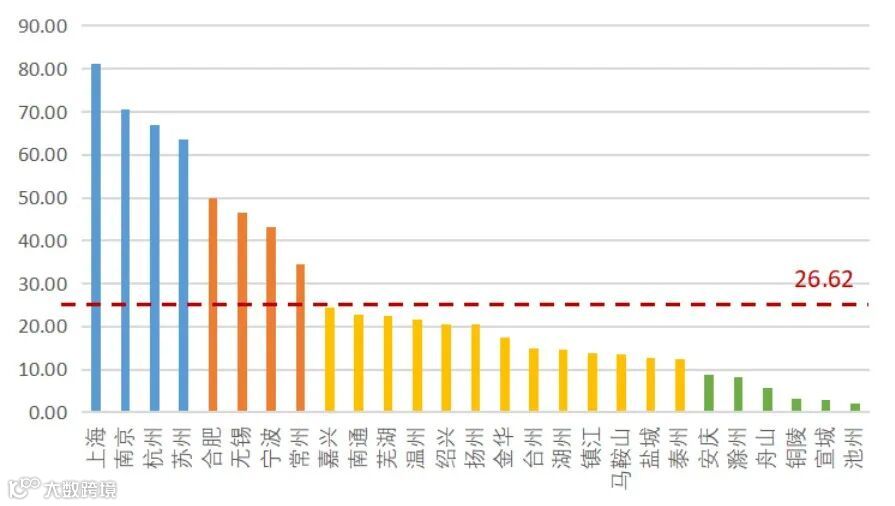 长三角27个中心城市平台建设平均指数为26.18,其中8个城市指数高于平均值。上海、苏州、杭州、南京成为“领头羊”,指数分别达到82.53、76.79、70.28、65.71。合肥、无锡、宁波、常州等4市位列其后,指数在平均值以上,居于第二梯队。嘉兴、扬州、绍兴、芜湖等11个城市指数在10-26.18之间,位于第三梯队,城市间差距相对较小,竞争形势较为激烈。盐城、泰州、安庆、舟山、滁州、铜陵、宣城、池州等8市指数相对较低,均在10以下,处于第四梯队。