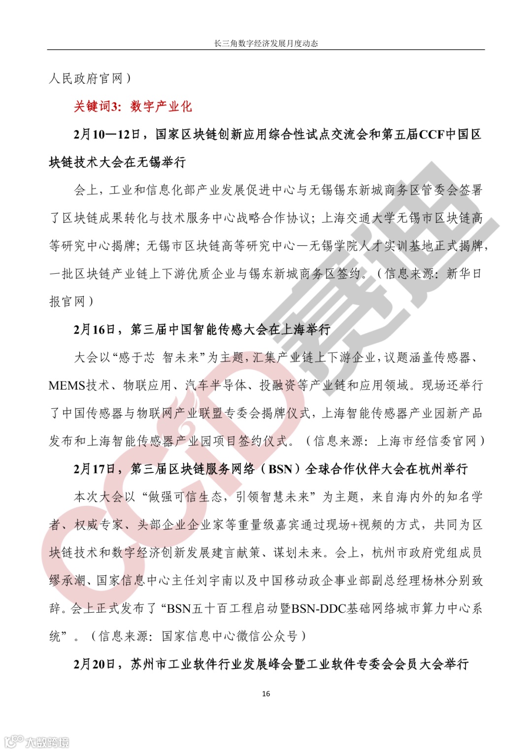 重要会议,2月6日,苏州市数字经济时代产业创新集群融合发展大会召开;2月18日,科创中国数字经济技术创新峰会在上海举行;2月22日,中国(合肥)数字经济创新峰会开幕式暨主论坛举办。产业数字化领域,2月3日,常州市政府数字化转型现场推进会召开;2月17日,镇江市工业和信息化工作会议召开。数字产业化领域,2月10—12日,国家区块链创新应用综合性试点交流会和第五届CCF中国区块链技术大会在无锡举行;2月16日,第三届中国智能传感大会在上海举行;2月17日,第三届区块链服务网络(BSN)全球合作伙伴大会在杭州举行;2月20日,苏州市工业软件行业发展峰会暨工业软件专委会会员大会举行。