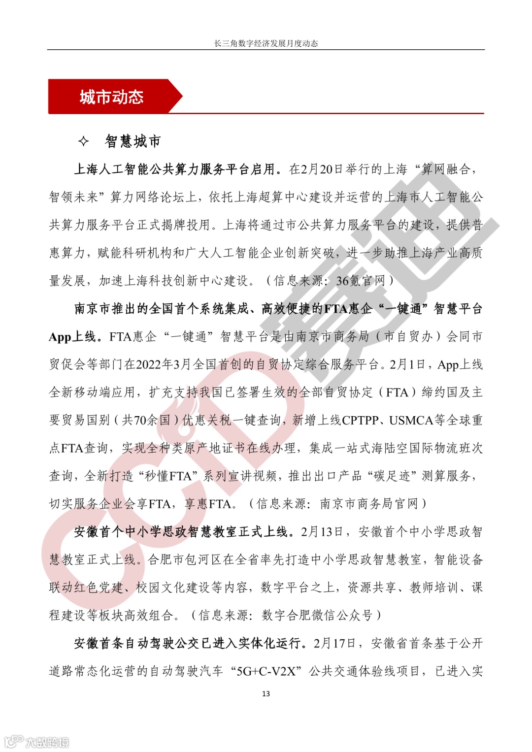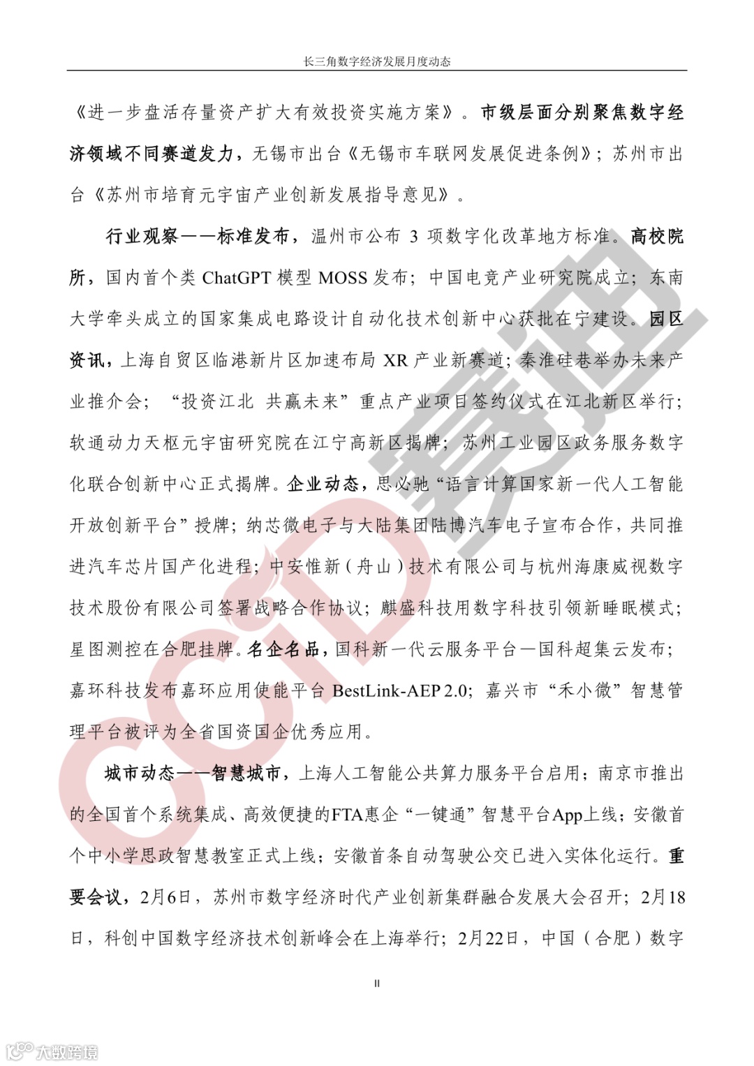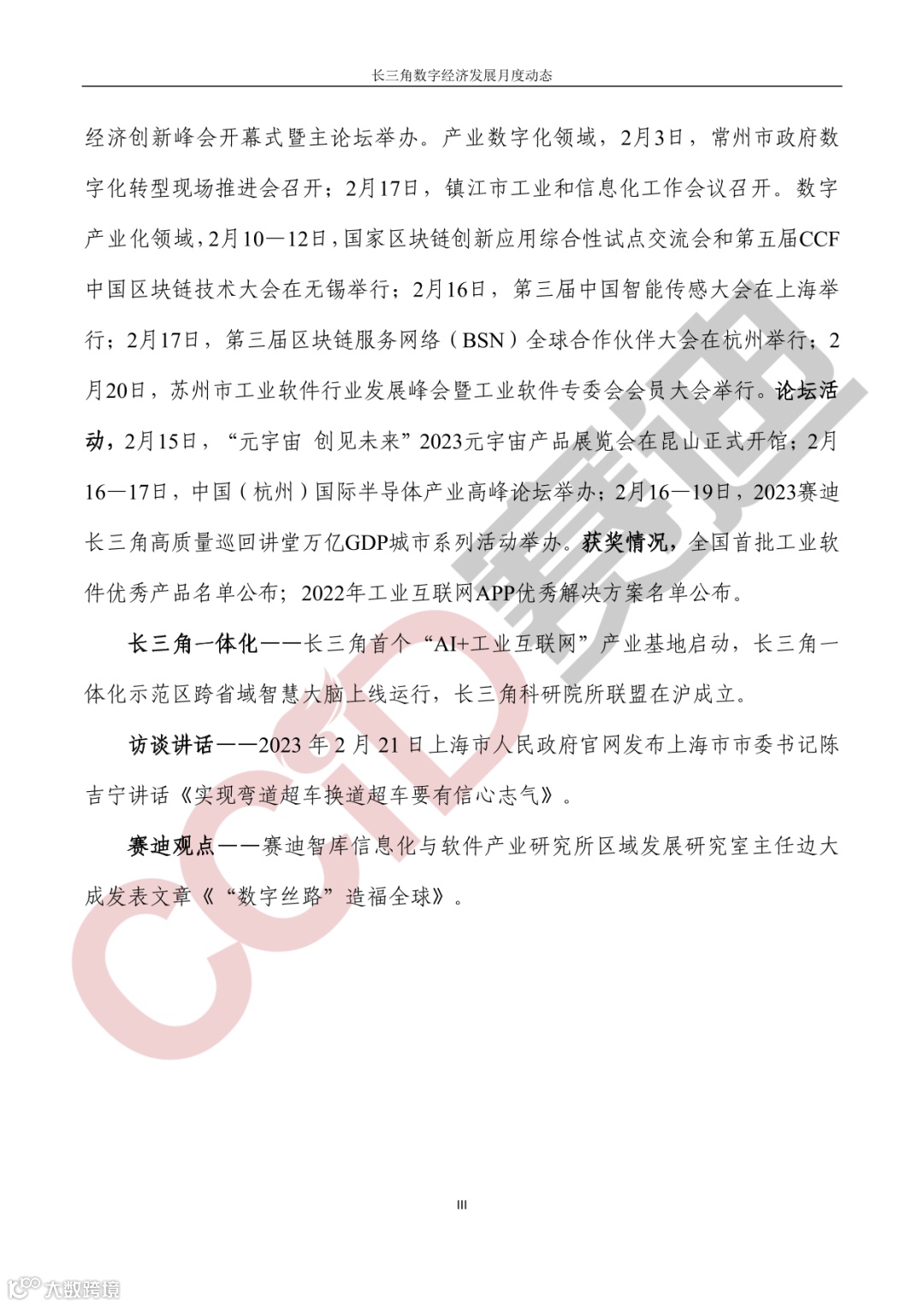《长三角数字经济发展月度动态》2023年第2期来啦!本刊物由赛迪数字经济研究中心创办,重点聚焦《长江三角洲区域一体化发展规划纲要》中涵盖的27个中心区城市,以数字经济相关领域月度主要发展动态为主题,从数据洞察、政策汇集、行业观察、城市动态、长三角一体化、访谈讲话、赛迪观点等多个维度展现长三角数字经济的区域发展态势,进而为地方关切提供参考依据,助力地方经济社会发展。