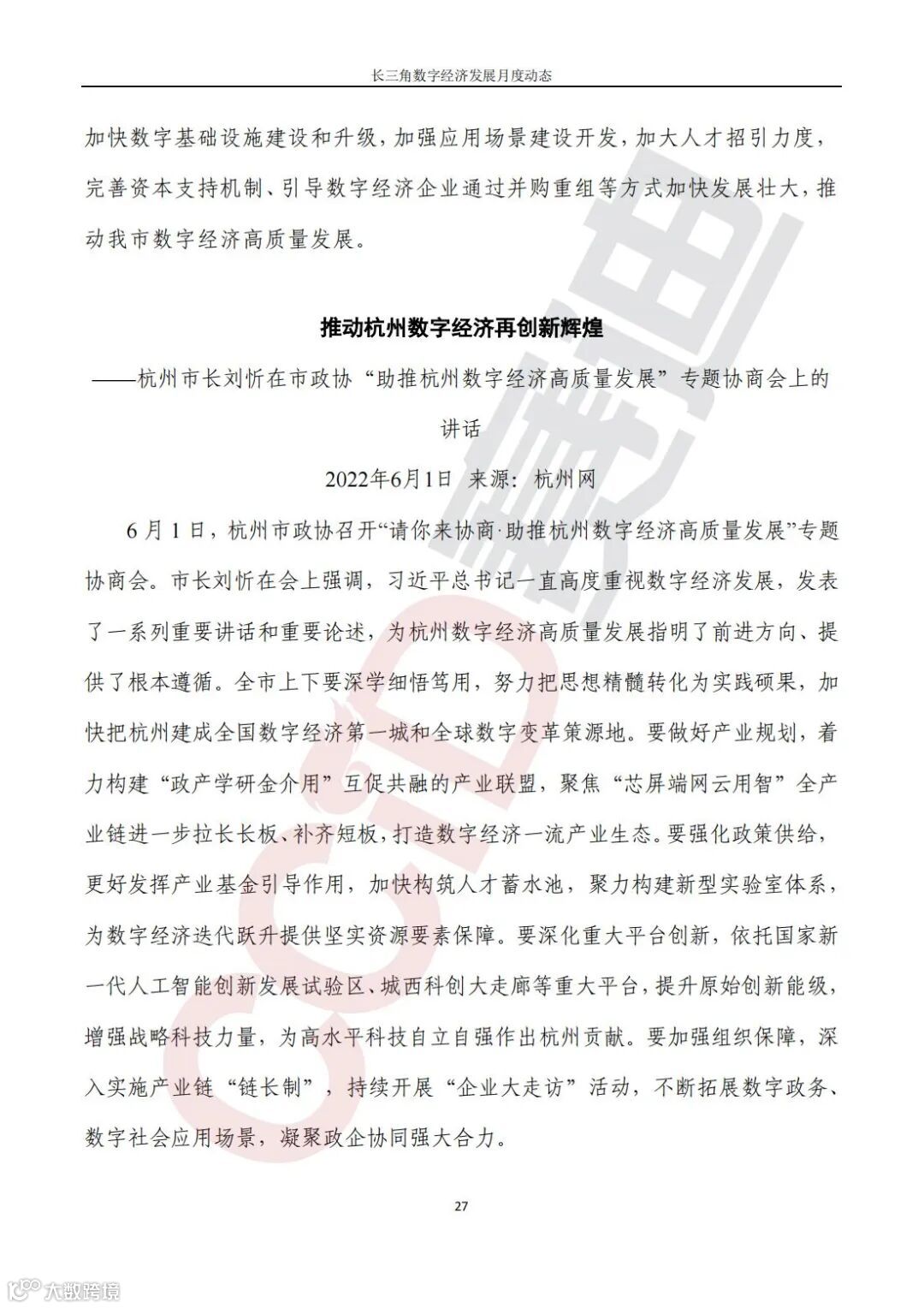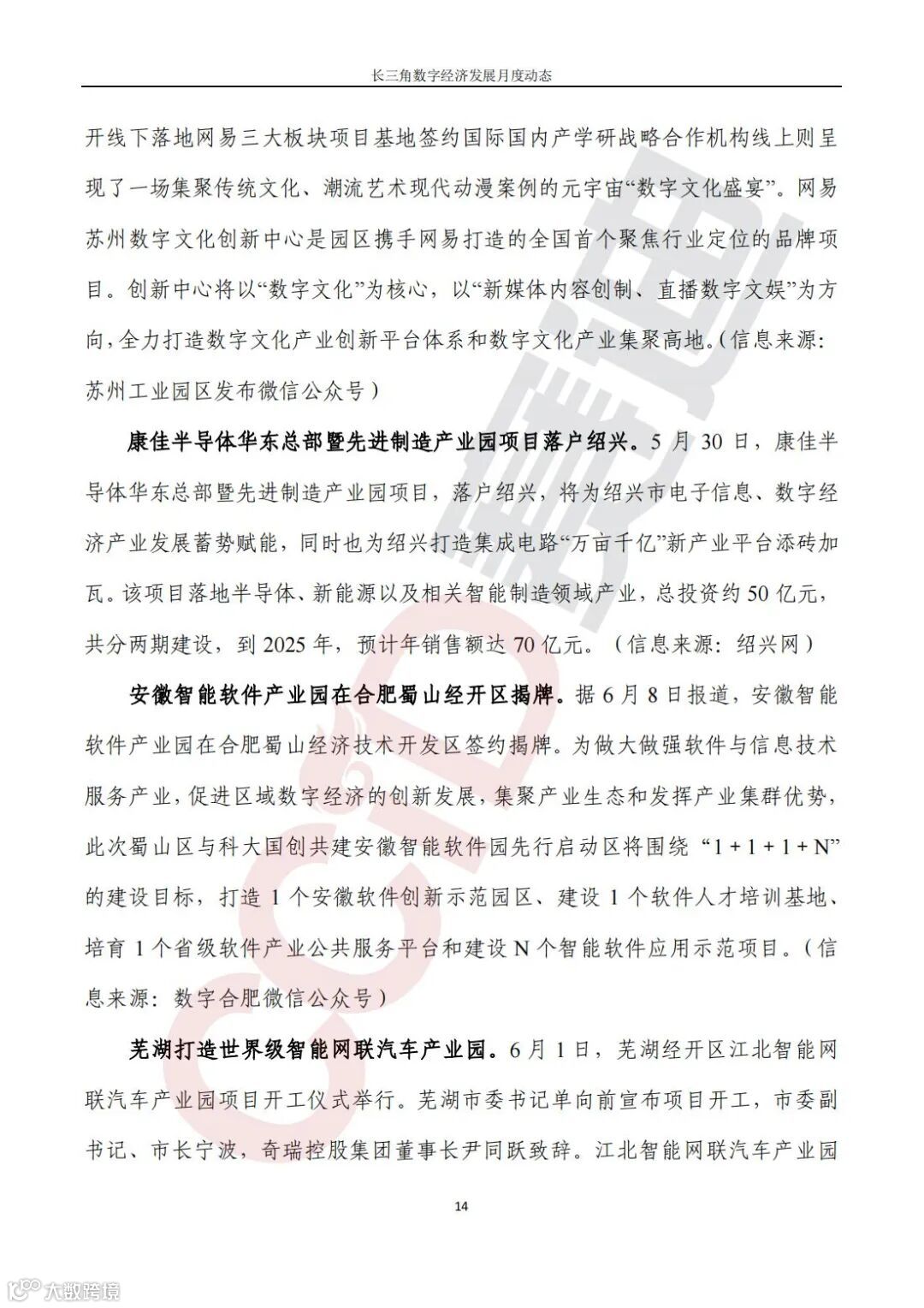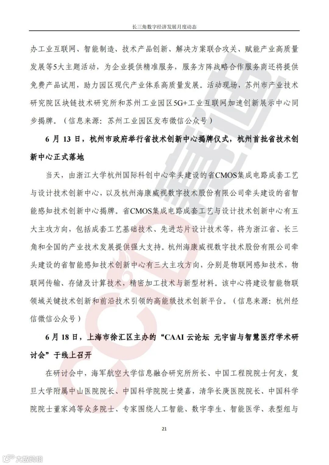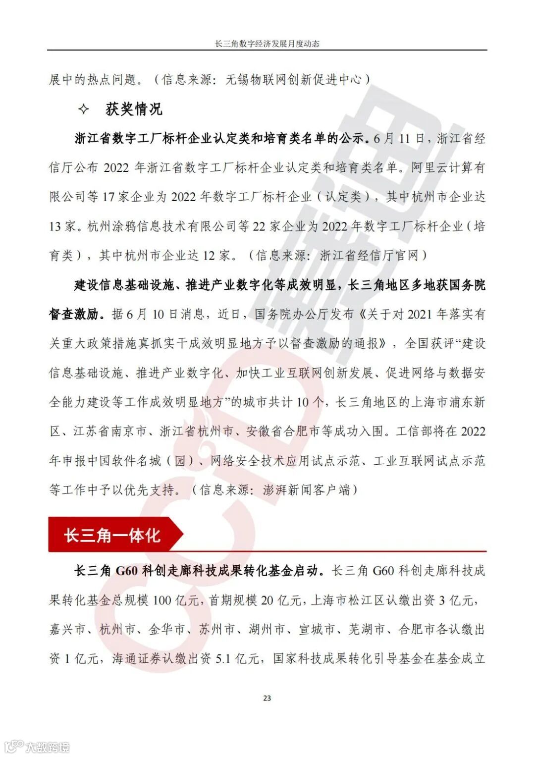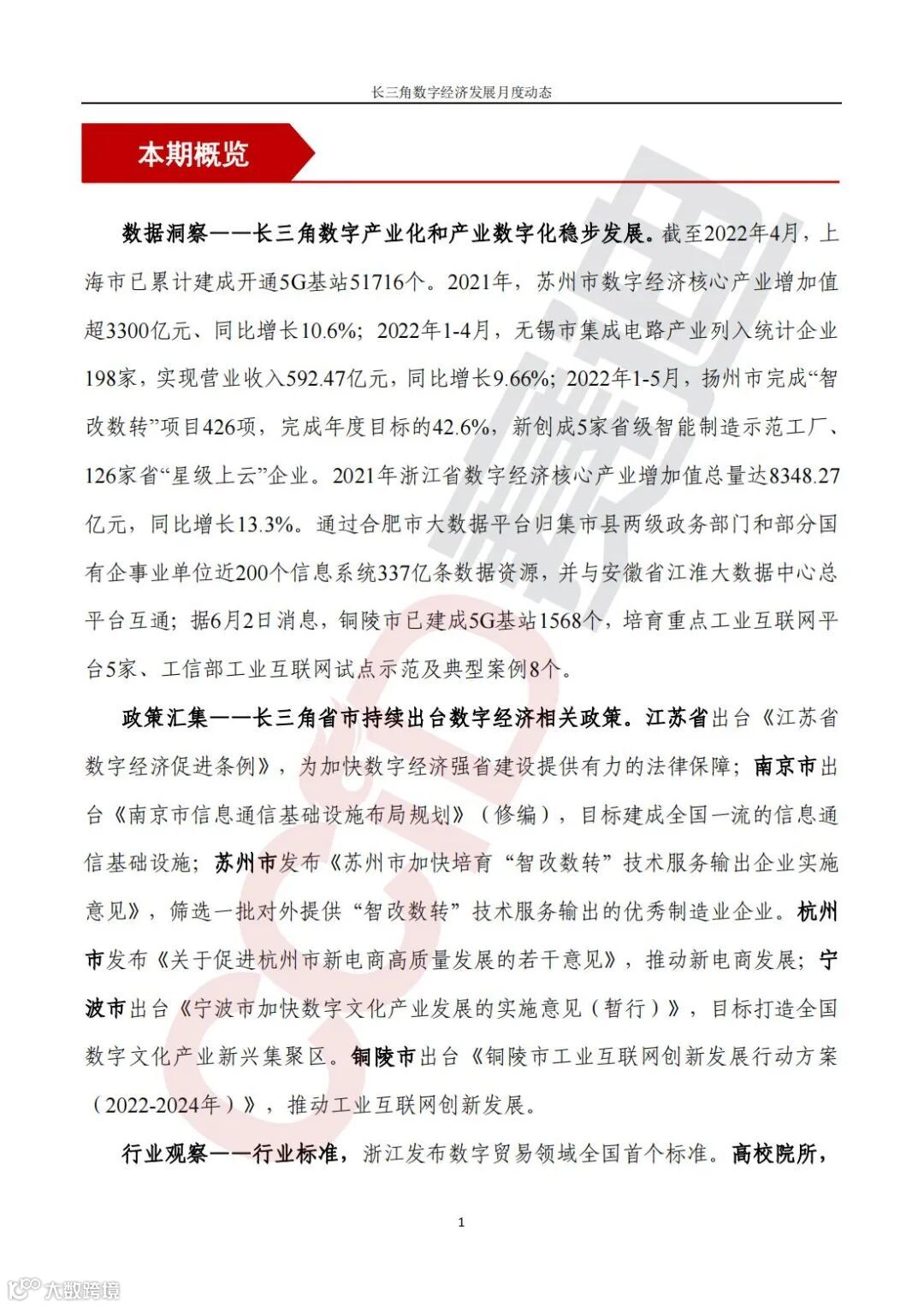 《长三角数字经济发展月度动态》2022年第6期来啦!本刊物由赛迪数字经济研究中心创办,重点聚焦《长江三角洲区域一体化发展规划纲要》中涵盖的27个中心区城市,以数字经济相关领域月度主要发展动态为主题,从数据洞察、政策汇集、行业观察、城市动态、长三角一体化、访谈讲话、赛迪观点等多个维度展现长三角数字经济的区域发展态势,进而为地方关切提供参考依据,助力地方经济社会发展。