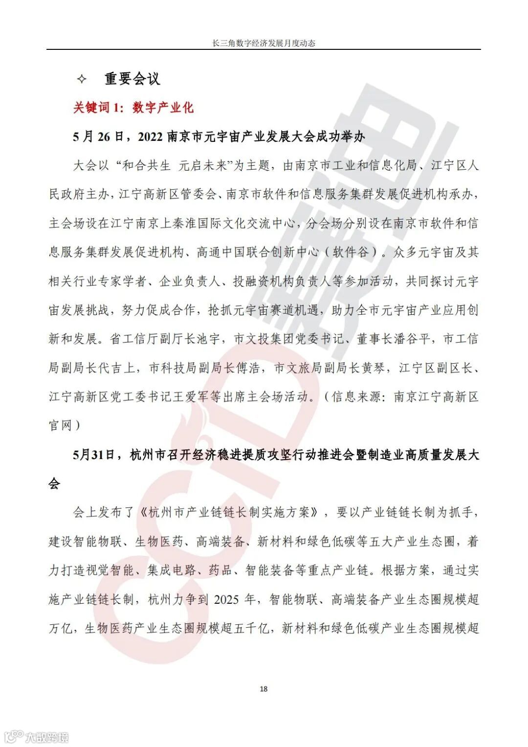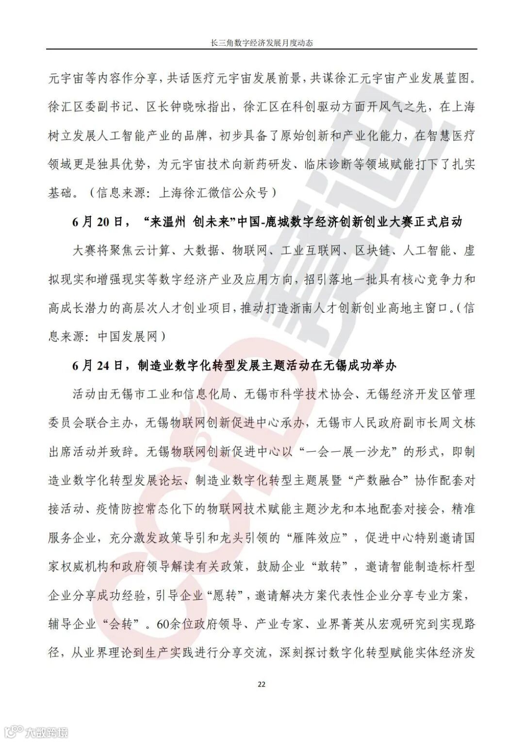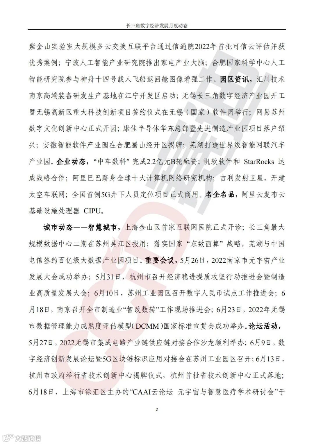 重要会议,5月26日,2022南京市元宇宙产业发展大会成功举办;5月31日,杭州市召开经济稳进提质攻坚行动推进会暨制造业高质量发展大会;6月10日,苏州工业园区召开数字人民币试点工作推进会;6月18日,南京召开全市制造业“智改数转”工作现场推进会;6月23日,2022年无锡市数据管理能力成熟度评估模型(DCMM)国家标准宣贯会成功举办。