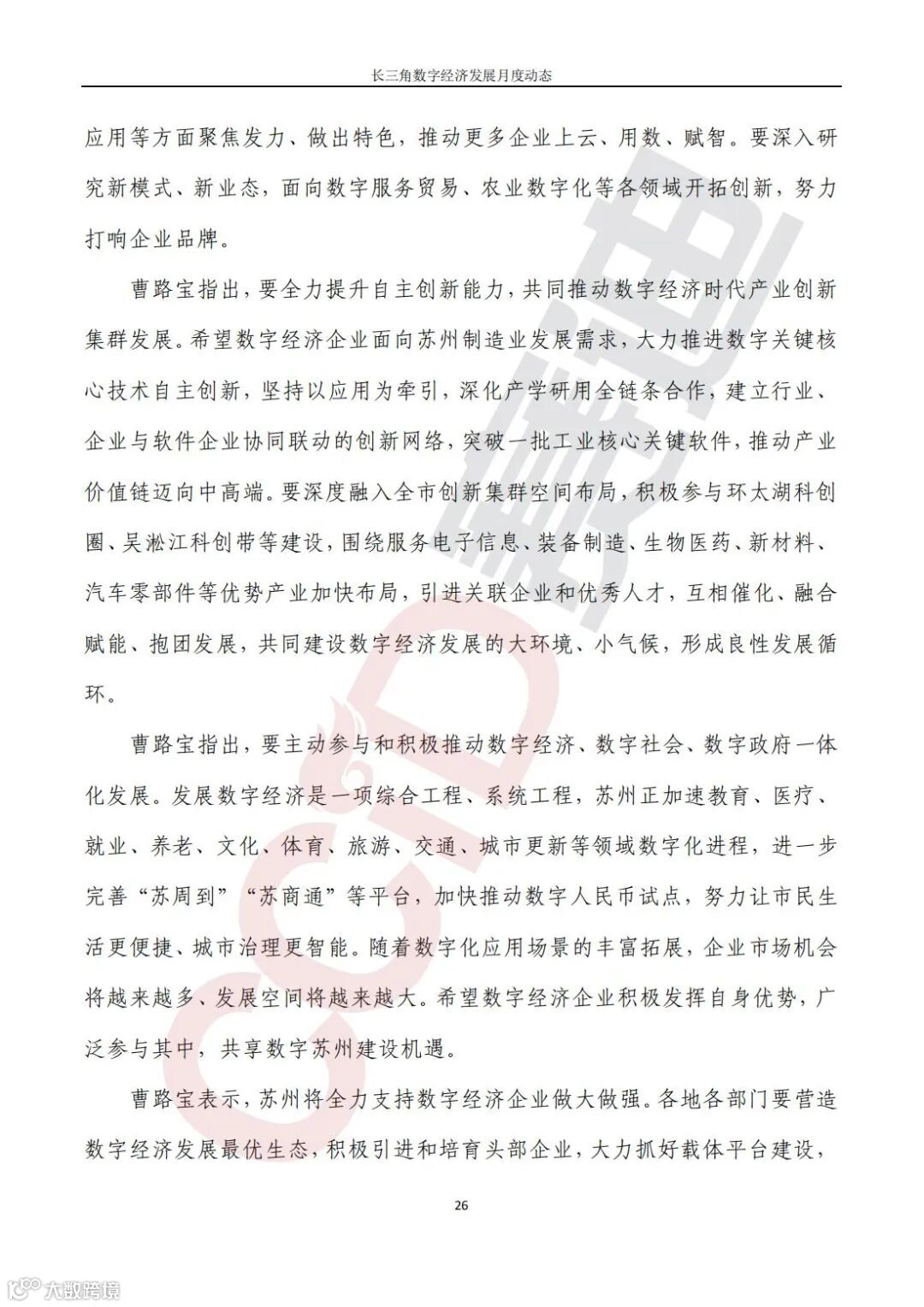 苏州市委书记曹路宝在数字经济企业座谈会上强调,要充分发挥苏州实体经济优势,加快做强做优做大数字经济;杭州市长刘忻在市政协“助推杭州数字经济高质量发展”专题协商会上指出,加快把杭州建成全国数字经济第一城和全球数字变革策源地,提出要做好产业规划,强化政策供给,深化重大平台创新,加强组织保障。