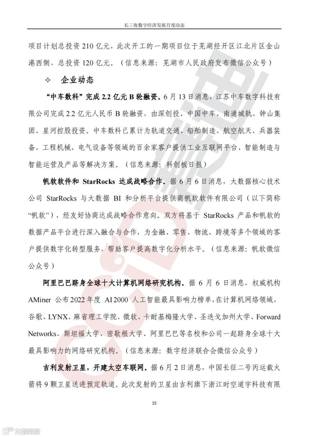 企业动态,“中车数科”完成2.2亿元B轮融资;帆软软件和 StarRocks 达成战略合作;阿里巴巴跻身全球十大计算机网络研究机构;吉利发射卫星,开建太空车联网;全国首例5G井下人员定位项目正式商用。