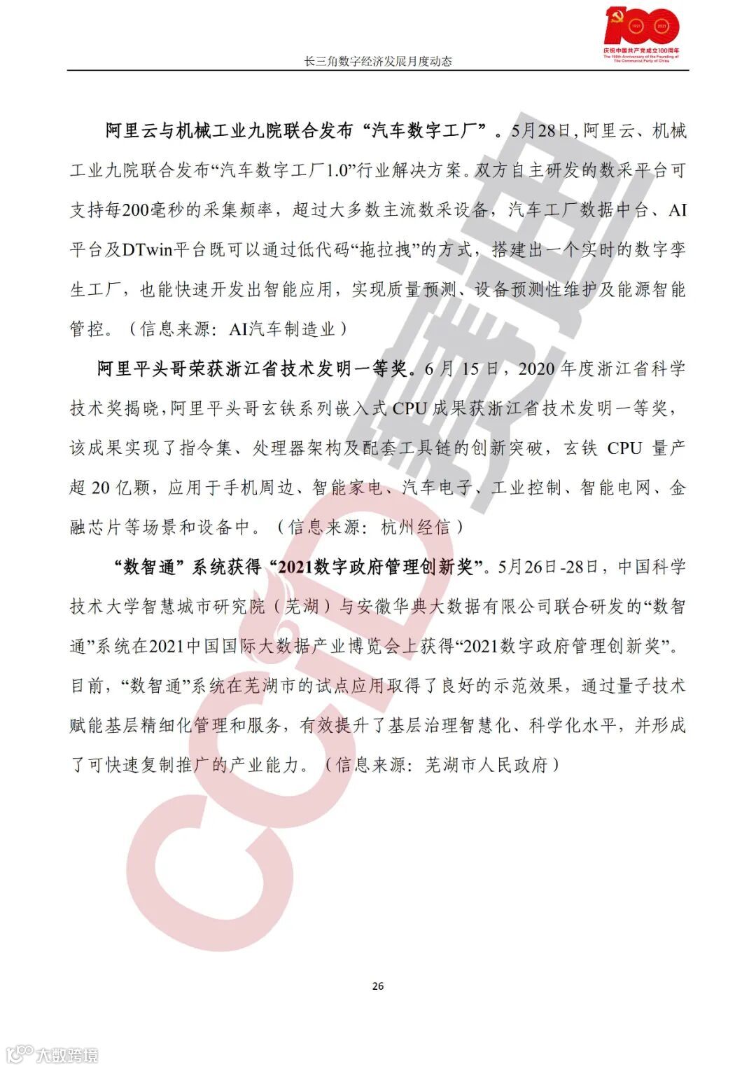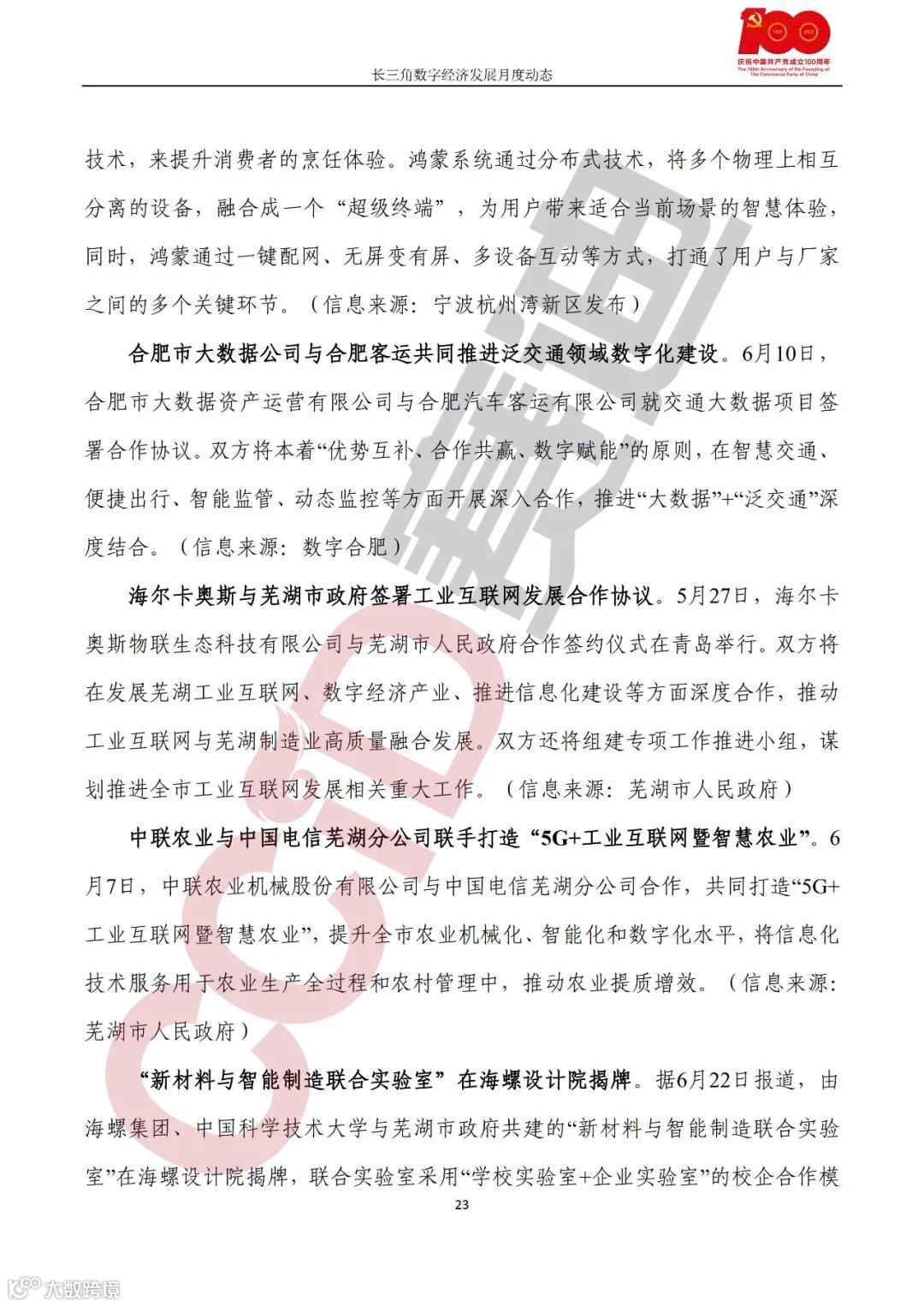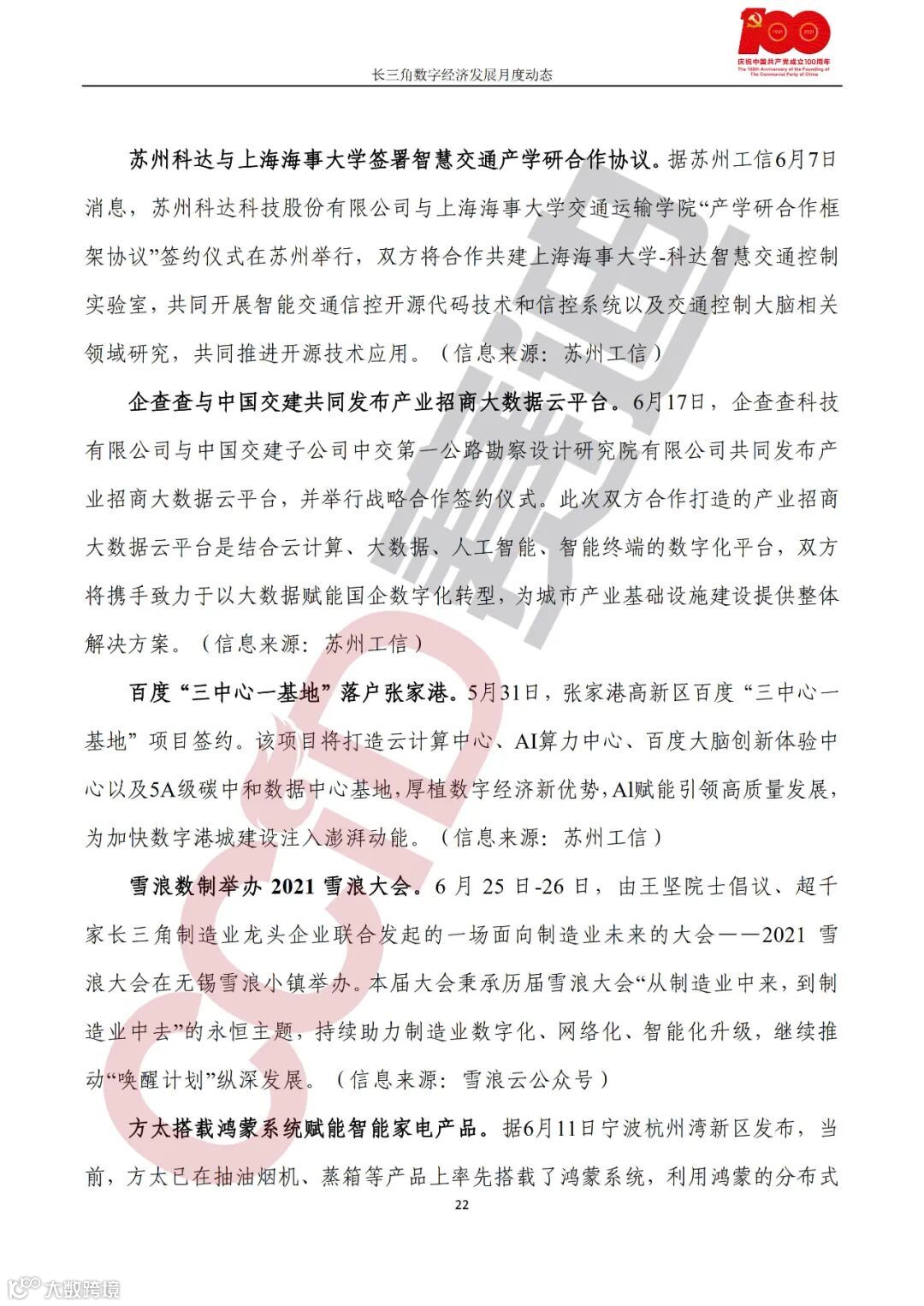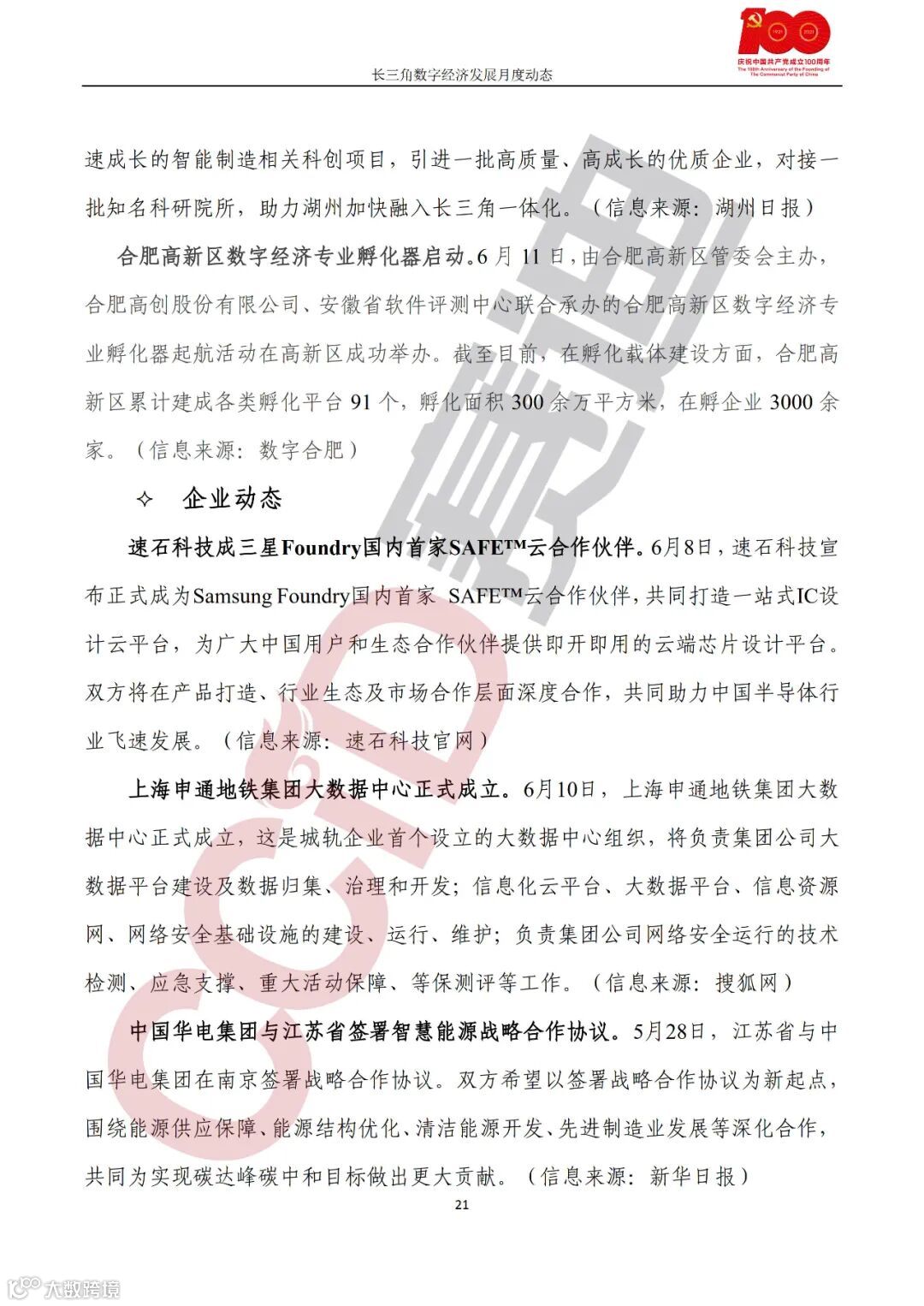企业动态,速石科技成三星Foundry国内首家SAFE™云合作伙伴;上海申通地铁集团大数据中心正式成立;中国华电集团与江苏省签署智慧能源战略合作协议;苏州科达与上海海事大学签署智慧交通产学研合作协议;企查查与中国交建共同发布产业招商大数据云平台;百度“三中心一基地”落户张家港;雪浪数制举办2021雪浪大会;方太搭载鸿蒙系统赋能智能家电产品;合肥市大数据公司与合肥客运共同推进泛交通领域数字化建设;海尔卡奥斯与芜湖市政府签署工业互联网发展合作协议;中联农业与中国电信芜湖分公司联手打造“5G+工业互联网暨智慧农业”;“新材料与智能制造联合实验室”在海螺设计院揭牌。