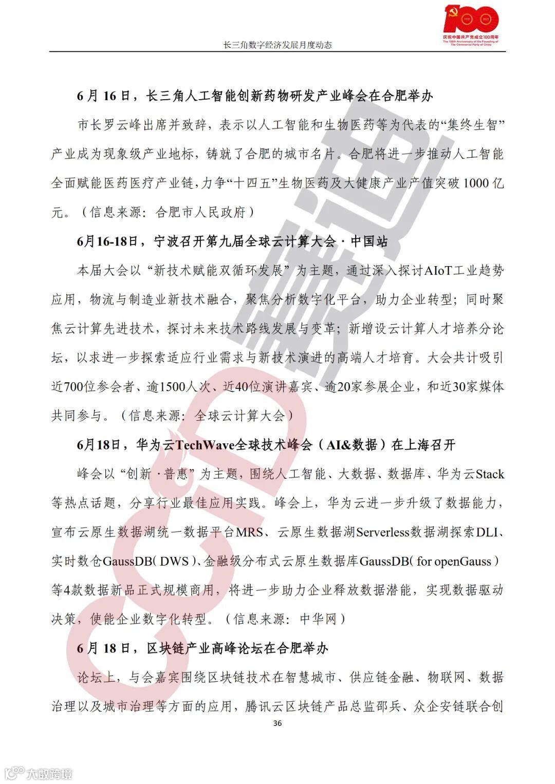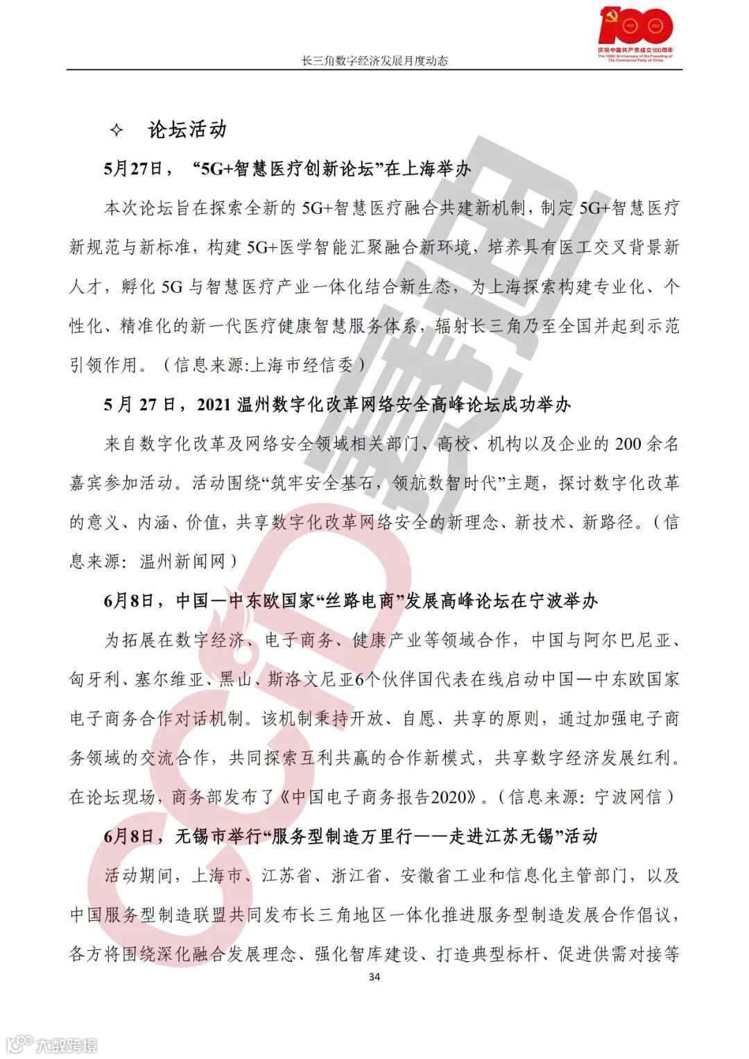 论坛活动,“5G+智慧医疗创新论坛”在上海举办;2021温州数字化改革网络安全高峰论坛成功举办;中国—中东欧国家“丝路电商”发展高峰论坛在宁波举办;无锡市举行“服务型制造万里行——走进江苏无锡”活动;“数字新外贸跨境新业态”浙江国际数字贸易峰会在宁波举行;上海市召开2021长三角设备智能运维经验交流大会;2021中国(宁波)集成电路产业生态论坛举行;长三角人工智能创新药物研发产业峰会在合肥举办;宁波召开第九届全球云计算大会·中国站;华为云TechWave全球技术峰会(AI&数据)在上海召开;区块链产业高峰论坛在合肥举办;首届RISC-V中国峰会在上海召开;2021中国人工智能峰会在南京开幕;长三角光通信行业高峰论坛暨CFCF2021光连接博览会在苏州开幕。