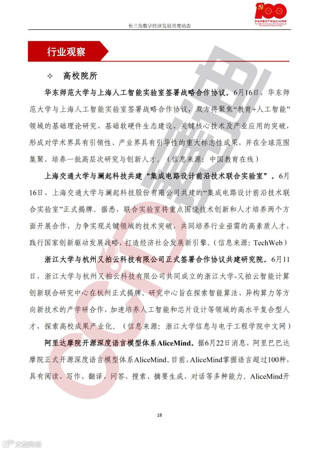 高校院所,华东师范大学与上海人工智能实验室签署战略合作协议;上海交通大学与澜起科技共建“集成电路设计前沿技术联合实验室”;浙江大学与杭州又拍云科技有限公司共建研究院;阿里达摩院开源深度语言模型体系AliceMind;宁波标准区块链产业发展研究院与复旦大学智慧城市研究中心、链城数字科技有限公司签署战略合作协议;温州市数字经济产业人才学院落户;中科大首次实现多模式量子中继。