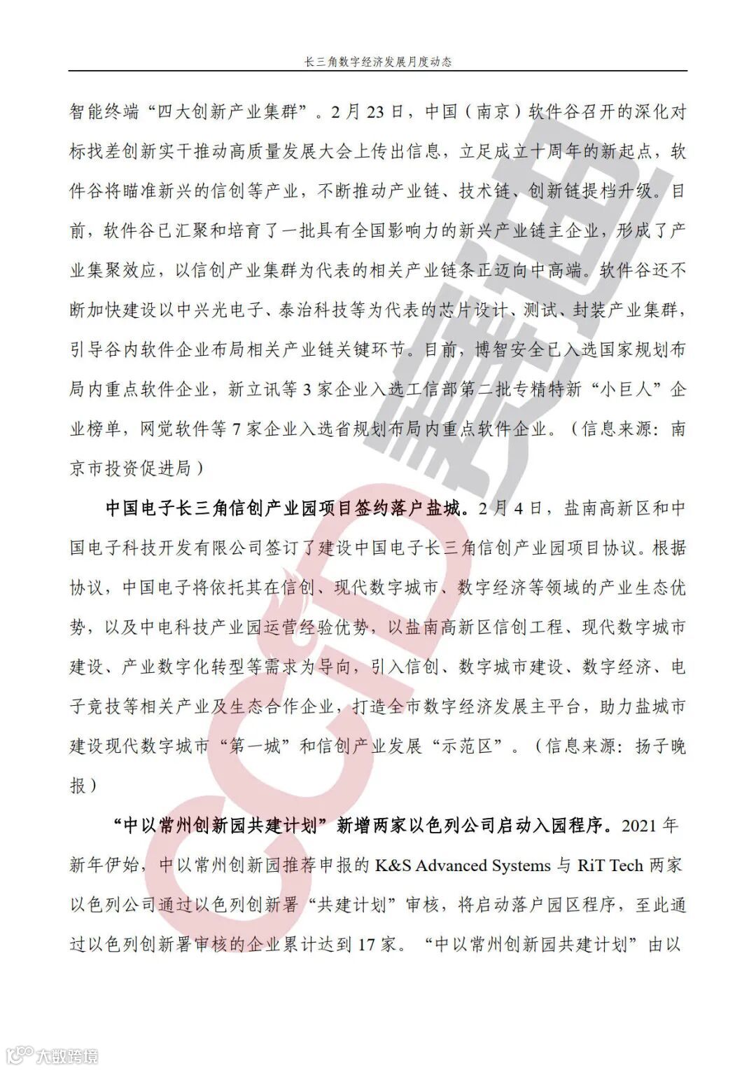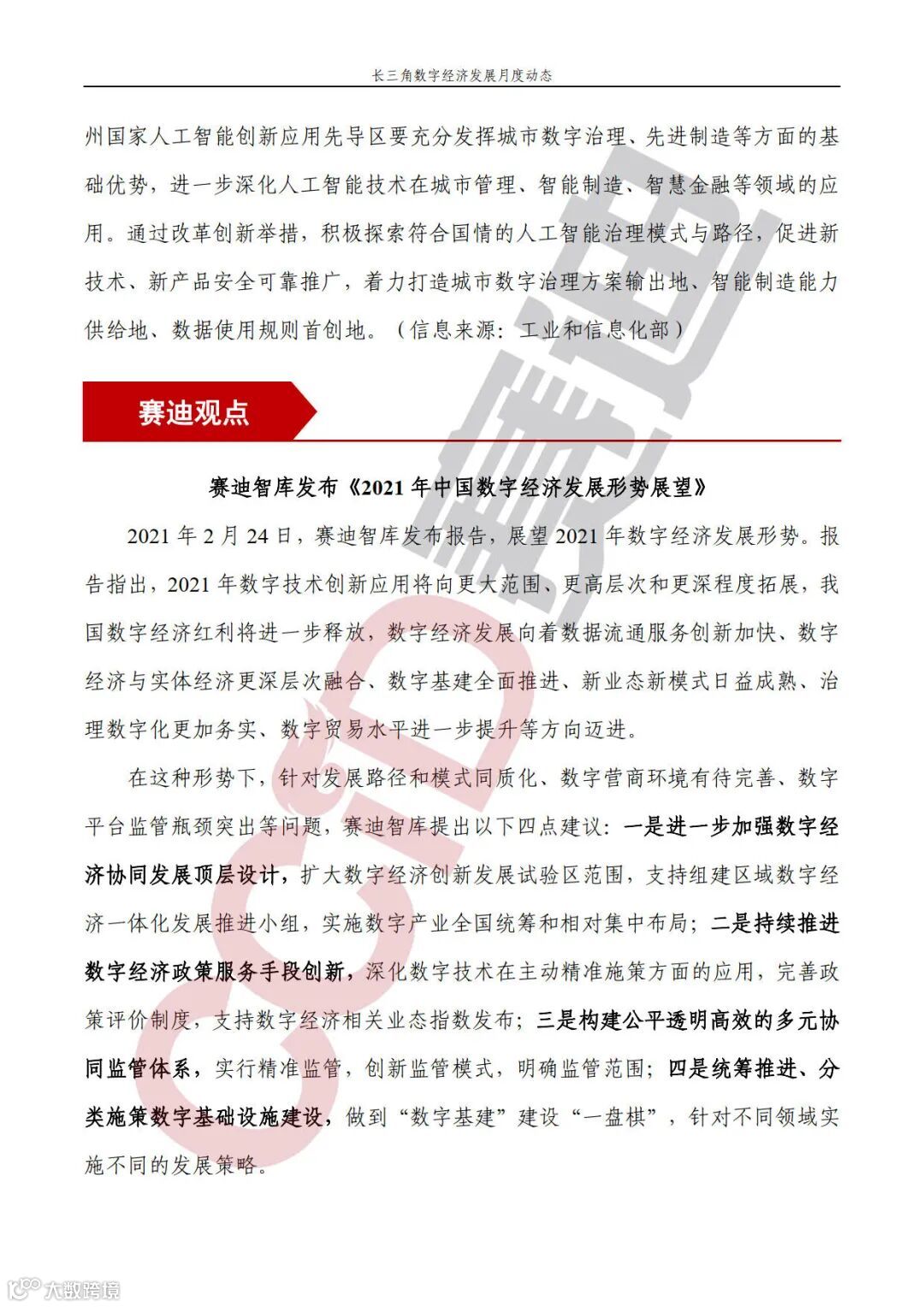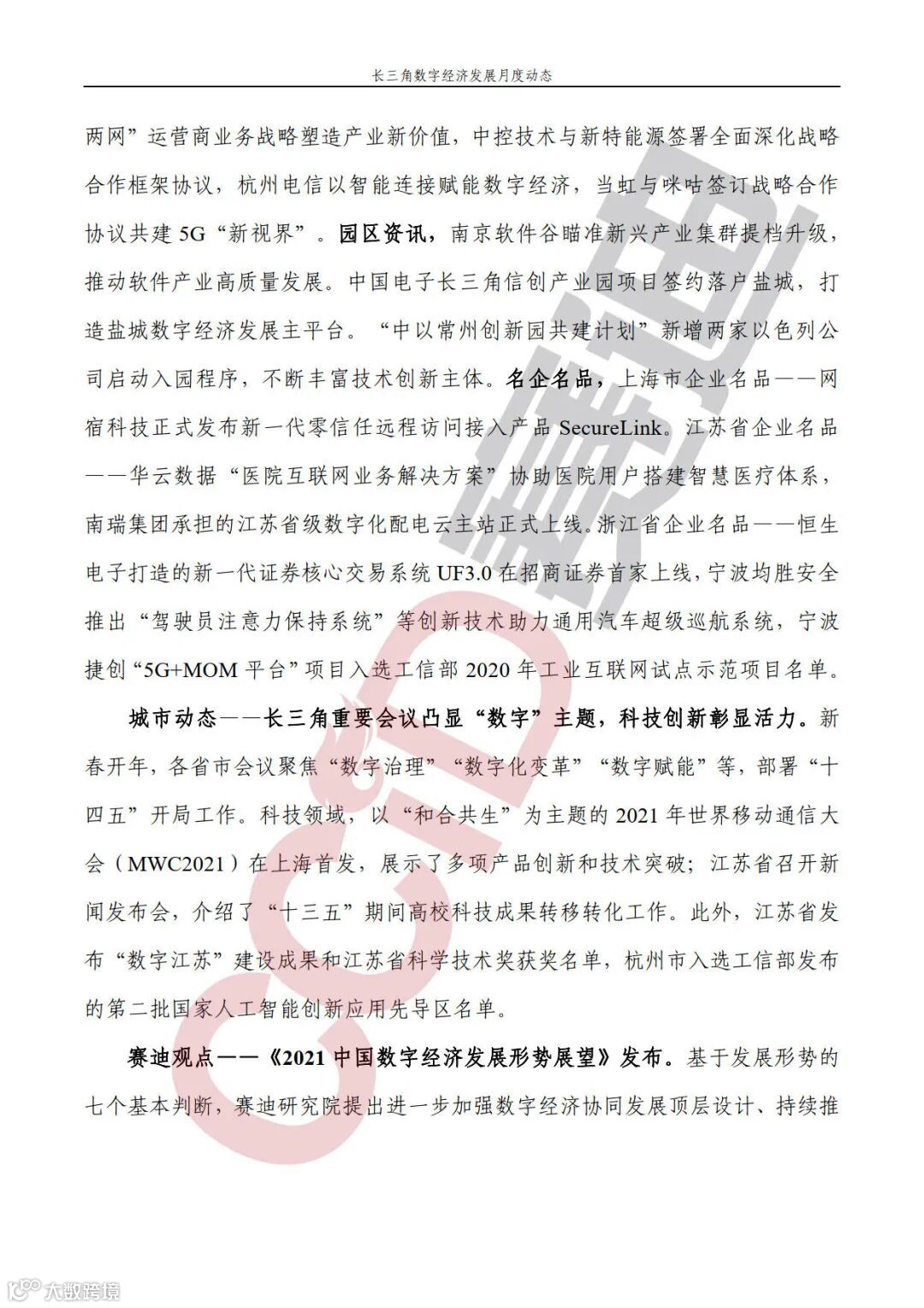 《长三角数字经济发展月度动态》2021年第2期来啦!本刊物由赛迪数字经济研究中心创办,重点聚焦《长江三角洲区域一体化发展规划纲要》中涵盖的27个中心区城市,以数字经济相关领域月度主要发展动态为主题,从数据洞察、政策汇集、行业观察、城市动态、赛迪观点等多个维度展现长三角数字经济的区域发展态势,进而为地方关切提供参考依据,助力地方经济社会发展。