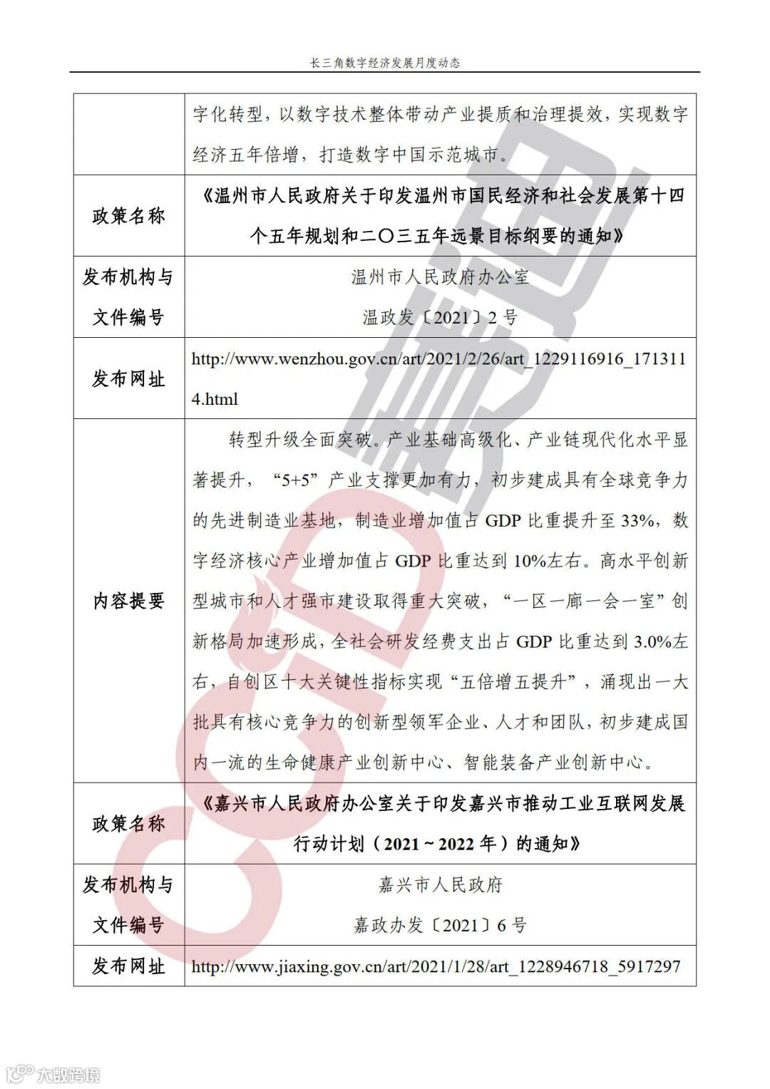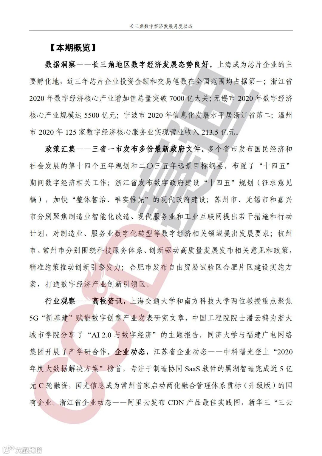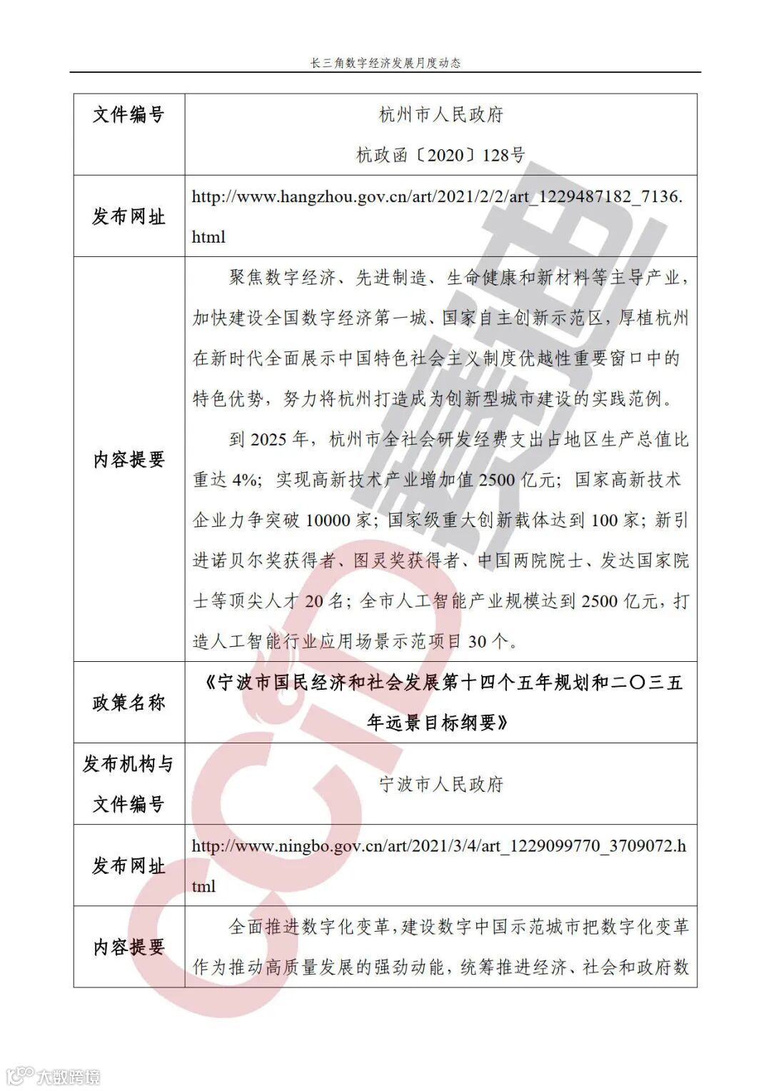 政策汇集——三省一市发布多份最新政府文件。多个省市发布国民经济和社会发展的第十四个五年规划和二〇三五年远景目标纲要,布置了“十四五”期间数字经济相关工作;浙江省发布数字政府建设“十四五”规划(征求意见稿),加快“整体智治、唯实惟先”的现代政府建设;苏州市、无锡市和嘉兴市分别聚焦制造业智能化改造、现代服务业和工业互联网提出若干措施和行动计划,对制造业、服务业数字化转型等数字经济相关领域提出发展要求;杭州市、常州市分别围绕科技服务体系、创新驱动高质量发展发布相关意见和政策,精准施策推动创新引擎发力;合肥市发布自由贸易试验区合肥片区建设实施方案,打造数字经济产业创新引领区。