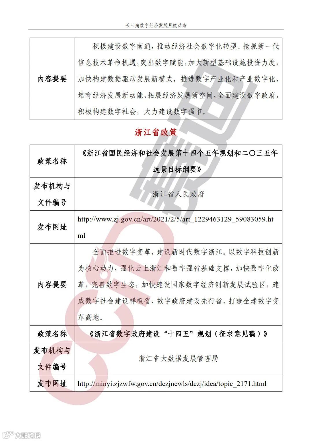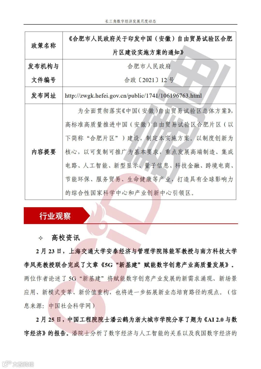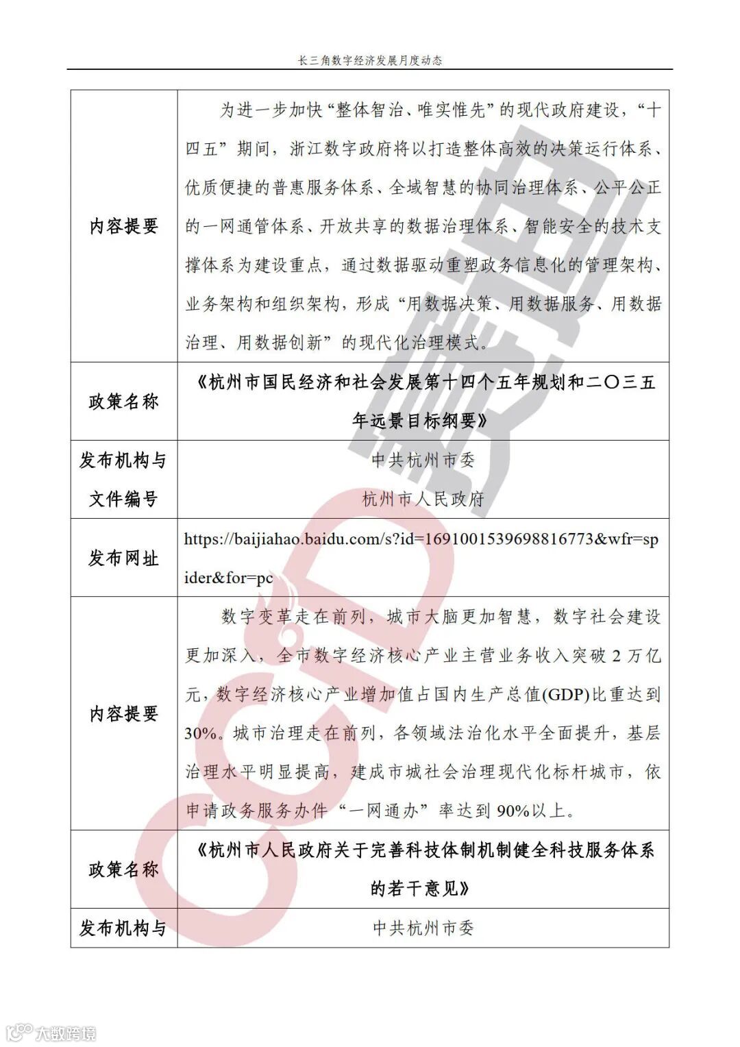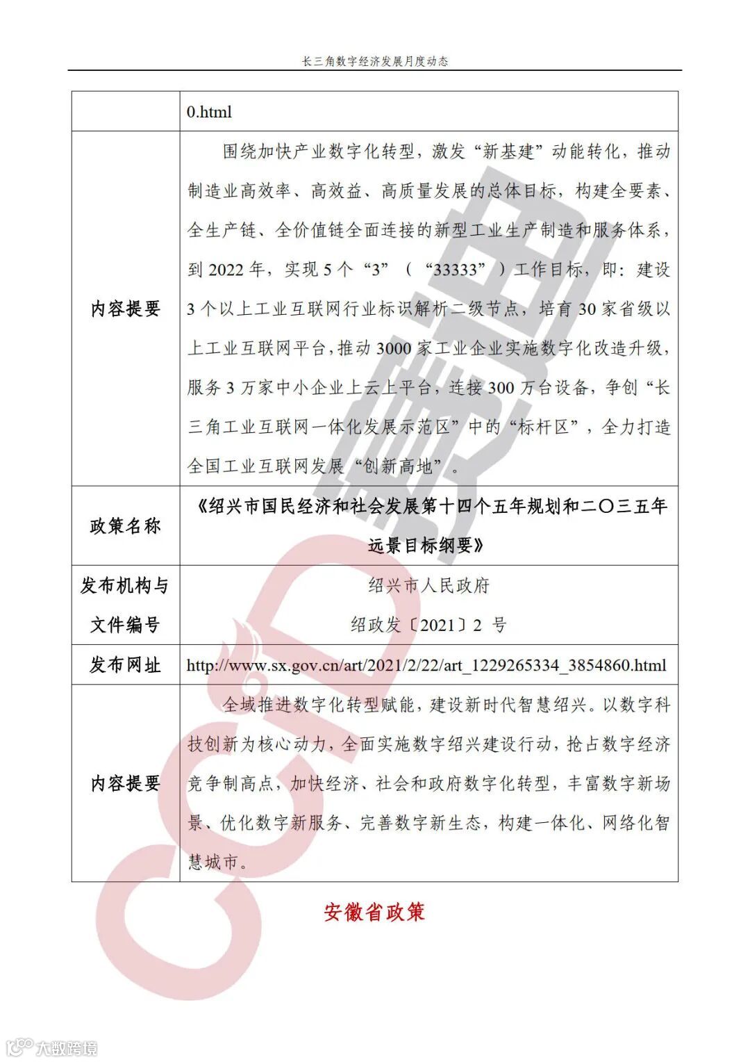 政策汇集——三省一市发布多份最新政府文件。多个省市发布国民经济和社会发展的第十四个五年规划和二〇三五年远景目标纲要,布置了“十四五”期间数字经济相关工作;浙江省发布数字政府建设“十四五”规划(征求意见稿),加快“整体智治、唯实惟先”的现代政府建设;苏州市、无锡市和嘉兴市分别聚焦制造业智能化改造、现代服务业和工业互联网提出若干措施和行动计划,对制造业、服务业数字化转型等数字经济相关领域提出发展要求;杭州市、常州市分别围绕科技服务体系、创新驱动高质量发展发布相关意见和政策,精准施策推动创新引擎发力;合肥市发布自由贸易试验区合肥片区建设实施方案,打造数字经济产业创新引领区。