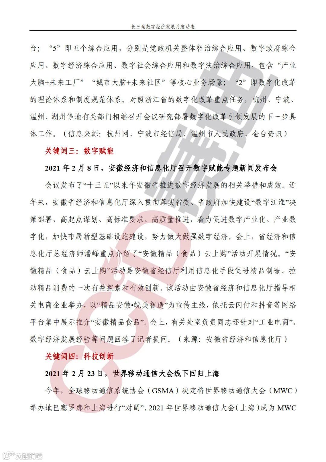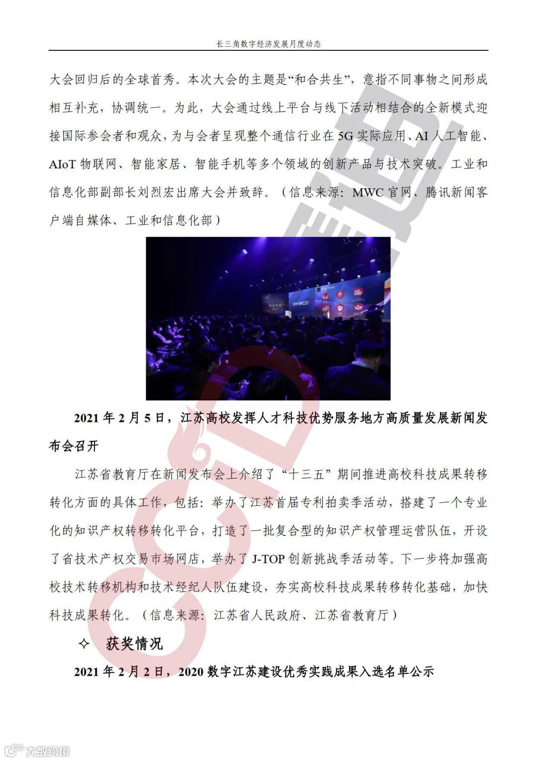城市动态——长三角重要会议凸显“数字”主题,科技创新彰显活力。新春开年,各省市会议聚焦“数字治理”“数字化变革”“数字赋能”等,部署“十四五”开局工作。科技领域,以“和合共生”为主题的2021年世界移动通信大会(MWC2021)在上海首发,展示了多项产品创新和技术突破;江苏省召开新闻发布会,介绍了“十三五”期间高校科技成果转移转化工作。此外,江苏省发布“数字江苏”建设成果和江苏省科学技术奖获奖名单,杭州市入选工信部发布的第二批国家人工智能创新应用先导区名单。