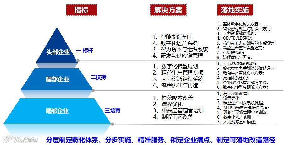 另一方面按体量把企业分为头部、腰部和尾部企业,通过行业专家线下全价值链深度诊断,“一企一策,因企制宜”的为企业制定解决方案和可落地的实施路径,助力企业精准转型升级。