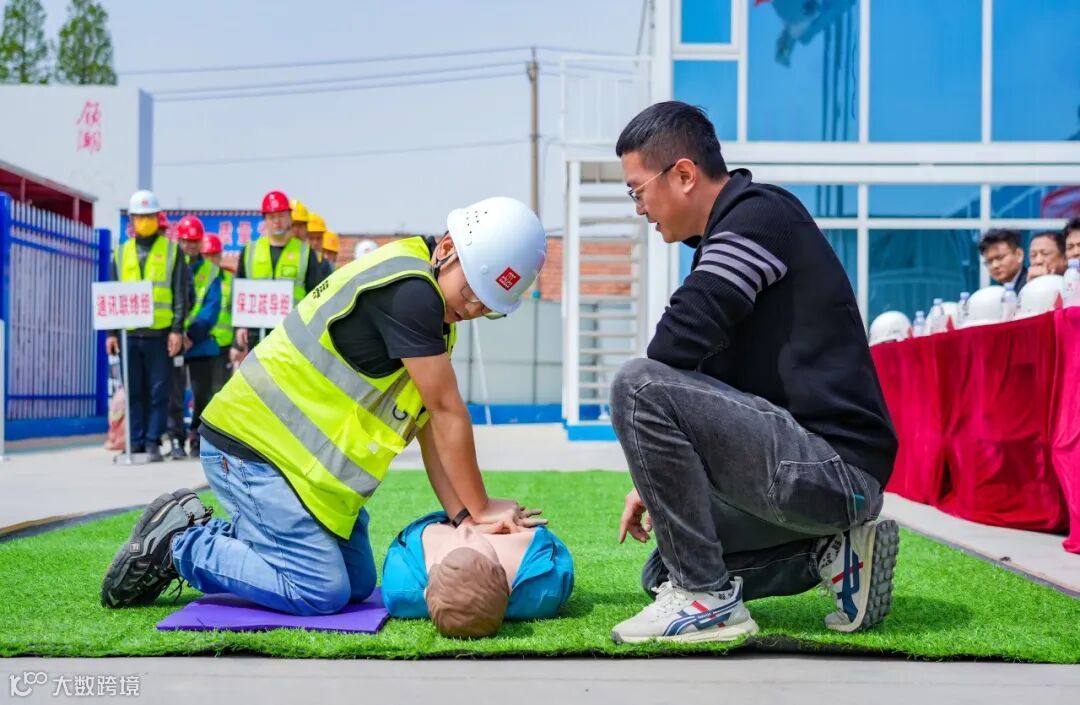 演练设定场景为施工材料堆放区突发火情,项目指挥部在接报后立即启动“135”应急机制:1分钟内完成现场警戒,3分钟内展开初期灭火,5分钟内打通消防救援通道。参演的施工班组运用消防水带矩阵控制火势,利用应急逃生通道实施伤员转运,并在疏散集合点完成全员签到核查。随后,青岛红十字会救援队资深教员在现场详细介绍了心肺复苏(CPR)的操作流程与要点。