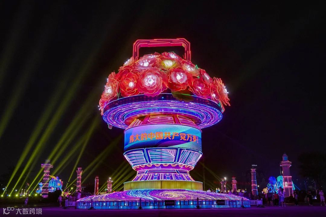 金沙滩啤酒城内,位于主入口两侧的是“哈舅迎宾”灯组,以哈舅IP、海洋、啤酒为主元素,配以流动光效,迎接宾客到来。移步进入星光大道,最显眼的当属庆典花篮灯组,以线条感、冰晶感的现代时尚手法设计而成。花篮顶部的花朵造型采用导光纱布加追光灯带,实现花瓣的动感轮廓和光效渐变的时尚氛围效果。