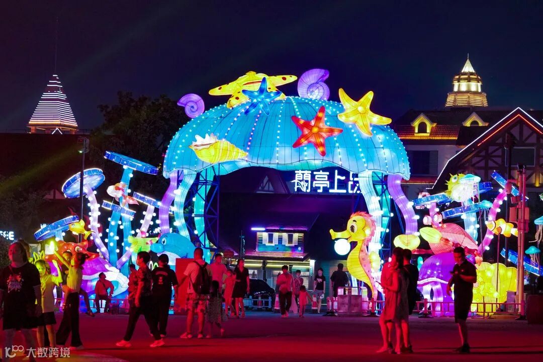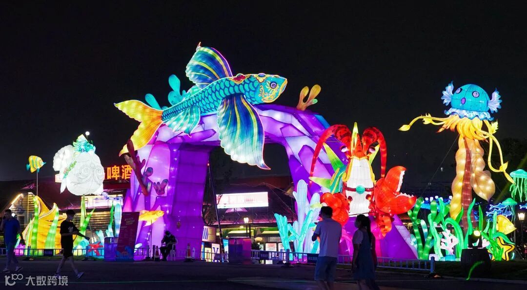 星光大道两侧,游客们被海洋灯组拱门深深吸引。北边两组以卡通造型的贝壳、水母为主元素,搭配海星、海马等元素设计而成。南边两组则以《山海经》中的“鲲”“文鳐鱼”等为主元素,设计出极具中国风的珊瑚造型彩灯拱门。