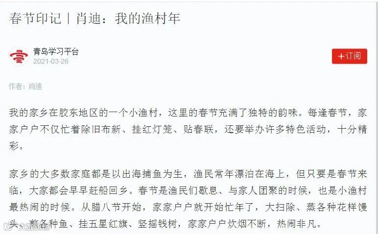 近日,在“学习强国”平台组织开展的“过年:中国人的集体记忆”征文活动中,战略规划部肖迪同志撰写的《我的渔村年》文章被刊登,通过平实质朴的语言、细腻真挚的情感,记忆新春,记忆亲情。