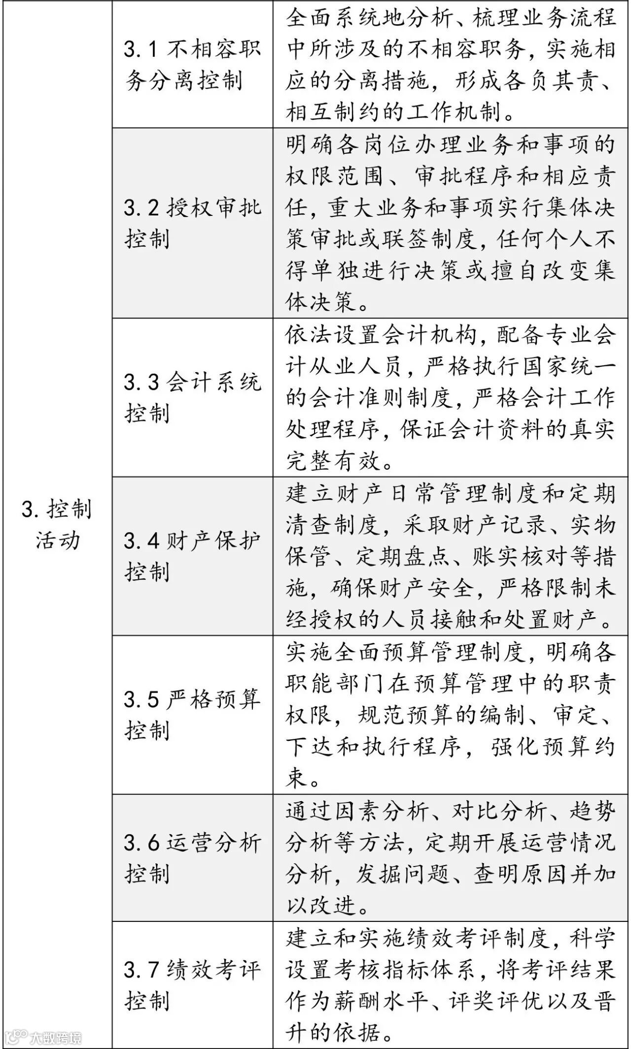 控制活动。内部控制的重要手段,根据风险评估结果和风险应对策略,采用相关的控制方法和措施,将风险控制在可承受范围之内,主要包括职责分工控制、授权审核批准控制、资产安全控制、会计系统控制、预算控制、内部信息报告控制、业绩评价控制等。