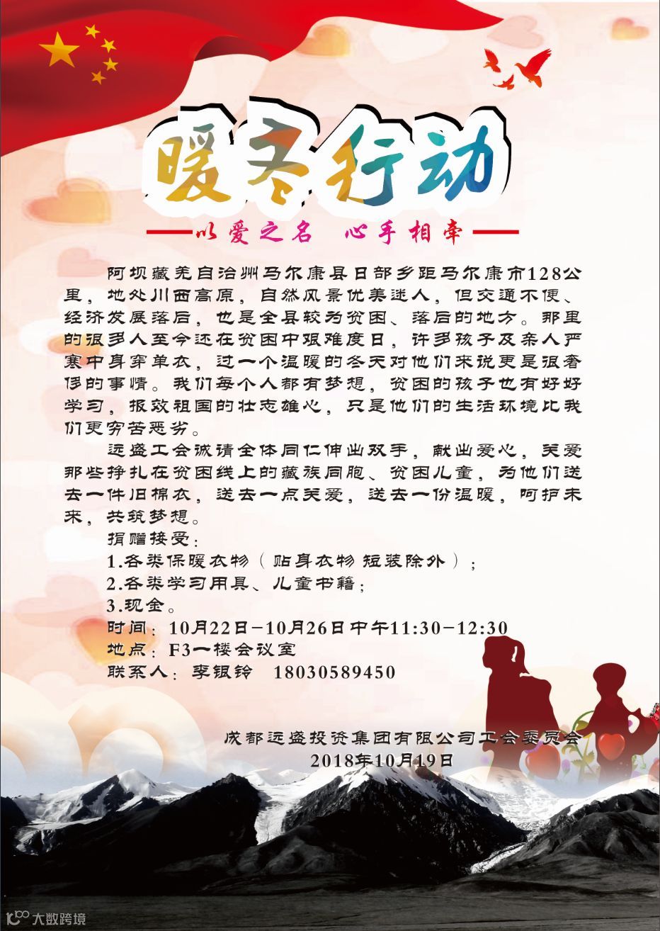 导读:以爱之名 心手相牵远盛集团组织开展暖冬行动,为阿坝藏羌自治州马尔康市日部乡开展募捐活动,欢迎广大员工同志伸出