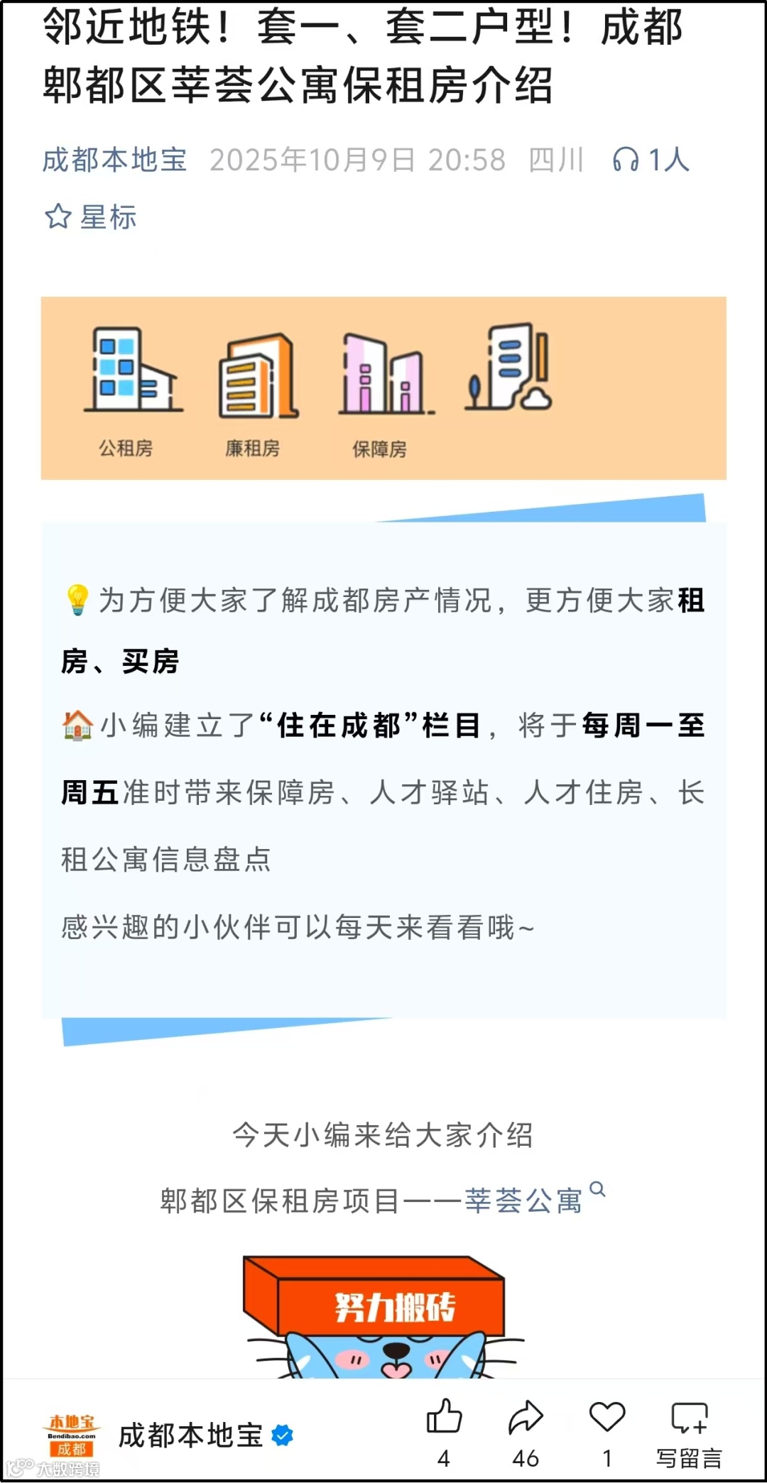 线上宣传生态升级:在抖音、小红书平台推出系列短视频,真实展现租住生活;联合天府住房通、成都本地宝、成都住建公众号打造 “保租房申请指南” 专题内容,为目标客群提供精准指引。