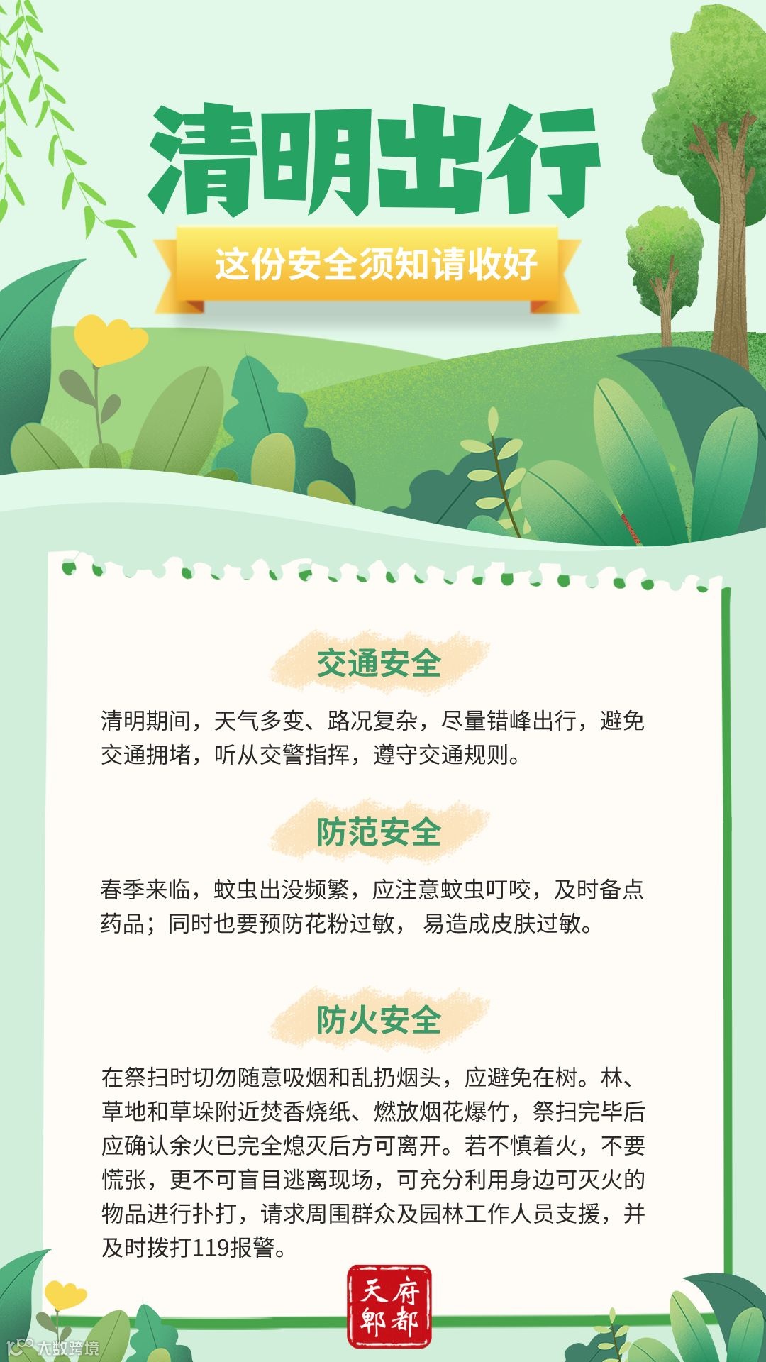 4、清明节假日外出时,请检查家中电源、燃气,清理阳台楼道杂物,做好“三清三关”;家长要教育孩子不玩火,维护家庭防火安全。