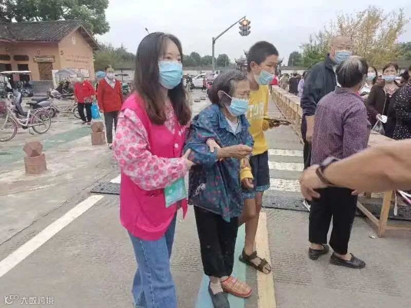 关卡二:由年纪稍大的巾帼志愿者,变身为一个个流动场所码,引导宣传进入核酸点位居民扫码测温戴口罩;
