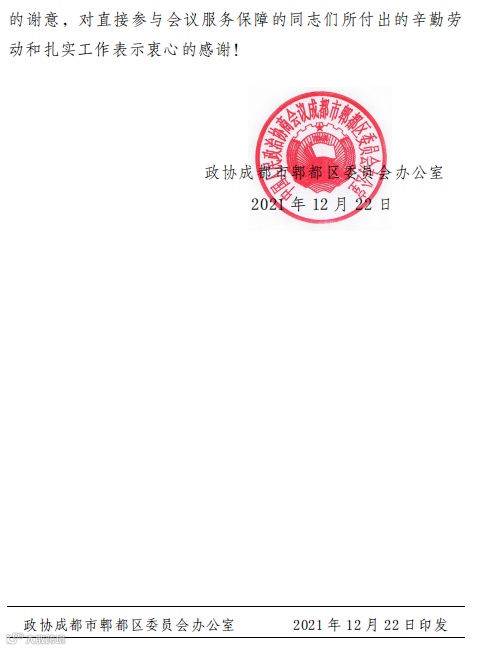 近日,西盛集团收到区政协发来的《感谢信》,来信表示在疫情防控和社会经济发展的关键时期,对德冠物业为保障郫都区政协第十一届第一次会议召开所承担的各项目服务保障工作,给予了高度肯定和认可。