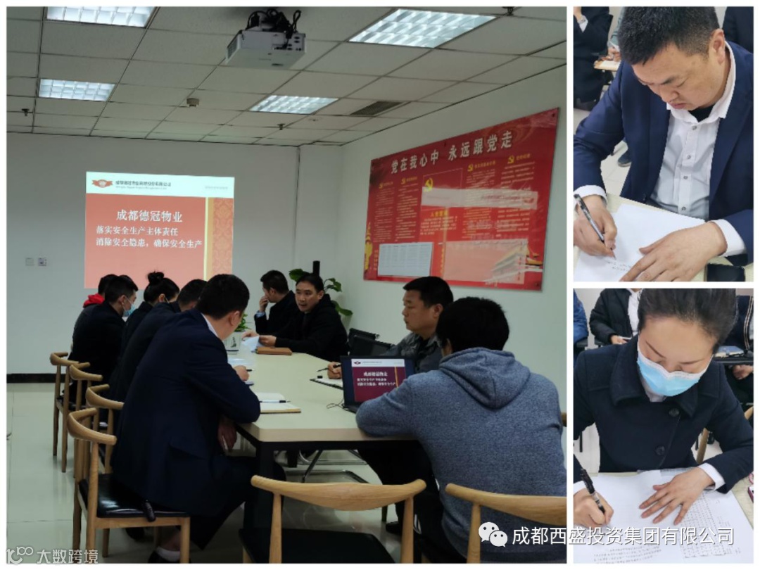 为加强公司安全生产管理工作,预防和杜绝安全隐患,确保人身、财产安全,认真贯彻“安全第一、预防为主”的方针,执行“谁主管、谁负责”的原则,4月9日,西盛集团下属德冠物业召集项目负责人签订《安全生产责任书》,责任书的签订明确了项目负责人的安全主体责任,使其认识到安全生产的重要性,督促项目人员加强日常隐患排查、整改工作,实现“消除安全隐患,确保安全生产”的目标。