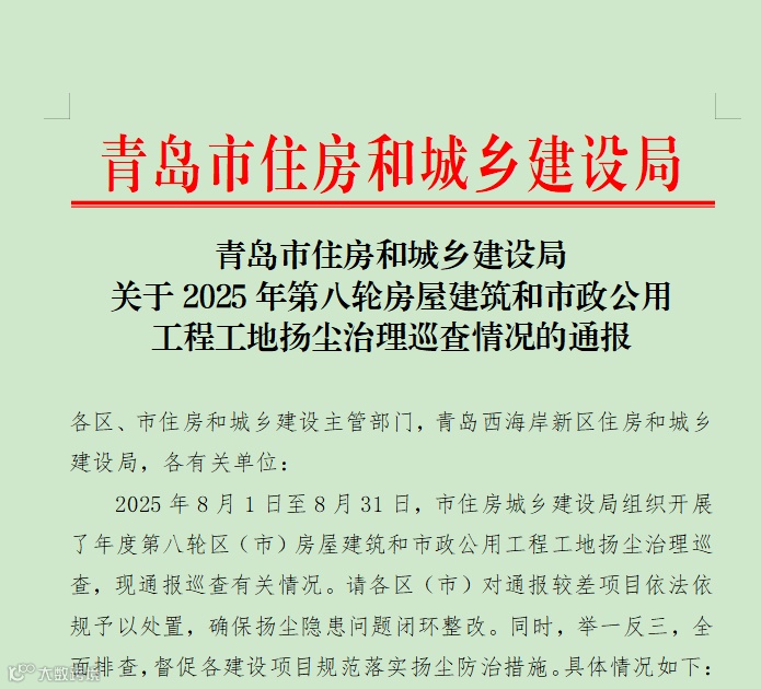 近日,青岛市住房和城乡建设局对2025年第八轮房屋建筑与市政公用工程工地扬尘治理巡查情况进行了通报,对在扬尘防治工作中表现突出的一批项目工地及相关单位予以通报表扬。高投集团建设项目荣登市级扬尘治理“光荣榜”。