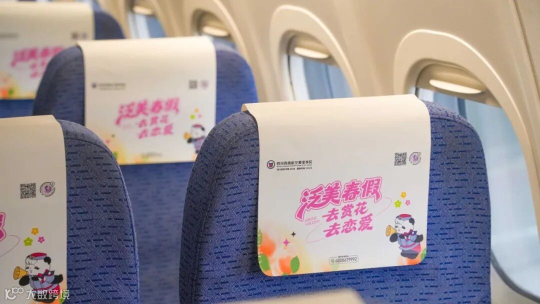 而承载这份理念的“泛美号”本身,就是一件飞行的国潮艺术品。机身最吸睛的卡通形象“熊非熊”,将憨态熊猫与锐气哪吒巧妙融合,既承载四川本土文化符号,也彰显泛美学子的朝气与闯劲。机身外部还融入了泛美教育集团的标识与教育理念;步入客舱,“去赏花,去恋爱”的主题海报与春假元素装饰随处可见,这架满载巧思的主题飞机,正是泛美教育理念最生动的空中表达,也是这场春日之约最特别的舞台。