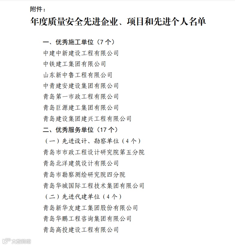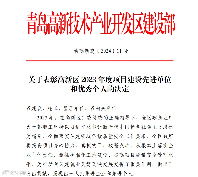 2月6日,高新区建设部印发了《关于表彰高新区 2023 年度项目建设先进单位和优秀个人的决定》(青高新建〔2024〕11 号),其中青岛高投建设工程有限公司荣获“先进代建单位”称号,公司代建的高新区华东路小学、高新区锦安路(瑞源路至祥源路)道路及综合配套工程、高新区田海路(丰和路至规划十八号线)道路及综合配套工程荣获“优质建设项目”称号,集团副总经理李林、建设公司员工韩赫荣获“项目代建先进个人”称号。