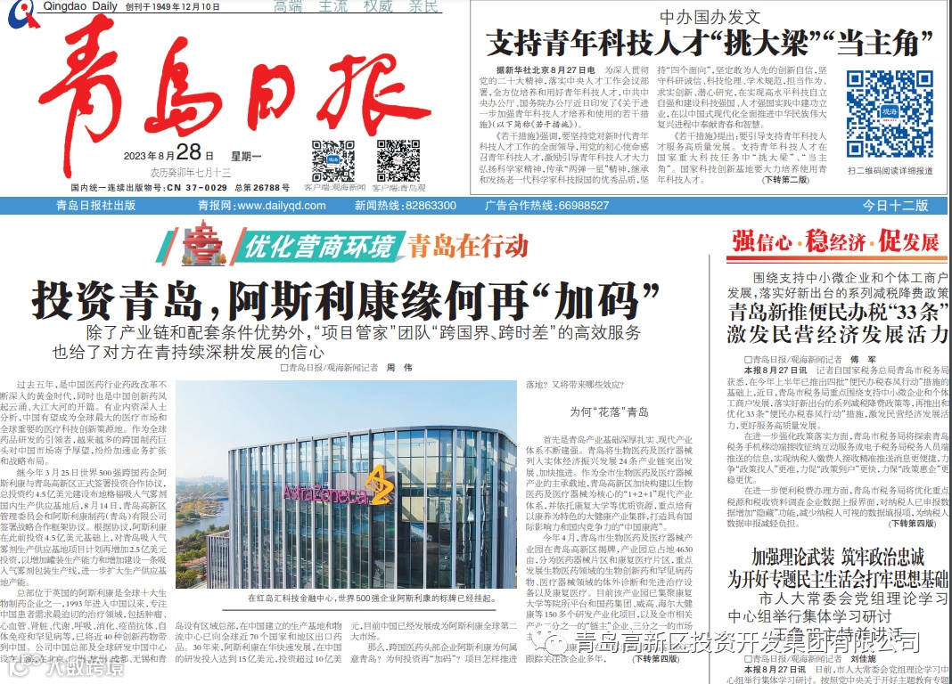 根据8月14日签署的战略合作框架协议,阿斯利康在此前投资4.5亿美元基础上,对青岛吸入气雾剂生产供应基地项目计划再增加2.5亿美元投资。除了项目的落地及扩能,阿斯利康还在创新生态、创新园区、产业基金等方面与青岛高新区深入合作。通过以青岛区域总部布局为基础,在青岛设立贸易公司,开展多方面合作,推动青岛在加快产业创新、培育创新生态等方面实现新突破。同时挂牌成立“青岛-阿斯利康罕见病国际创新研究中心”,联动产、学、研、医、投合作伙伴,构建区域罕见病诊疗创新生态圈,助力青岛打造全国领先的罕见病诊疗中心和医学高地。